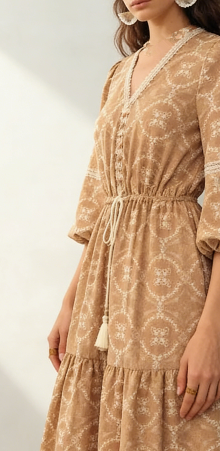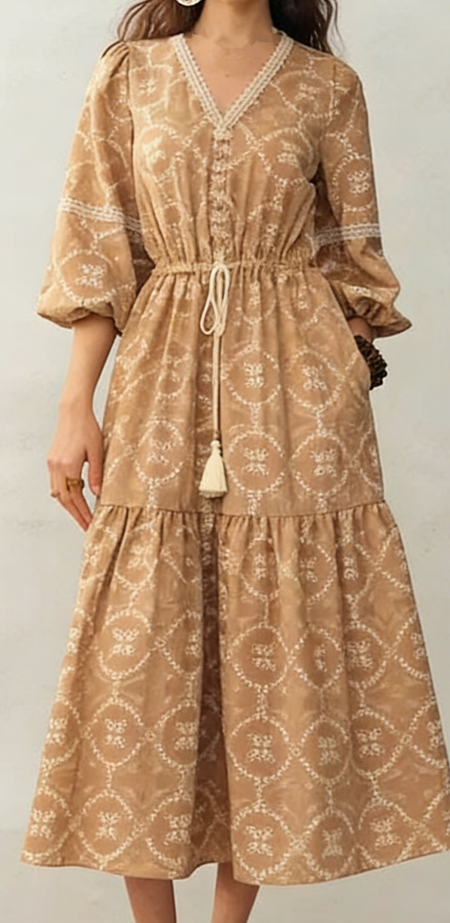 Product Title (适合欧美独立站) Tan Geometric Print Midi D…