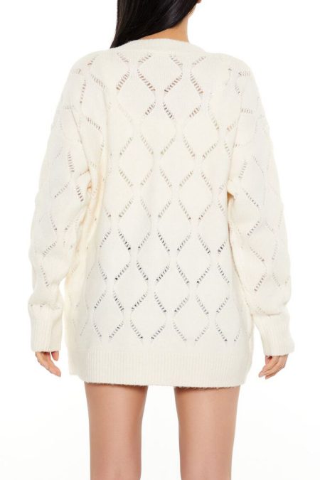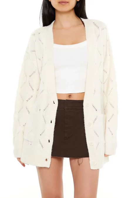 Details A Pointelle knit cardigan sweater featuring button-front closures, long sleeves, ribbed trim, and front patch pockets. Content + Care – 63% polyester, 33% acrylic, 4% spandex – Hand wash cold Size + Fit – Model is 5’6″ and wearing a Small