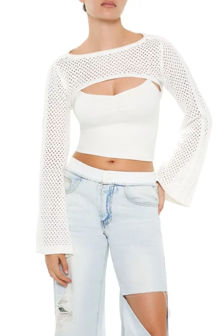 Details A crochet shrug sweater featuring a high neckline, long bell sleeves, contrasting trim, and sheer netted construction. Content + Care – 100% cotton – Hand wash cold Size + Fit – Model is 5’8″ and wearing a Small
