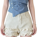 Add a romantic, coquette touch to your warm-weather wardrobe with these beige high-waisted ruffle denim shorts. Crafted from soft lightweight denim with a faded beige wash, they feature a high-rise fit and double ruffle hem. Perfect for casual outings or date nights, pair them with a one-shoulder striped top and sandals for a sweet summer outfit, or with a cropped knit sweater and ankle boots for a cozy spring vibe. These shorts are a versatile staple that combines comfort, charm, and nostalgic style.