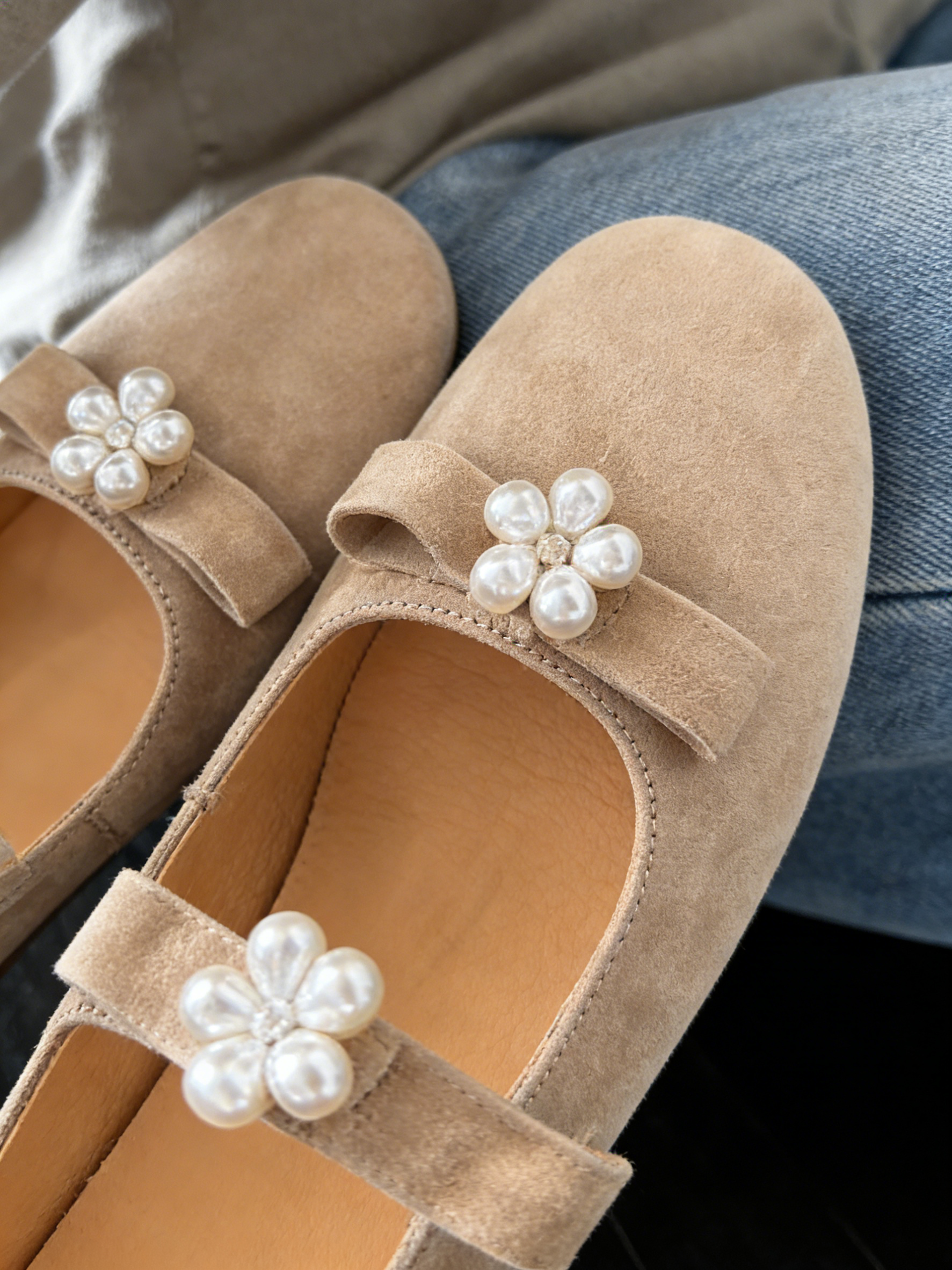 Printing Method: No printing; aesthetic relies on suede texture and pearl embellishments