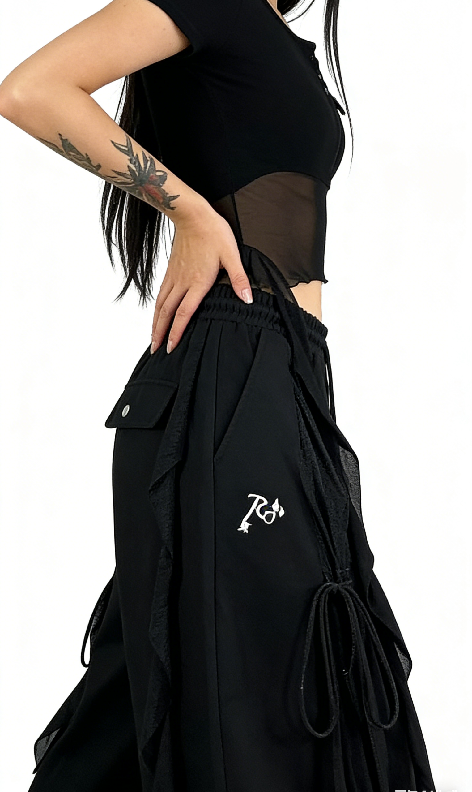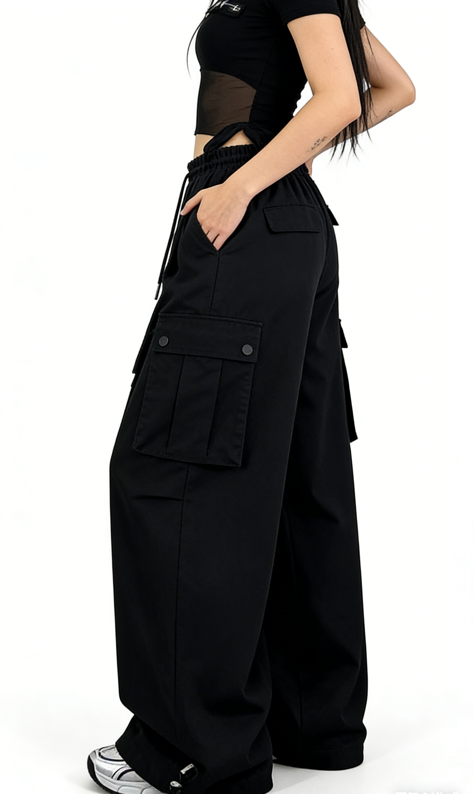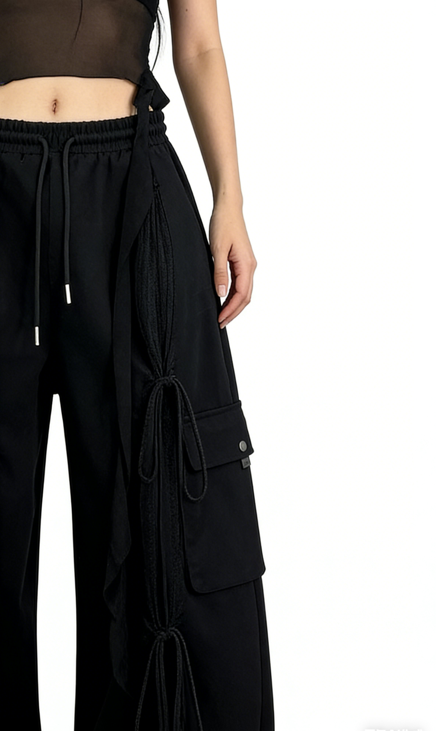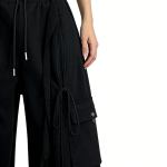 Add an edgy, Y2K-inspired touch to your wardrobe with these black drawstring cargo wide-leg pants. Crafted from smooth woven fabric, they feature an oversized wide-leg silhouette, lace-up side detailing, and a utility cargo pocket. Perfect for streetwear or edgy casual looks, pair them with a sheer cropped top and platform boots for a complete Y2K outfit, or with a band tee and combat boots for a punk-inspired vibe. These pants are a versatile staple that combines comfort, utility, and bold, timeless style.