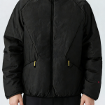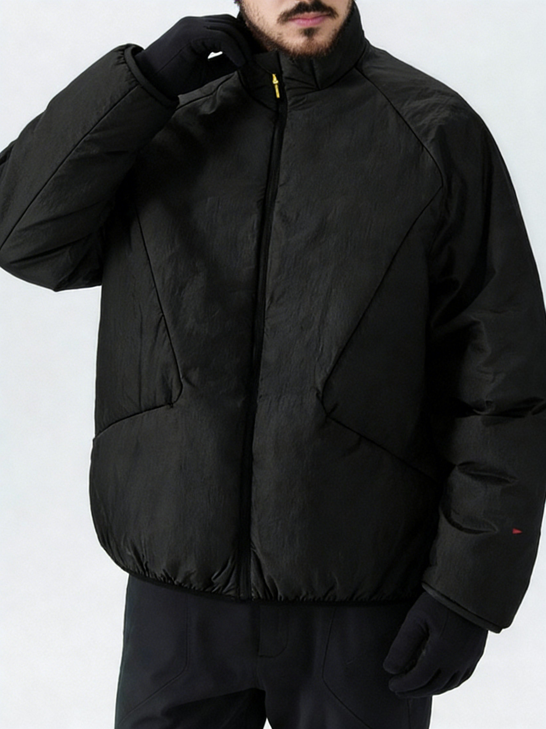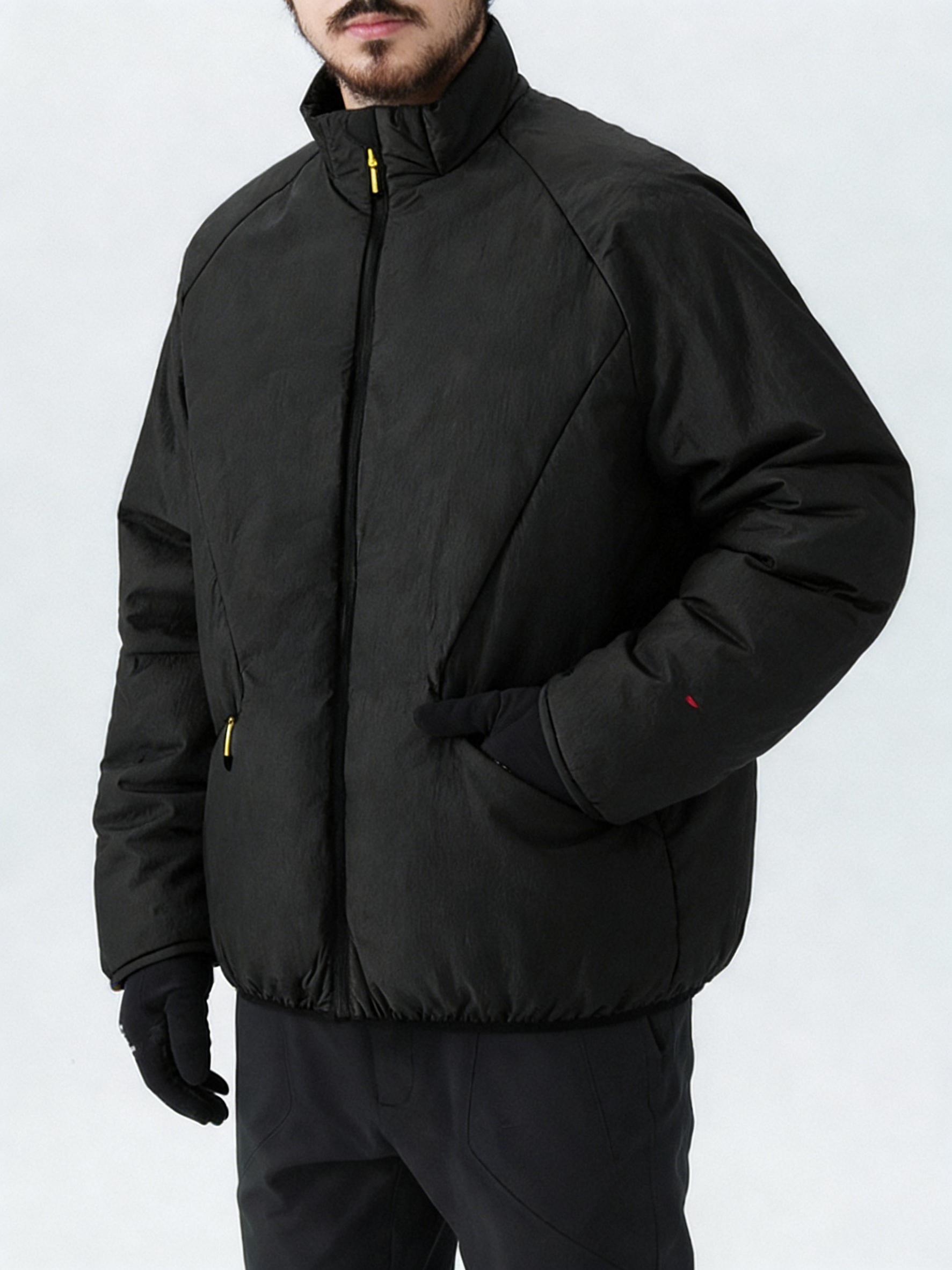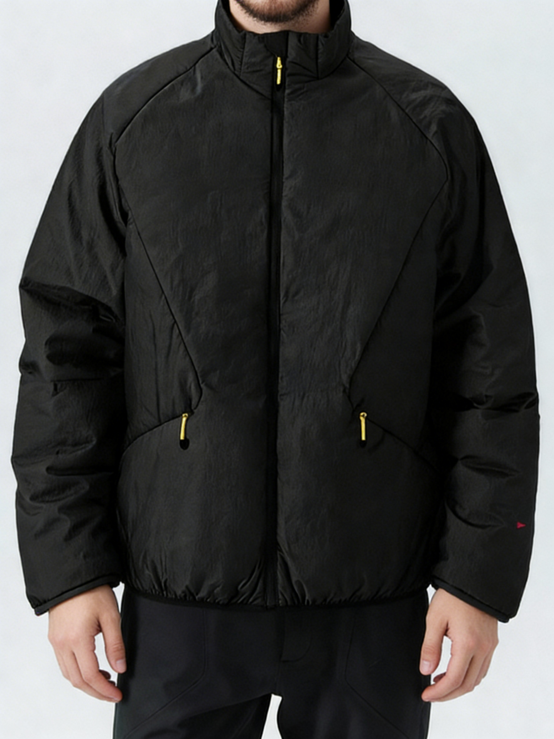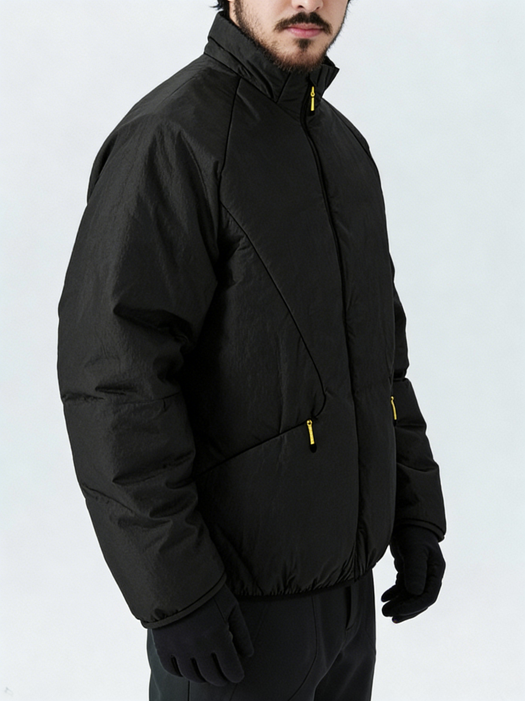 Technics: Stand collar, front zipper closure, side zipper pockets, elasticated hem