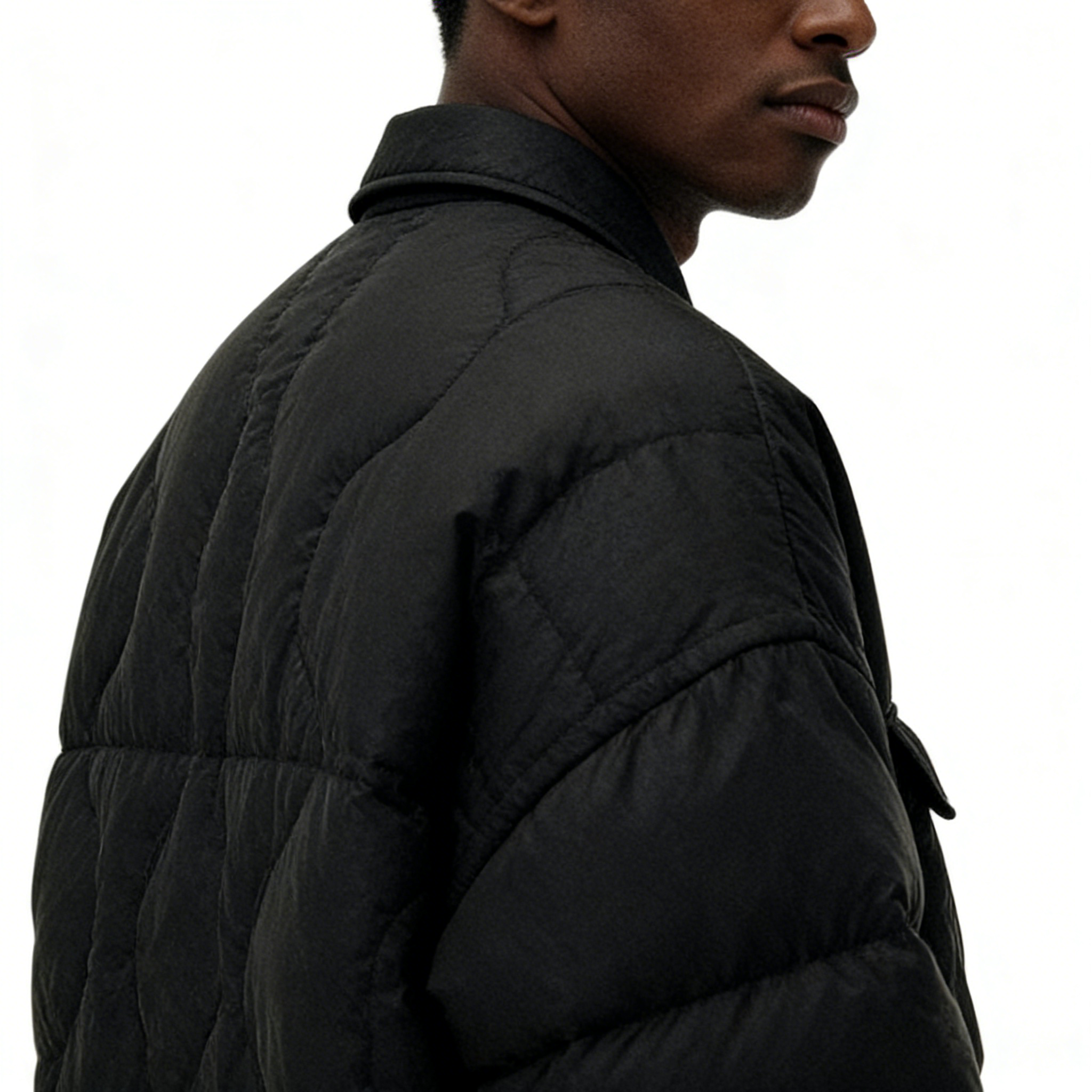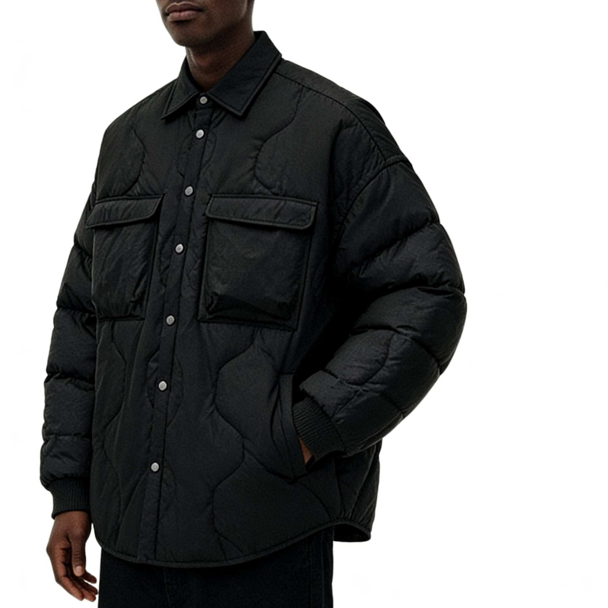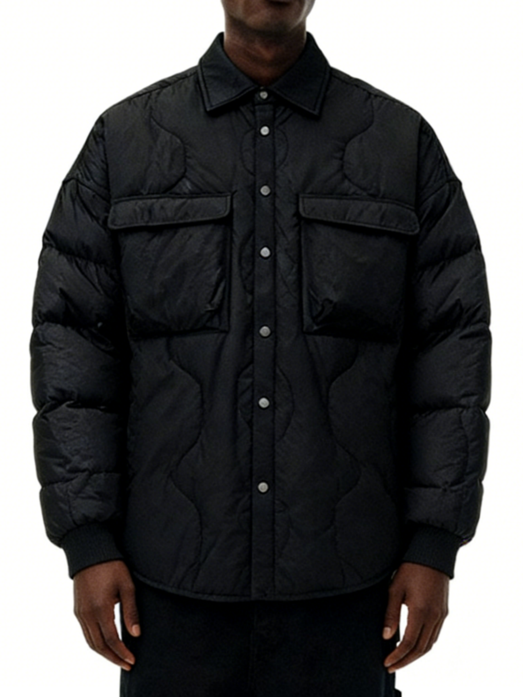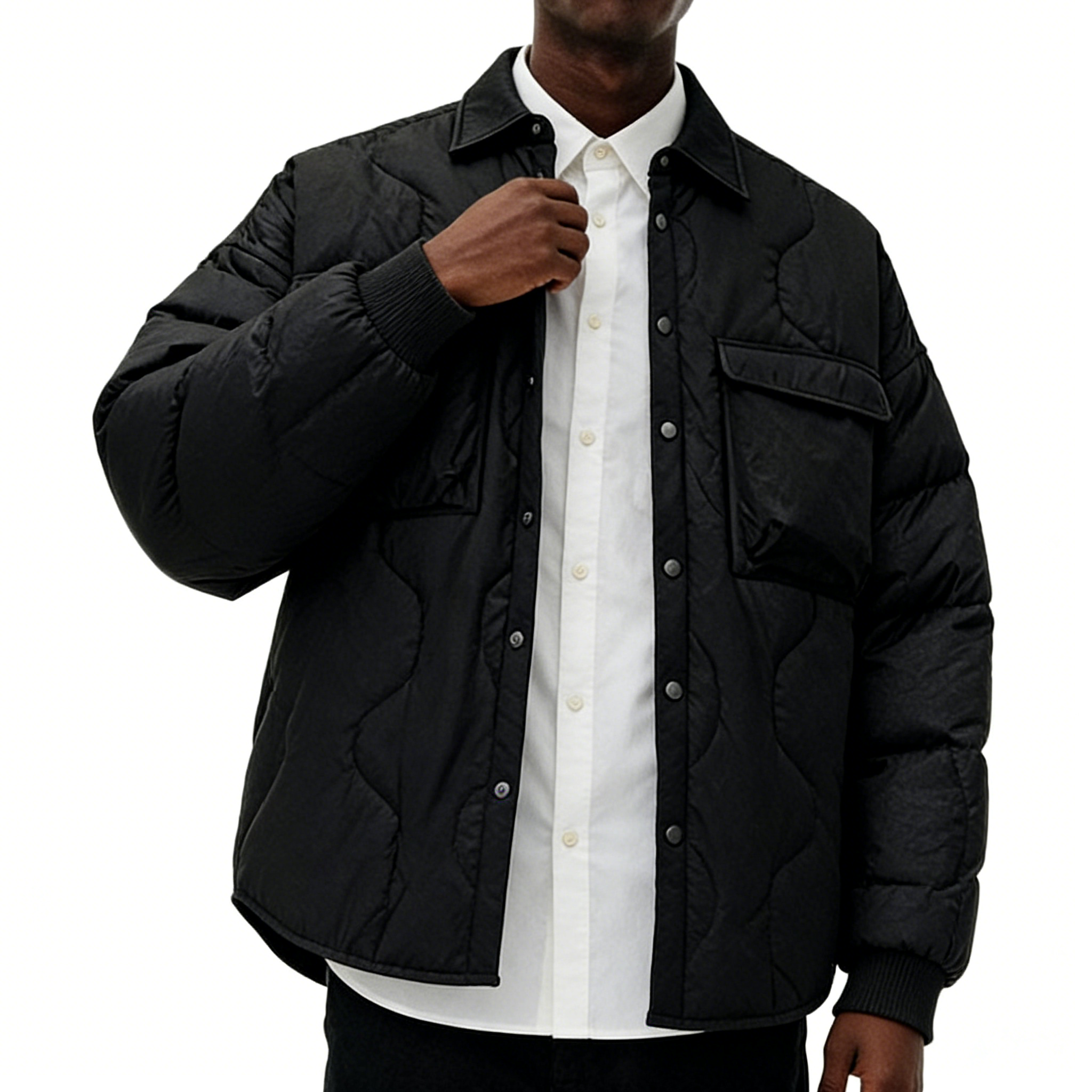 Technics: Wave-quilted construction, shirt collar, snap button closure, chest flap pockets, ribbed cuffs