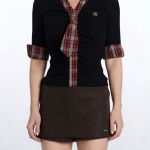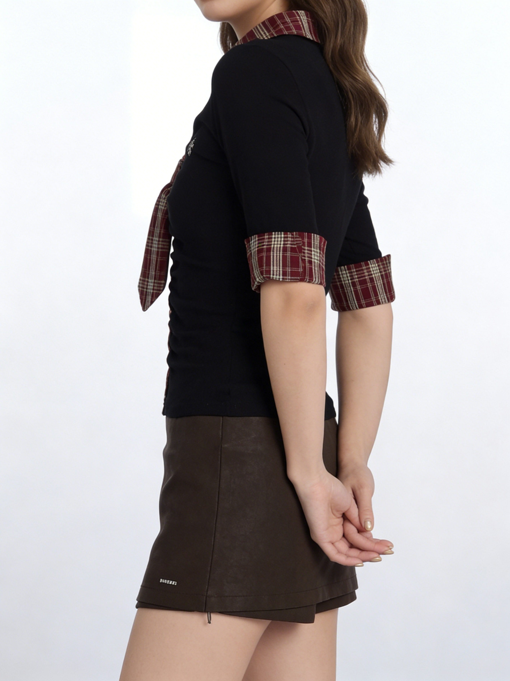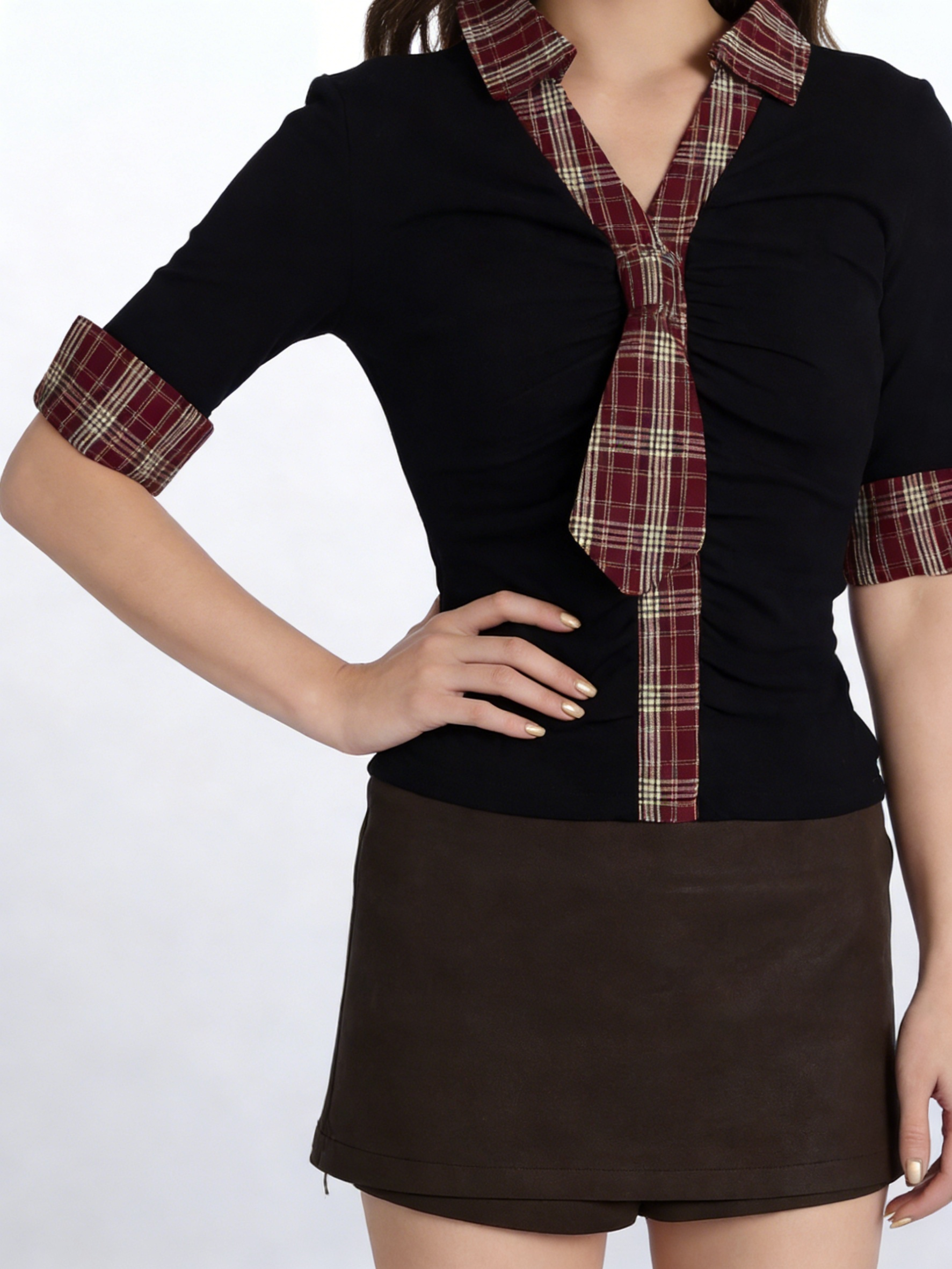 Craftsmanship Technology: V-neckline with ruched front detail, detachable plaid necktie, contrast plaid collar and cuffs, half-sleeve construction, mini metal emblem, slim-fit silhouette, precision stitching