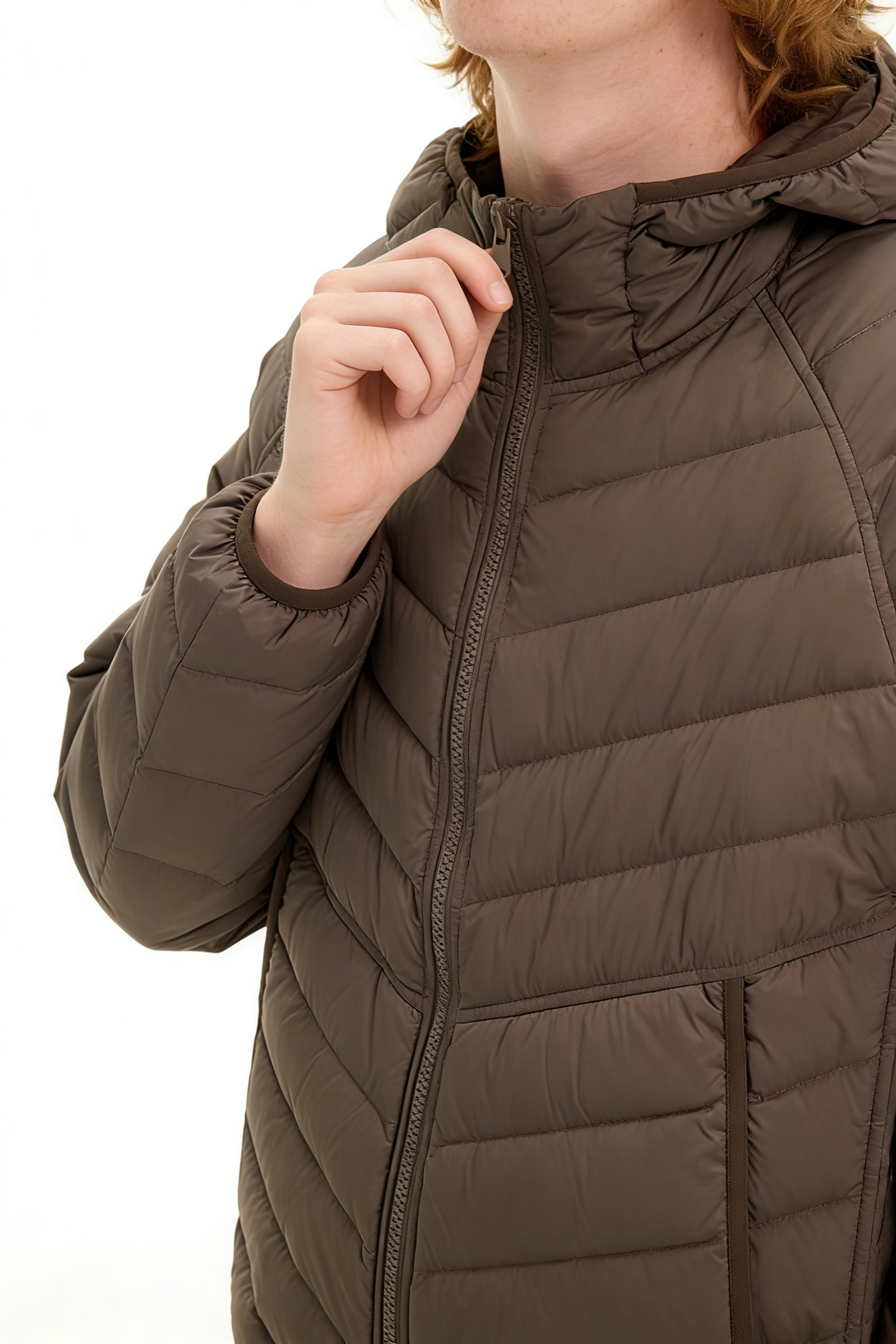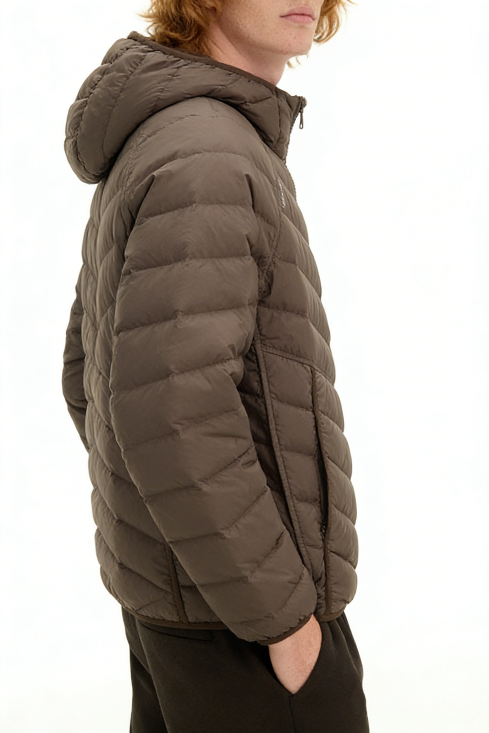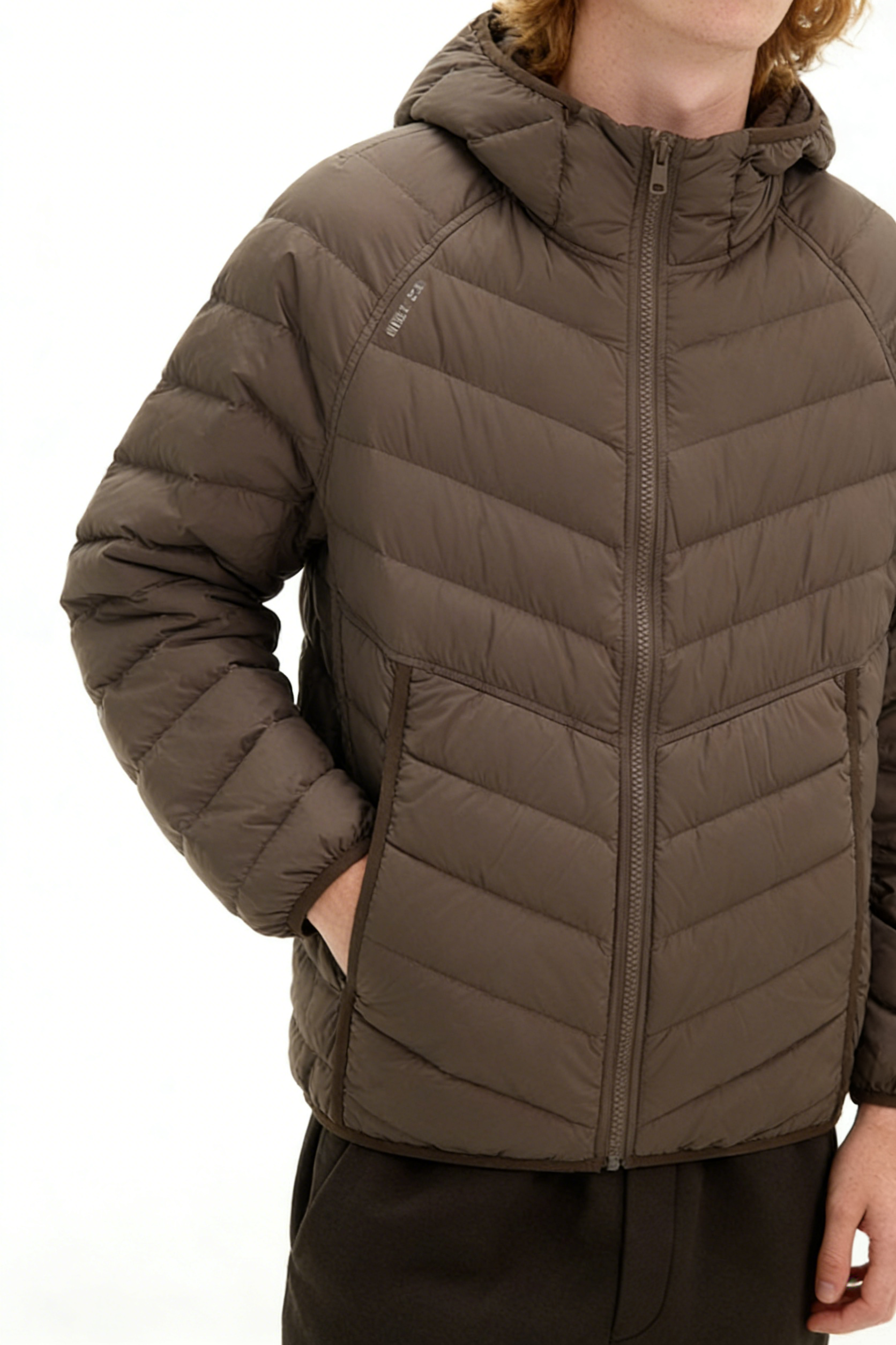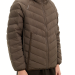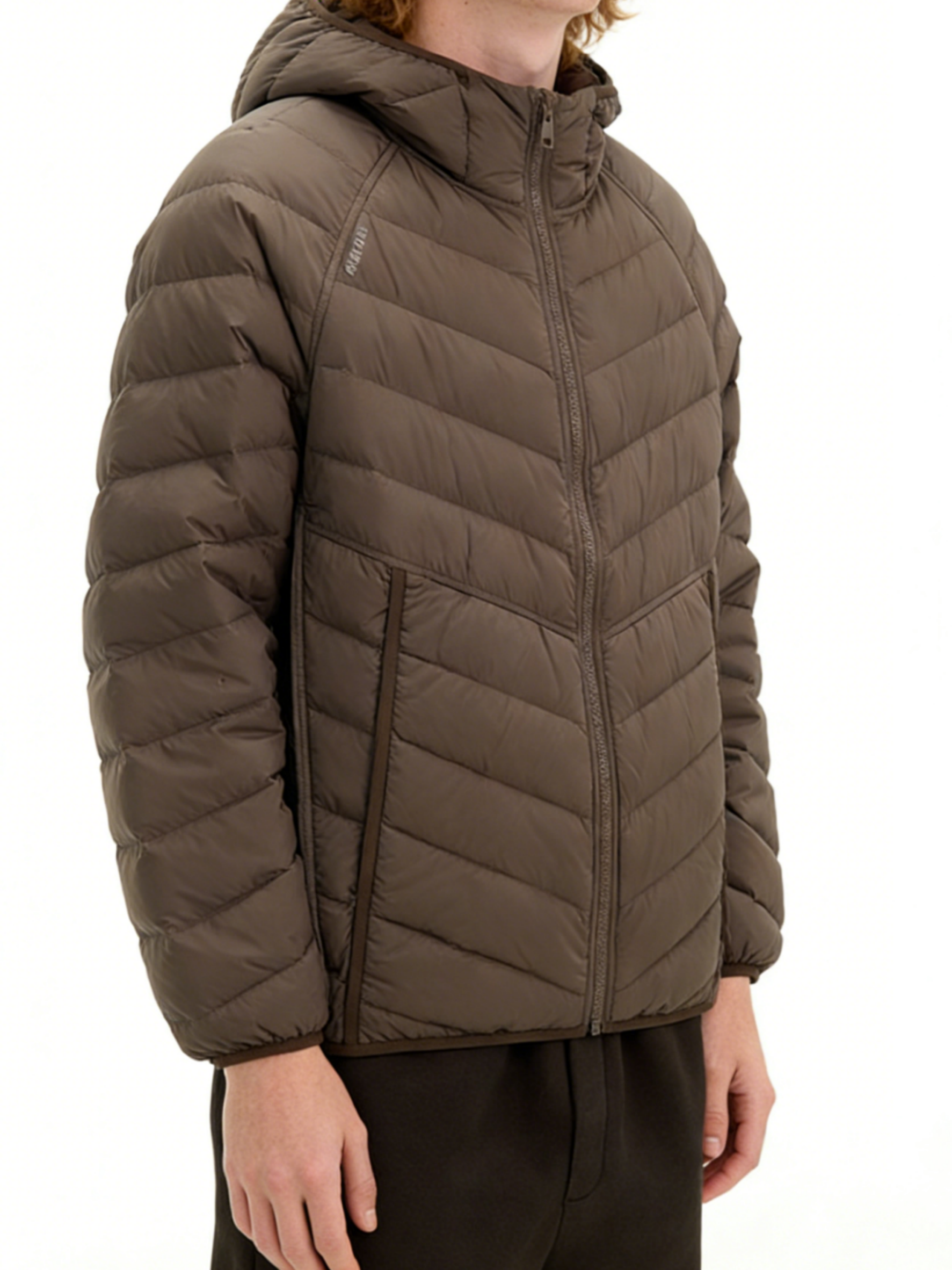 Technics: Chevron-quilted construction, hooded design, front zipper closure, side pockets, elasticated cuffs