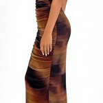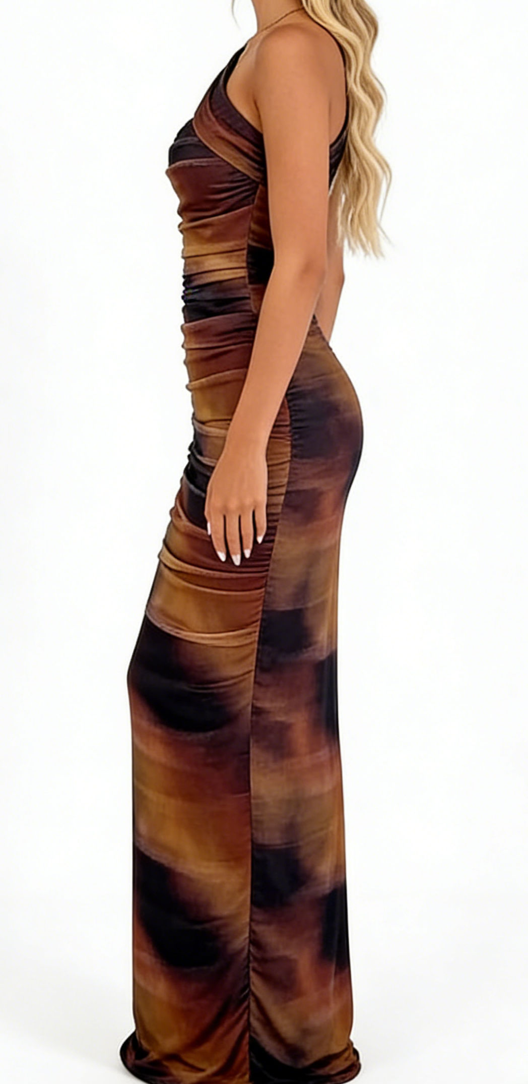 - Craftsmanship Technology: One-shoulder asymmetric neckline, single long sheer sleeve, full-body ruched detailing, bodycon silhouette, midi-length hem, ombre gradient print