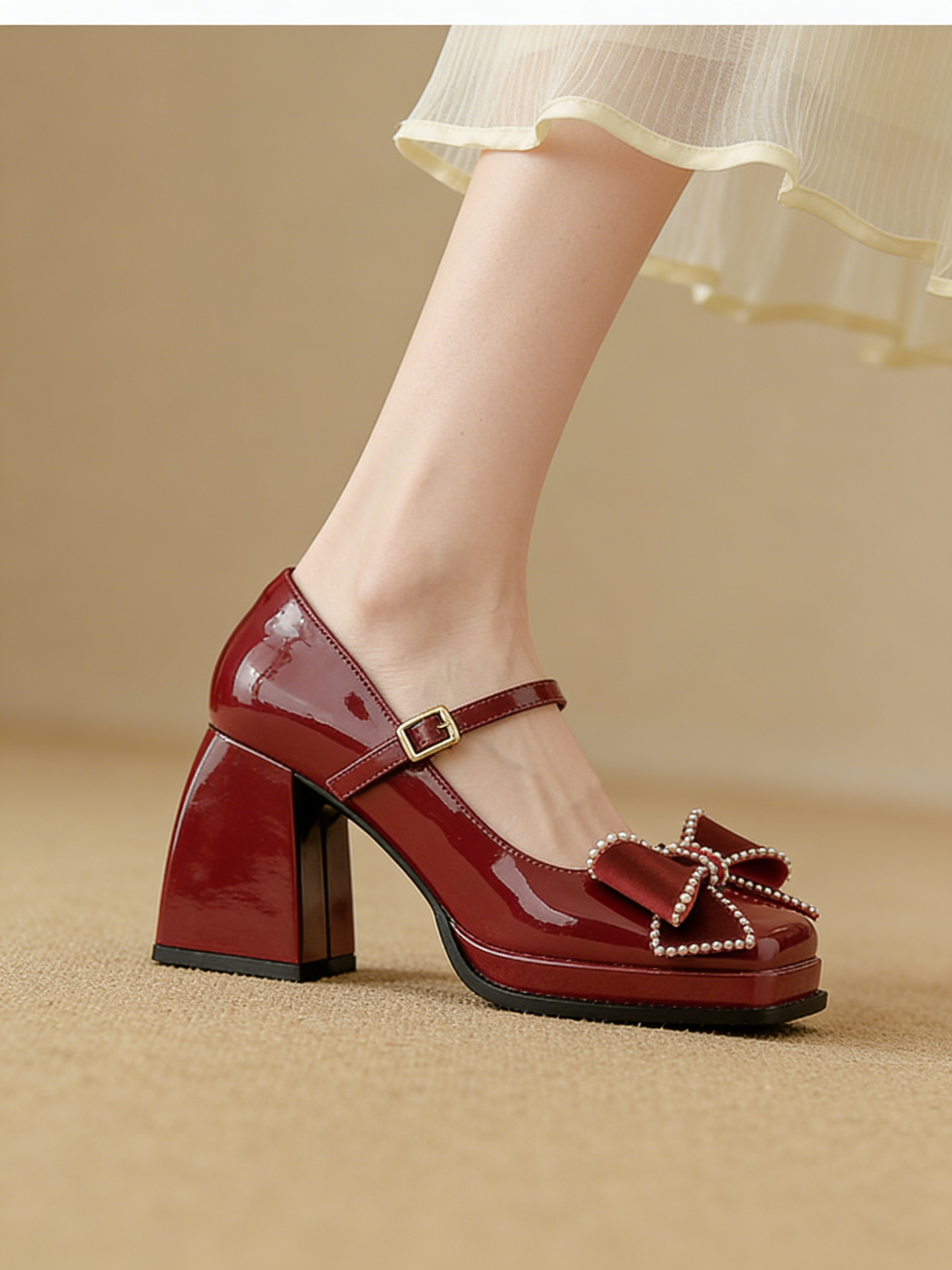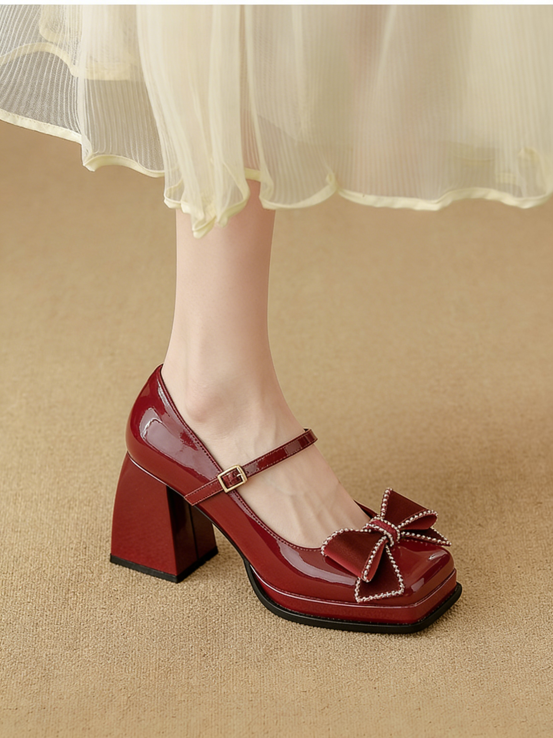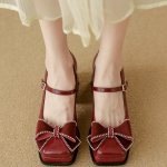 Craftsmanship Technology: Square-toe construction, adjustable Mary Jane strap with metal buckle, rhinestone-embellished satin bow at toe, block heel with platform, non-slip rubber outsole, reinforced toe cap