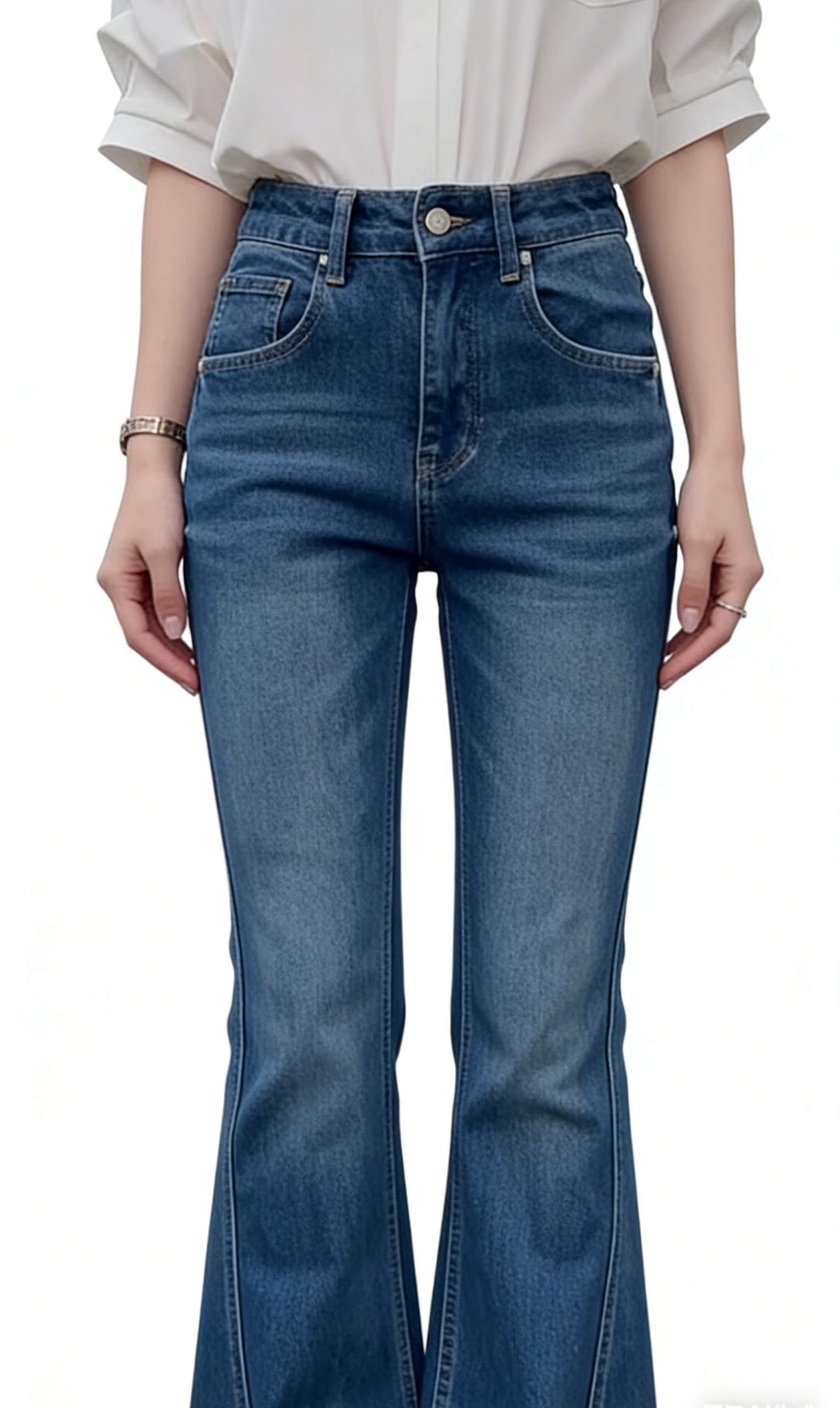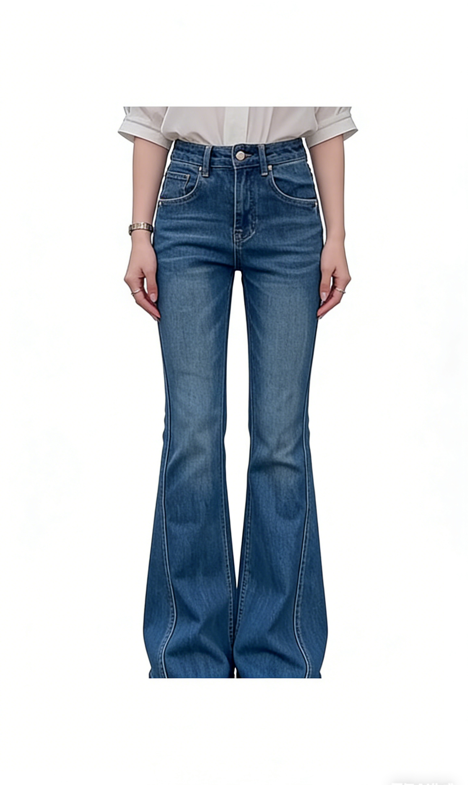 - Flared Leg Silhouette: Classic bell-bottom cut that widens from the knee down for a retro silhouette