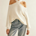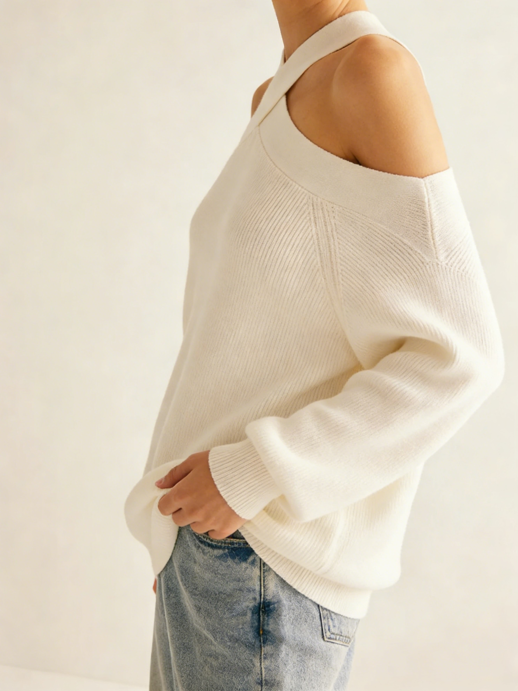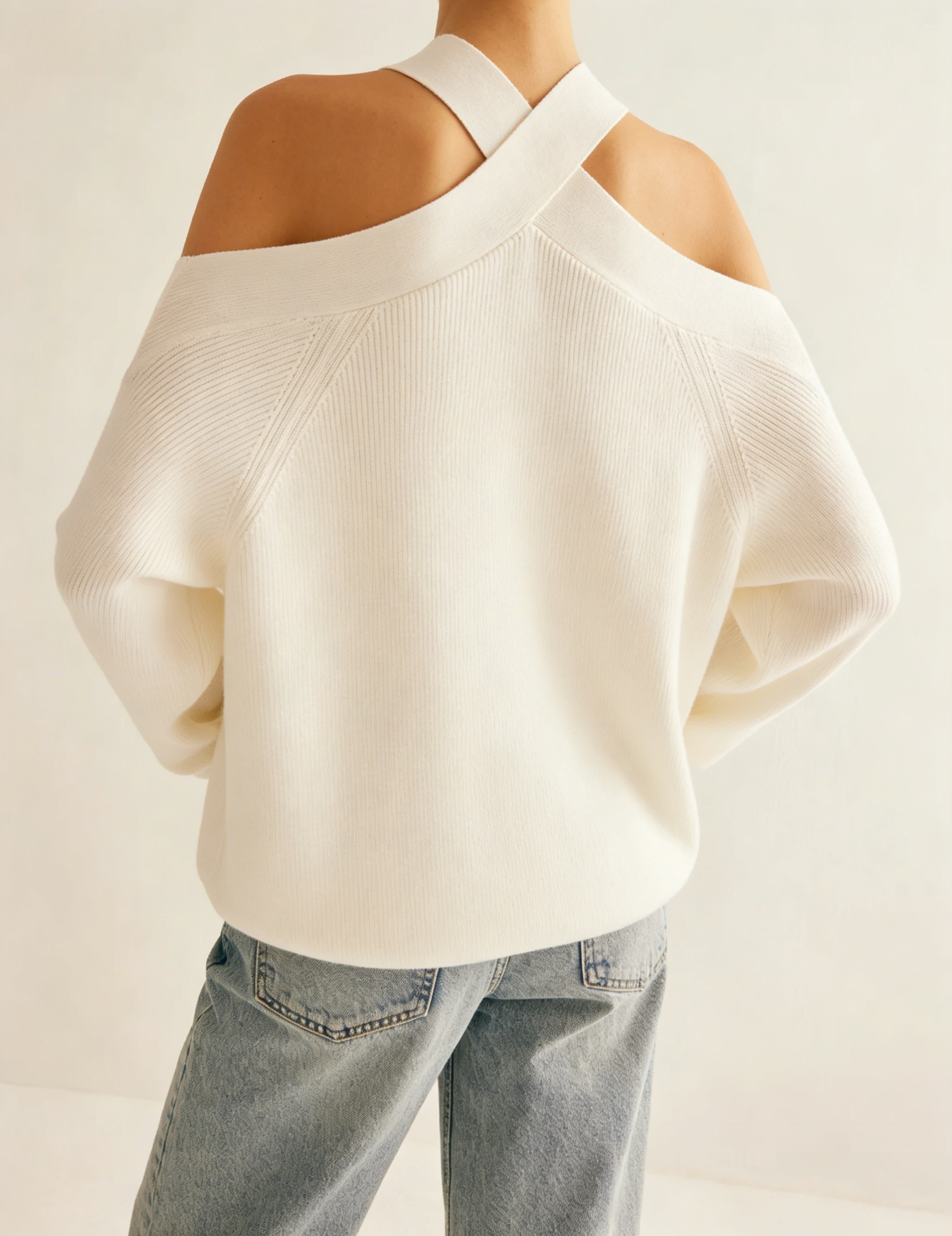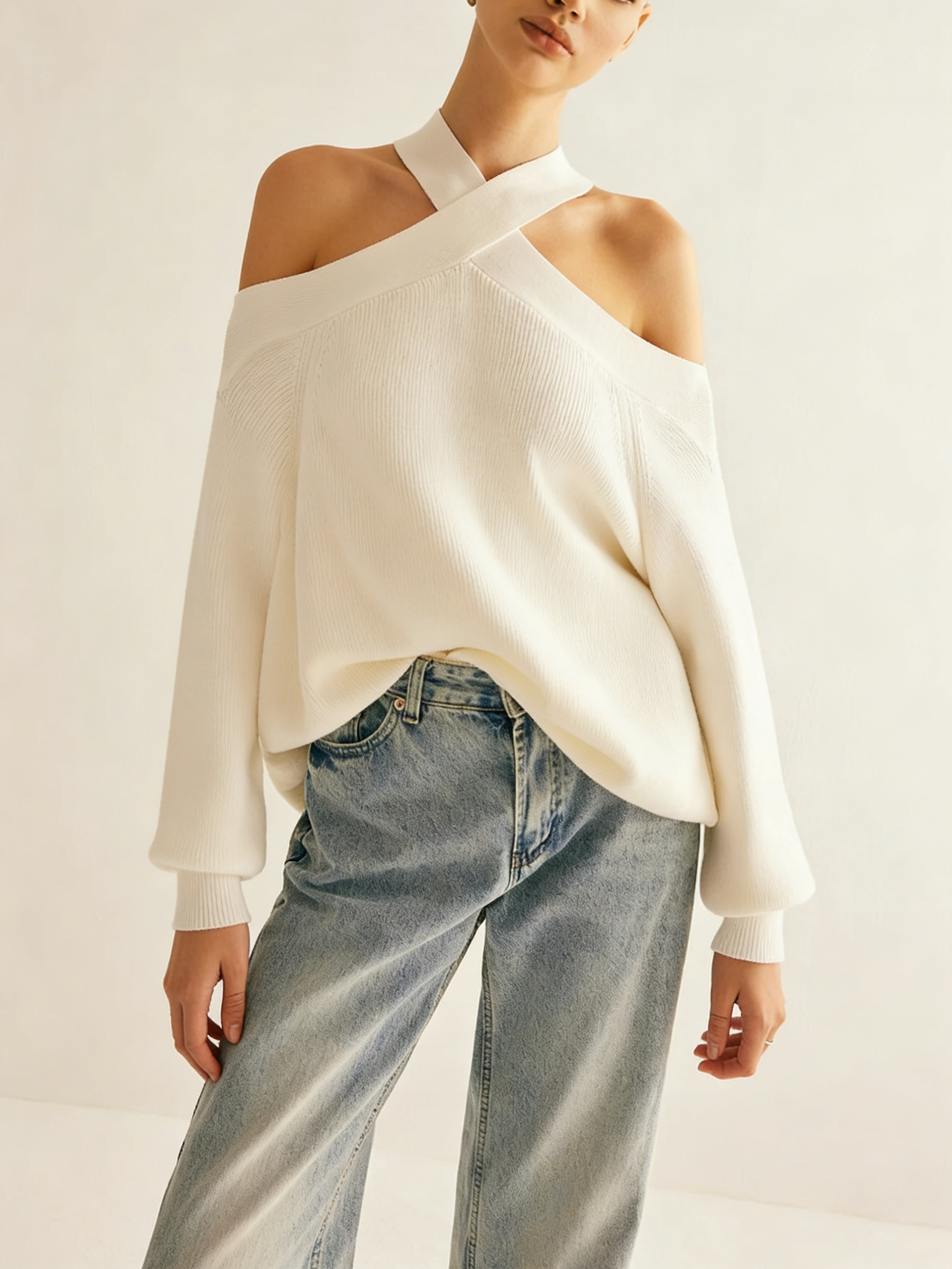Craftsmanship Technology: Cross halter off-shoulder construction, oversized relaxed silhouette, ribbed cuffs and hem, precision stitching