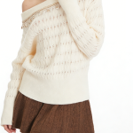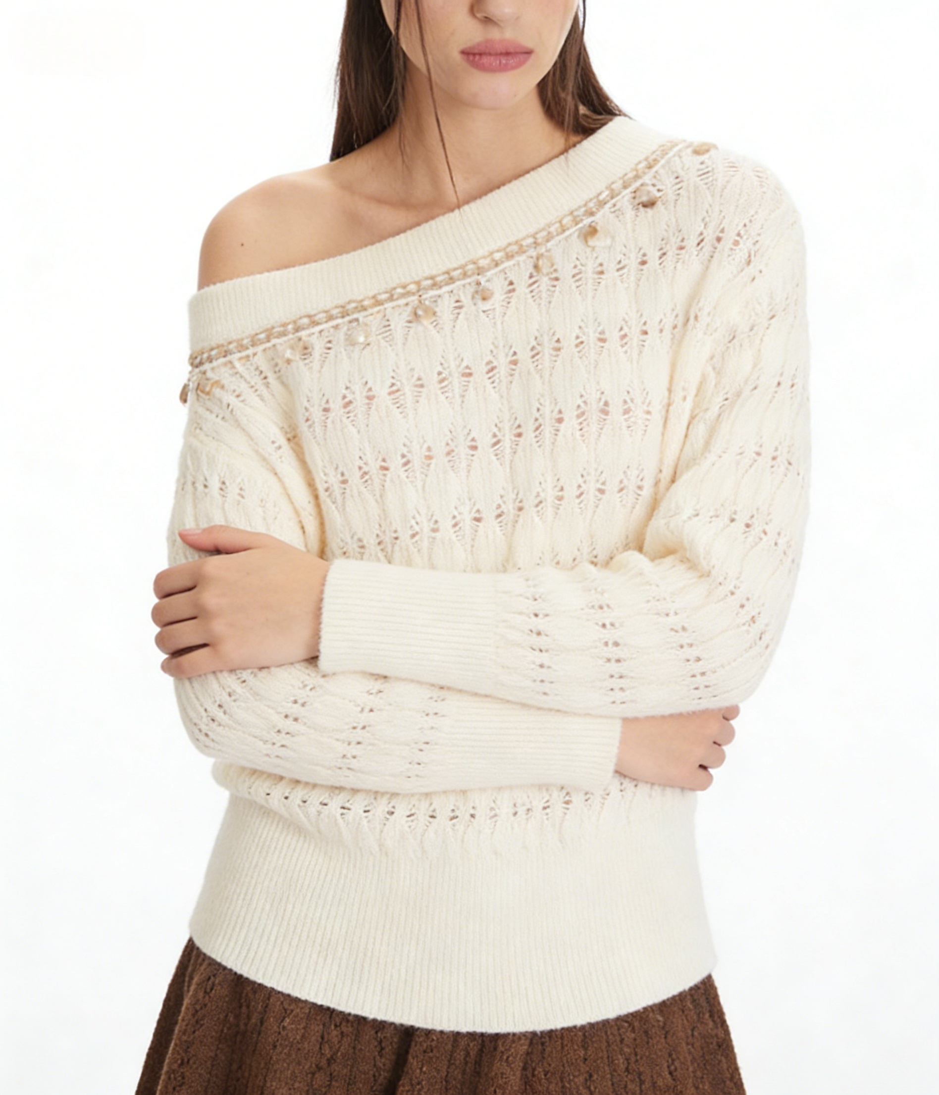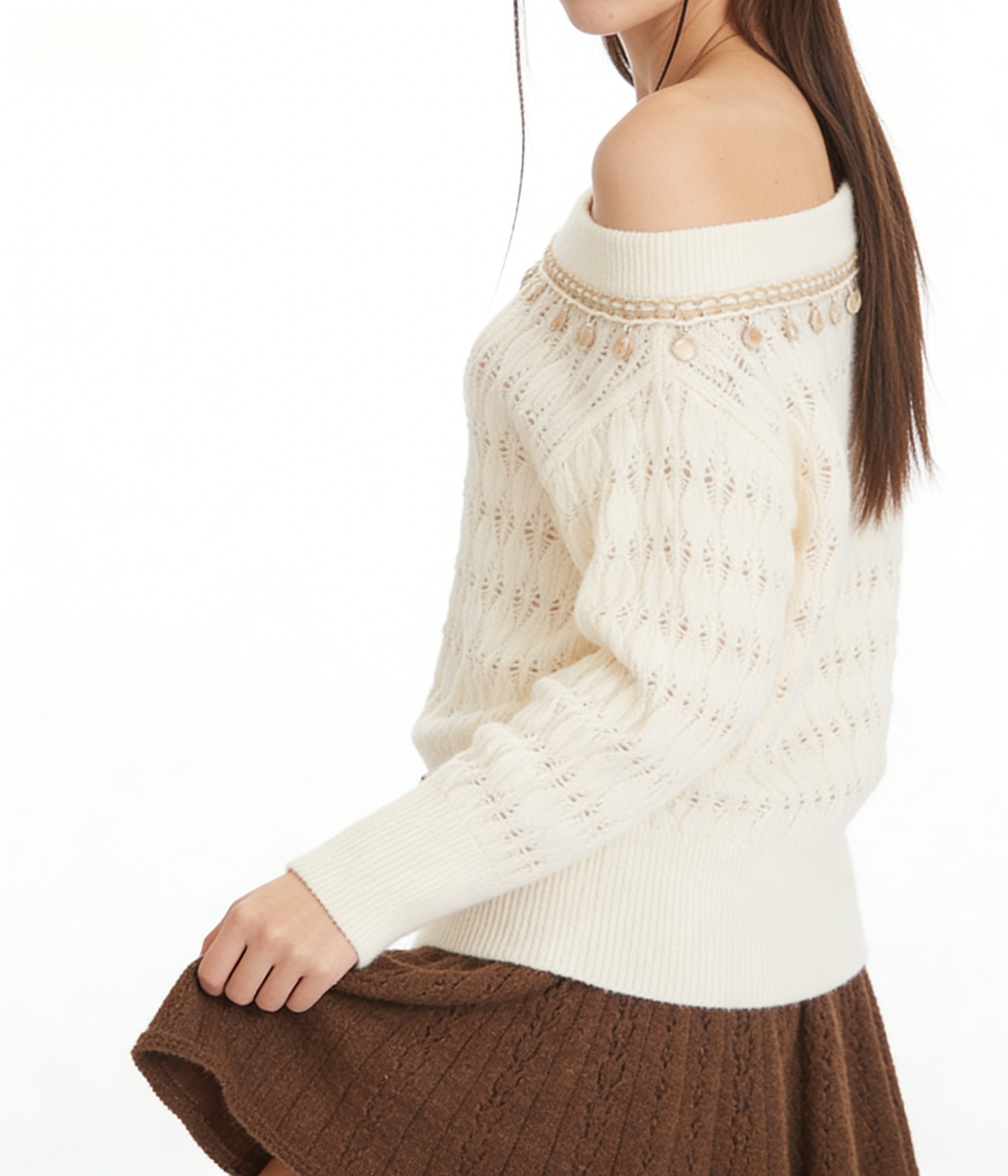 Craftsmanship Technology: Asymmetric off-shoulder neckline with metal button trim, all-over openwork knit pattern, relaxed oversized upper body with fitted ribbed hem, ribbed cuffs, precision stitching