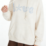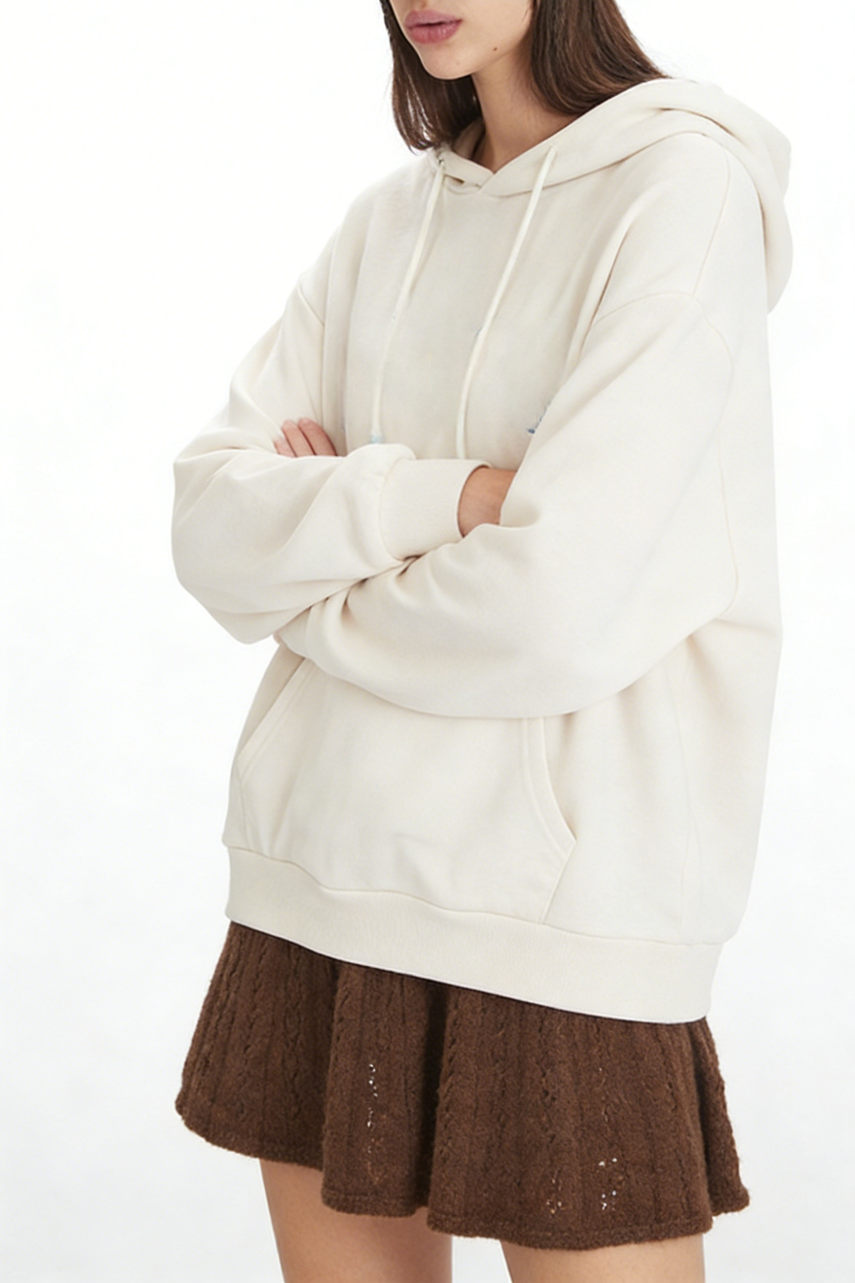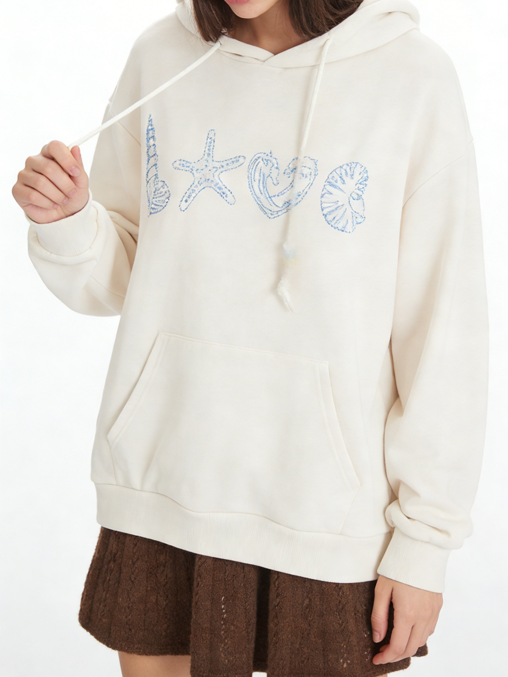 Cream Oversized Hoodie With Blue Marine Life Embroidery (Shell, Starfish, Heart Shell, Coral)