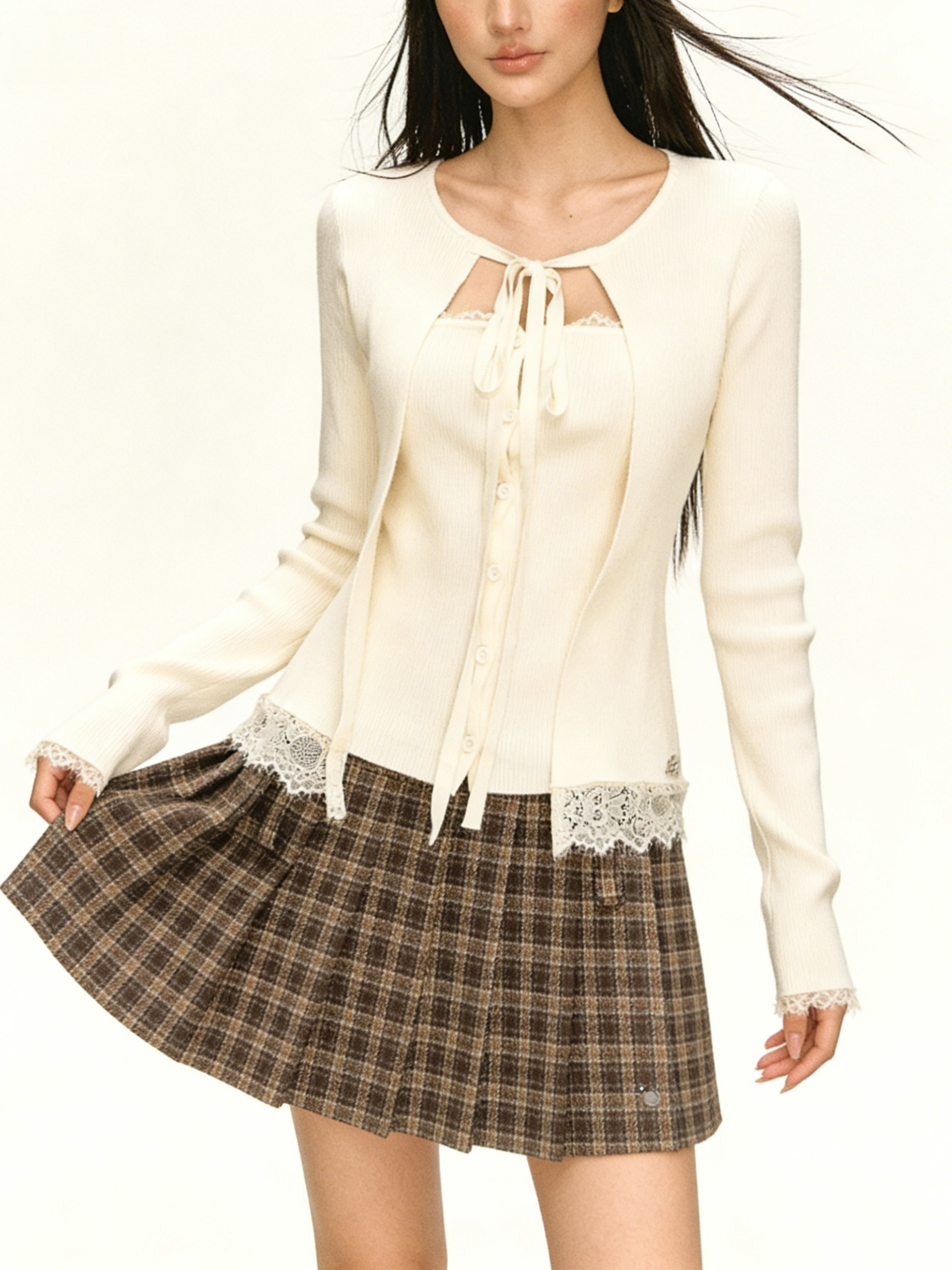 Craftsmanship Technology: Neckline cutout with self-tie detail, lace trim on hem and cuffs, front button closure, tailored cropped silhouette, and precision stitching