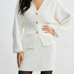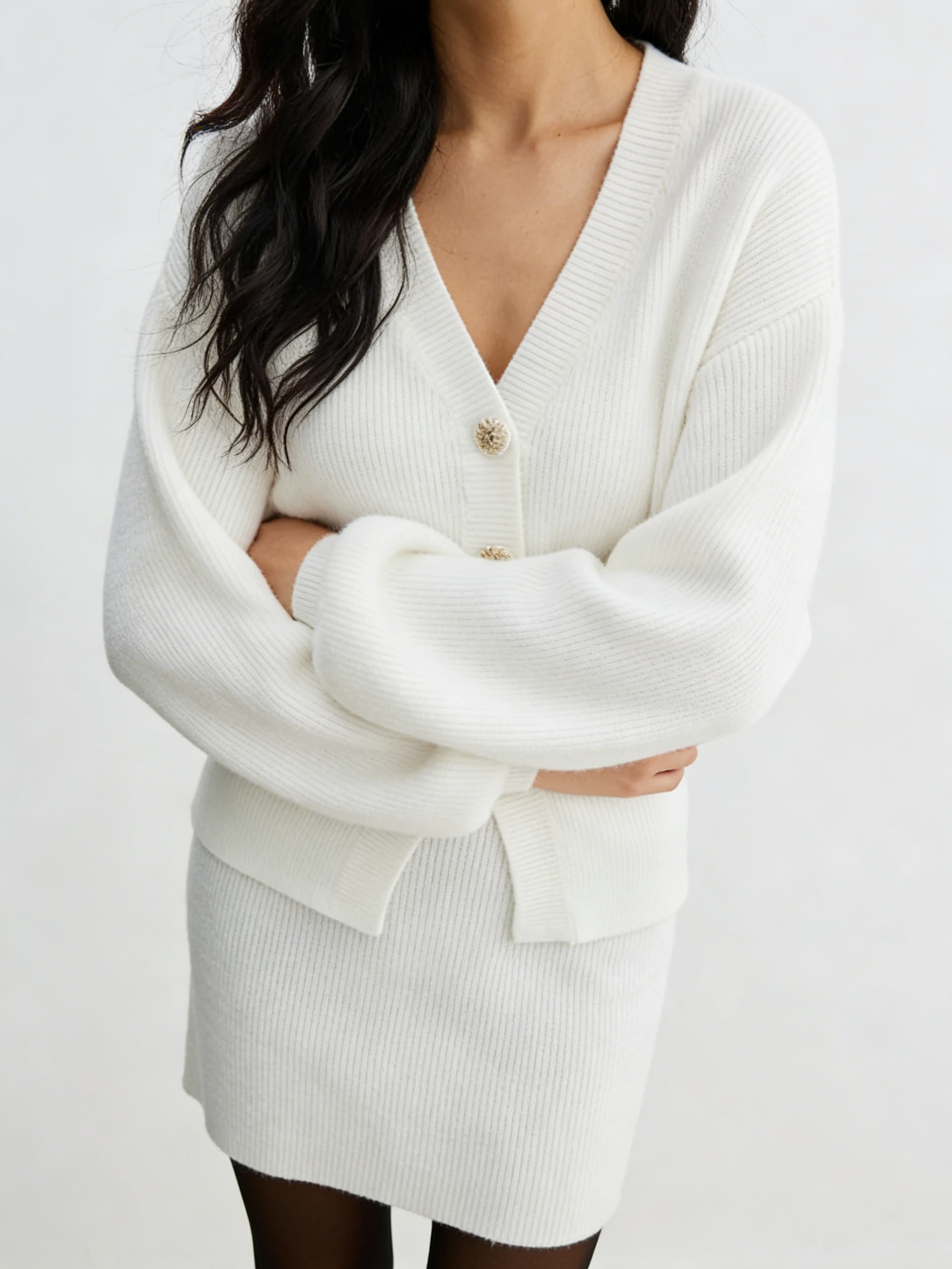 Craftsmanship Technology: V-neckline on cardigan, waist-defined silhouette, lantern sleeves, oversized metal button closure, high-waisted mini skirt, precision stitching