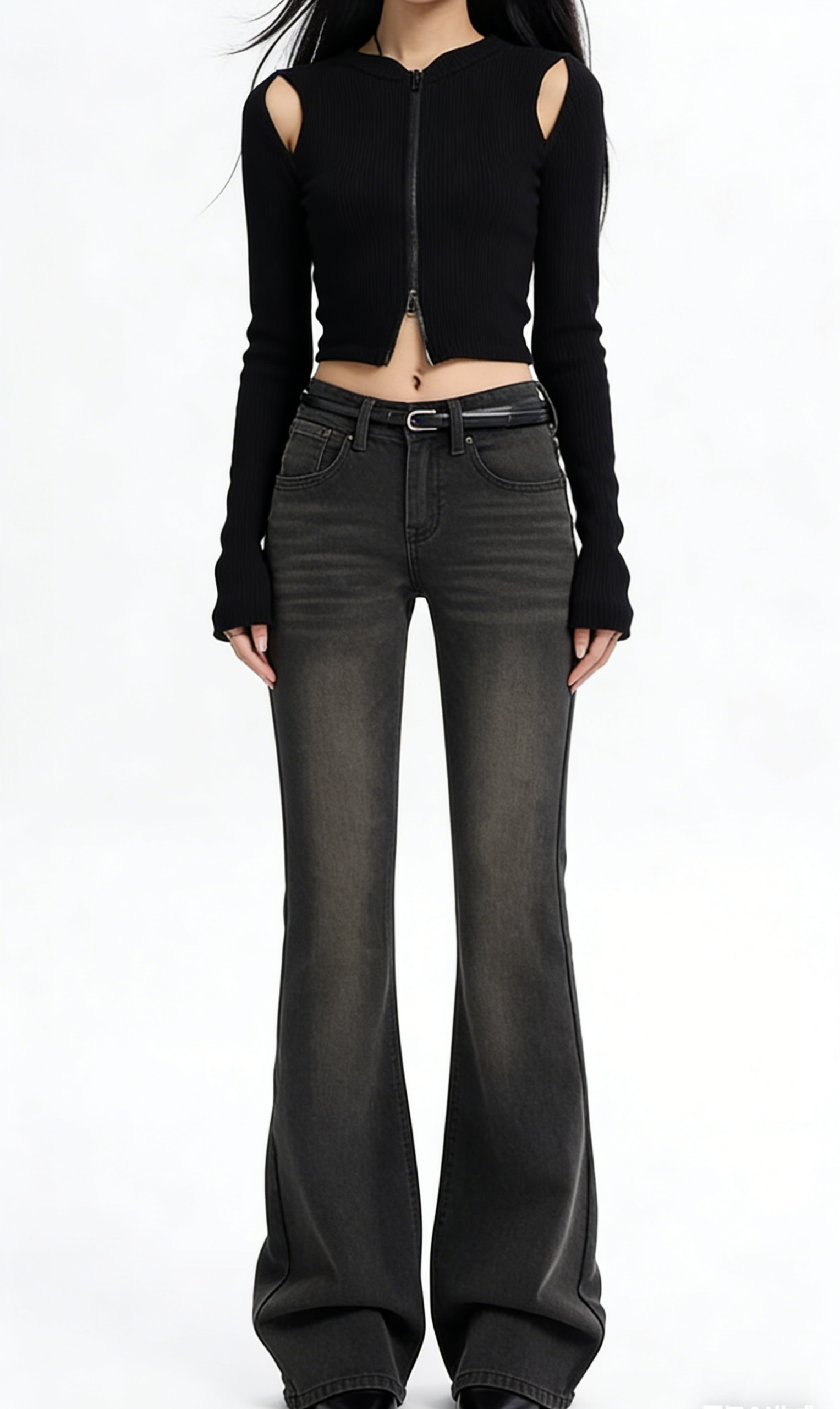 Add an edgy, retro touch to your denim collection with these dark grey high-waisted flare jeans. Crafted from soft washed stretch denim, they feature a high-rise fit, wide flared leg silhouette, and faded gradient wash effect. Perfect for year-round styling, pair them with a cut-out cropped top and platform boots for a Y2K-inspired outfit, or with a blazer and loafers for a smart-casual vibe. These jeans are a versatile staple that combines comfort, nostalgia, and edgy, timeless style.