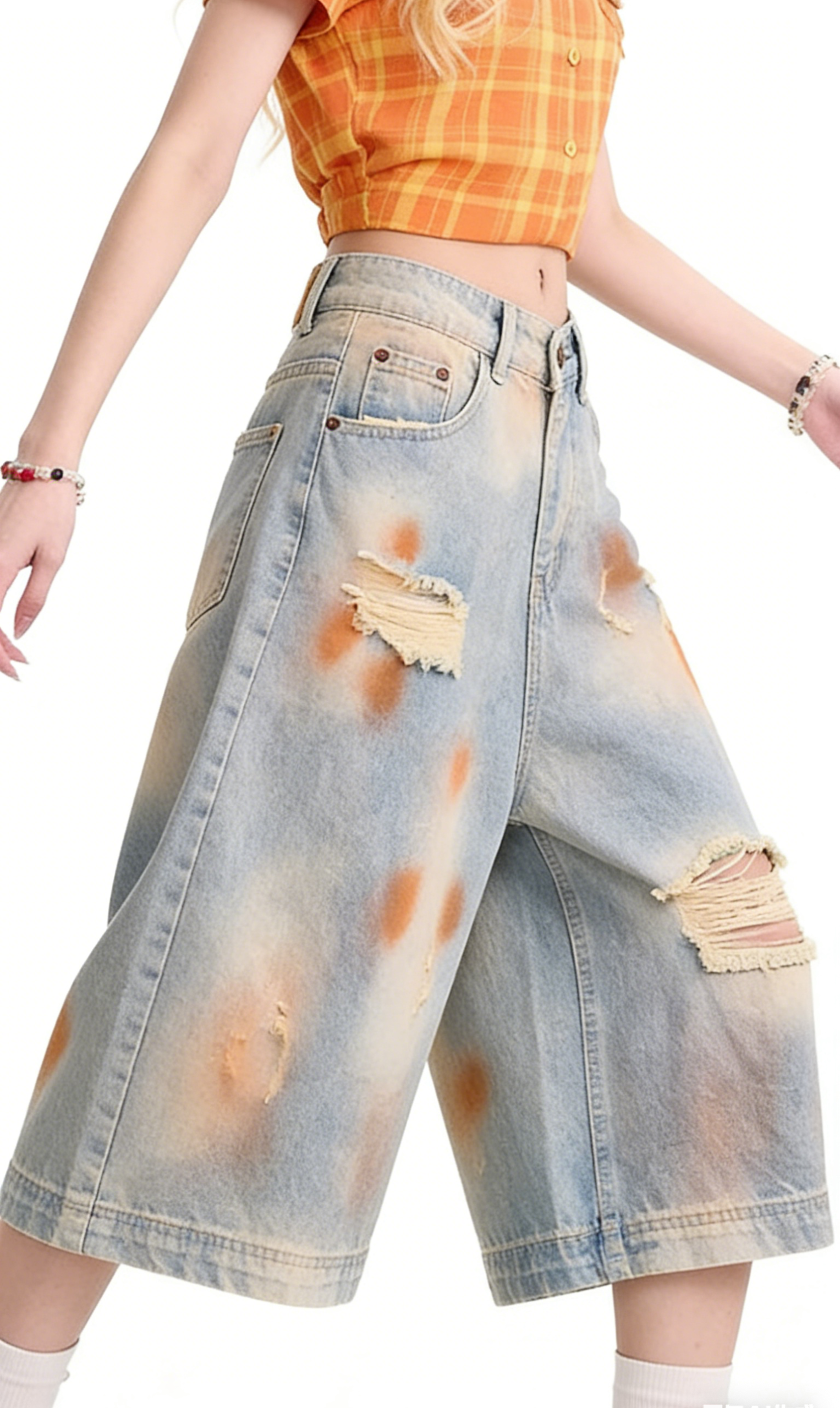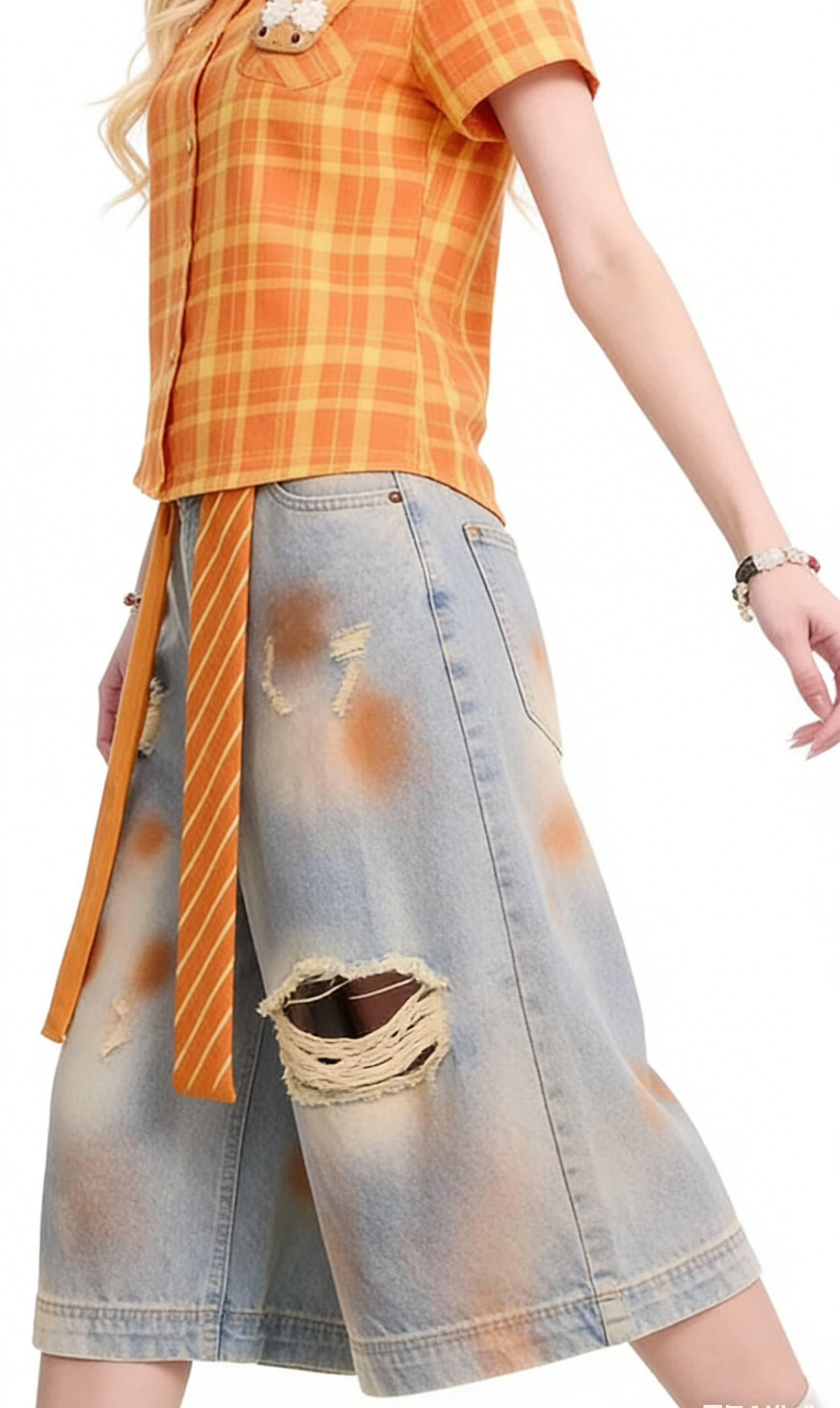 Add an edgy, Y2K-inspired touch to your warm-weather wardrobe with these distressed washed denim wide-leg shorts. Crafted from soft washed denim, they feature a baggy wide-leg silhouette, frayed rips, and orange-tinted bleach spots, paired with a bold removable orange striped tie. Perfect for streetwear or grunge looks, pair them with a cropped plaid button-down and platform sneakers for a complete Y2K outfit, or with a band tee and combat boots for a grunge-inspired vibe. These shorts are a versatile staple that combines comfort, edge, and nostalgic style.