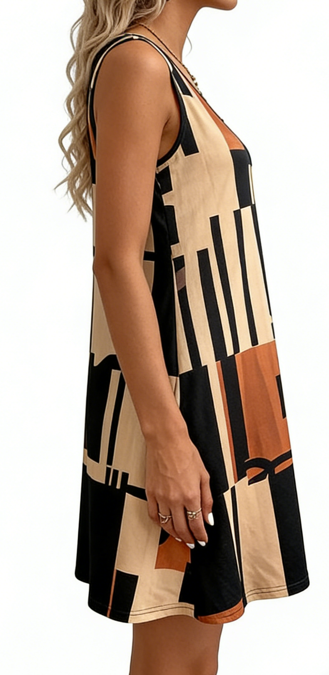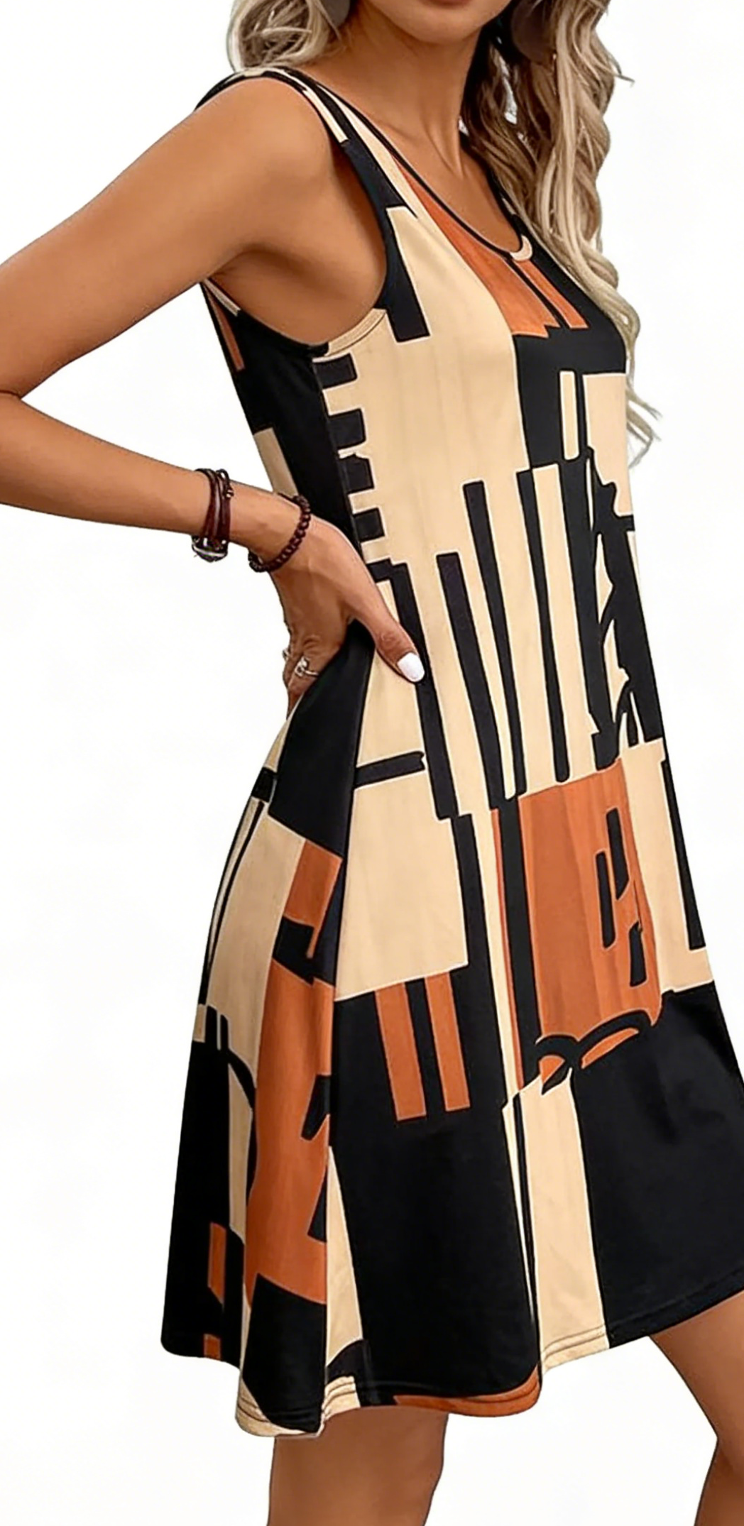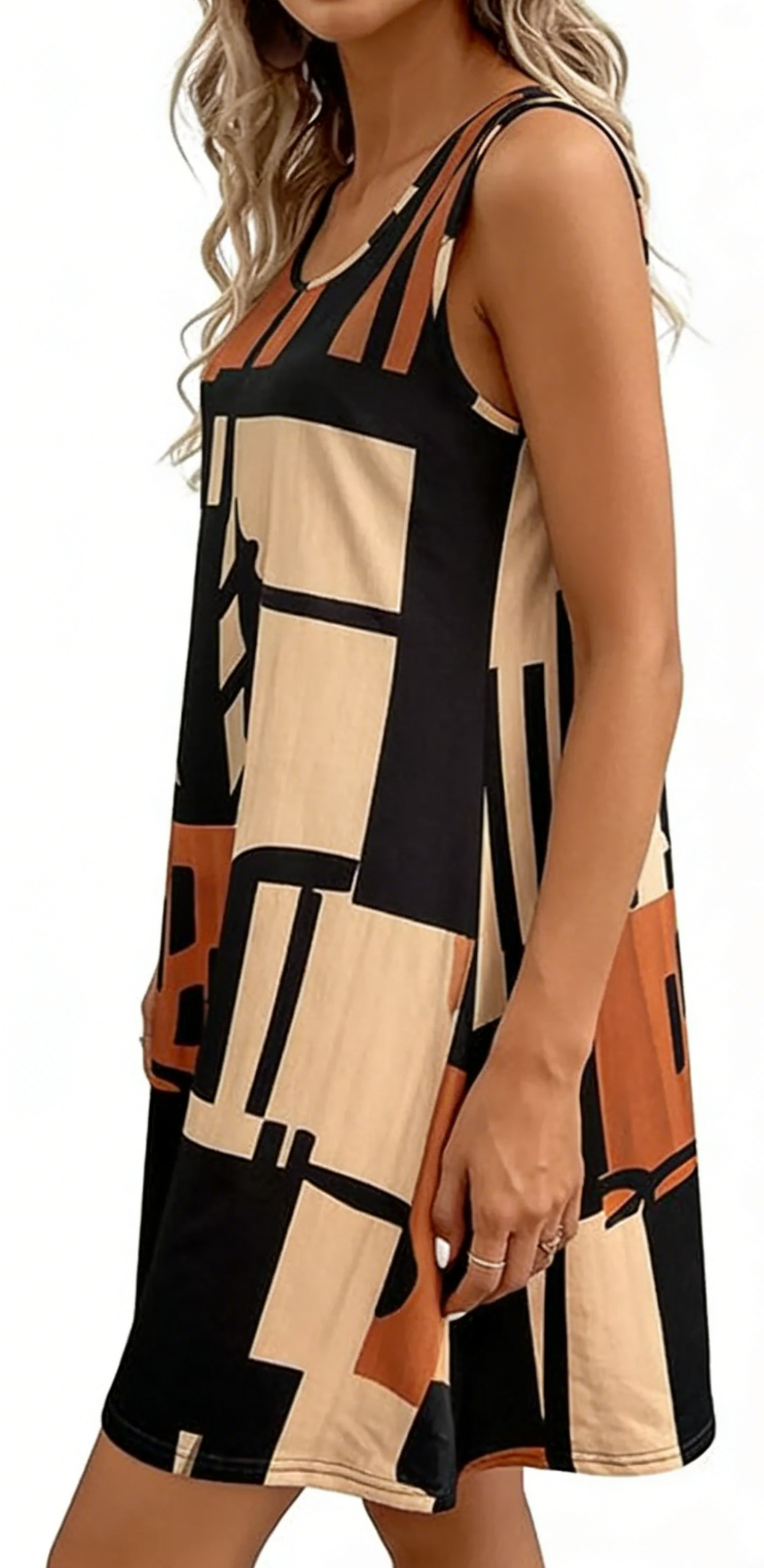 Elevate your casual summer wardrobe with this geometric color block sleeveless A-line dress. Crafted from a lightweight, flowy poly-spandex blend, it features a bold geometric print that brings modern art-inspired charm to your everyday look. The relaxed A-line silhouette is incredibly flattering and comfortable, ideal for picnics, beach days, or casual outings. Wear it with strappy sandals and a woven tote for a vacation-ready look, or pair it with sneakers and a crossbody bag for a chic city outfit. This dress is a versatile staple that combines comfort, style, and on-trend art-inspired design.