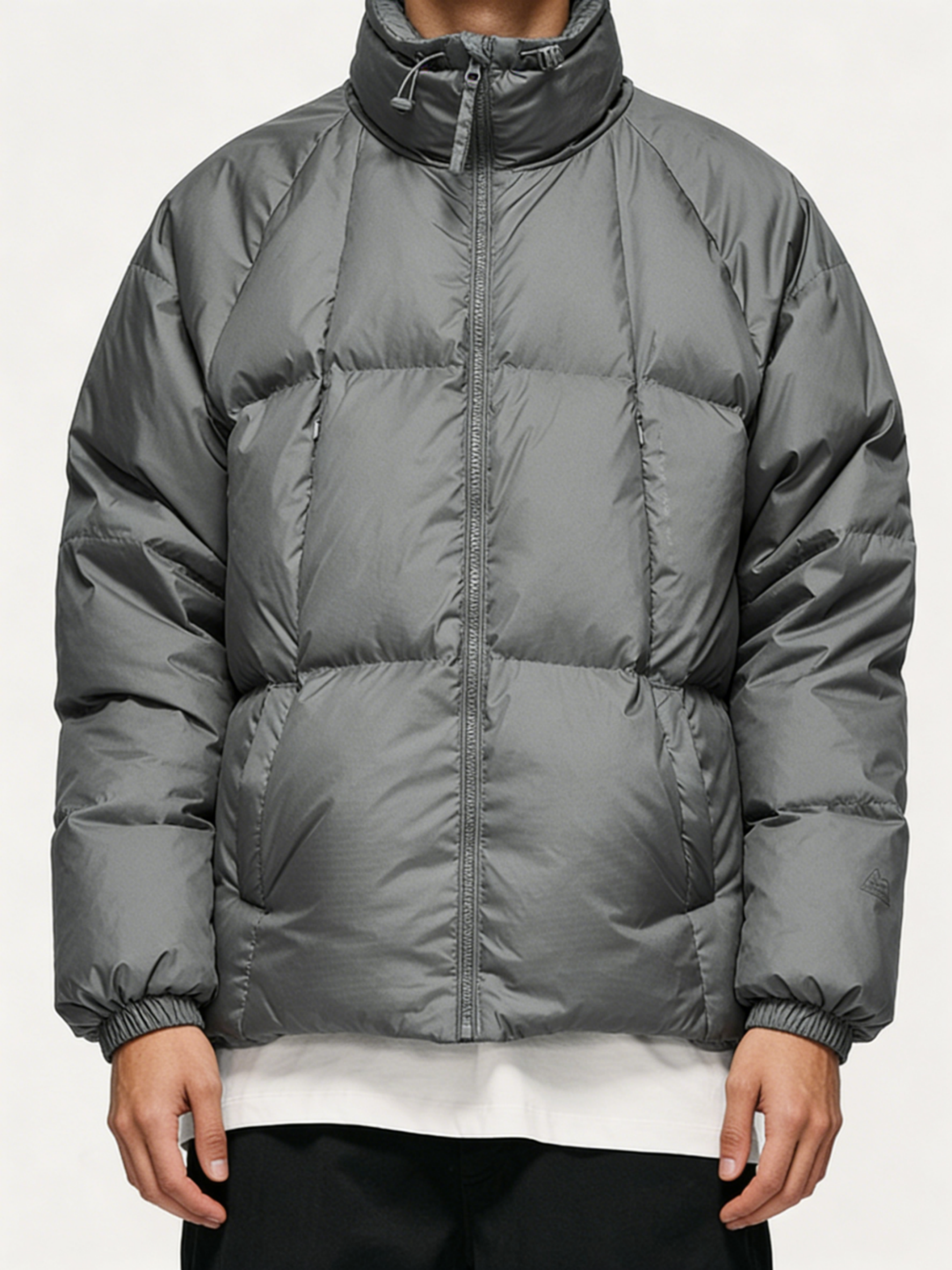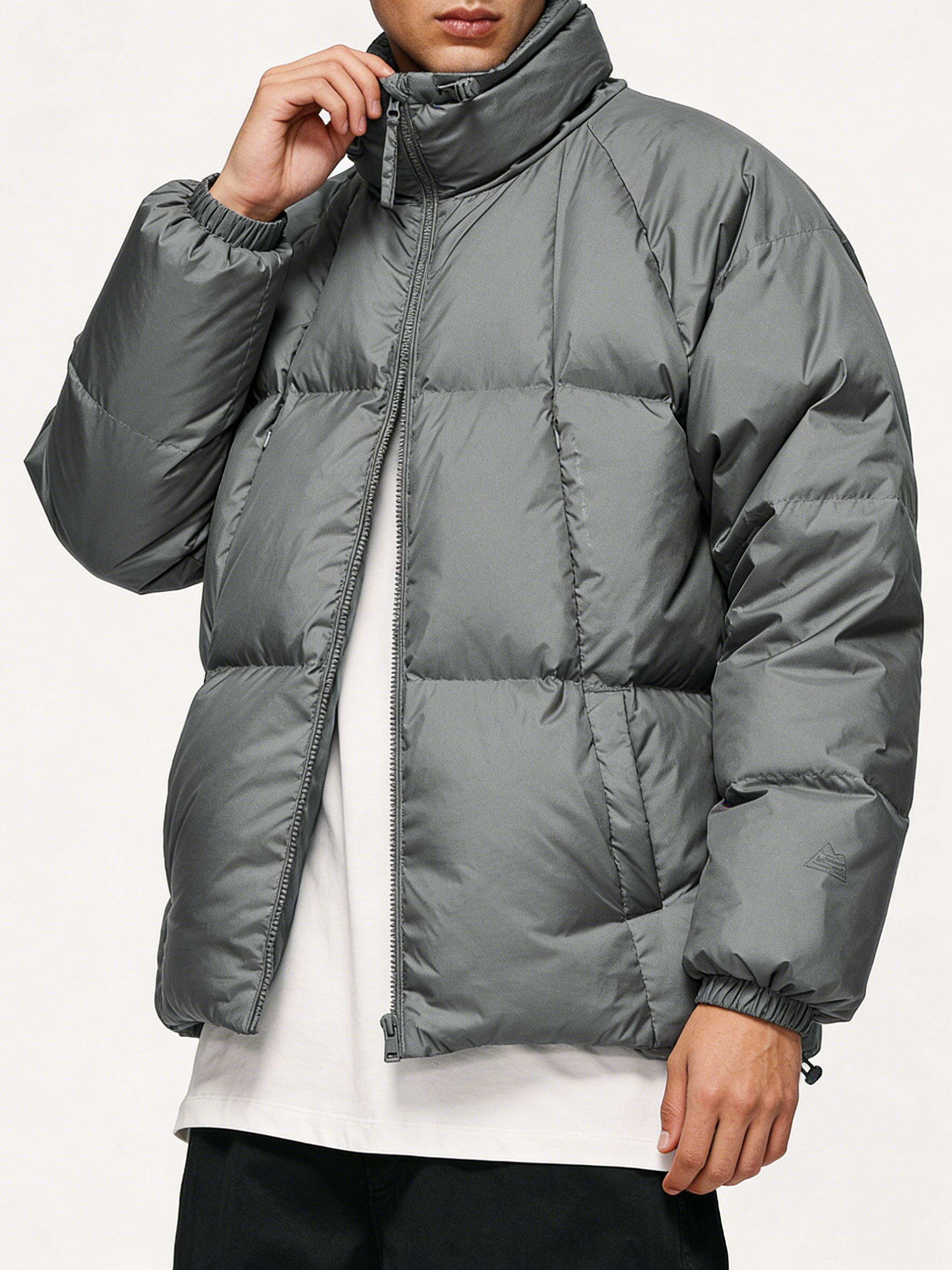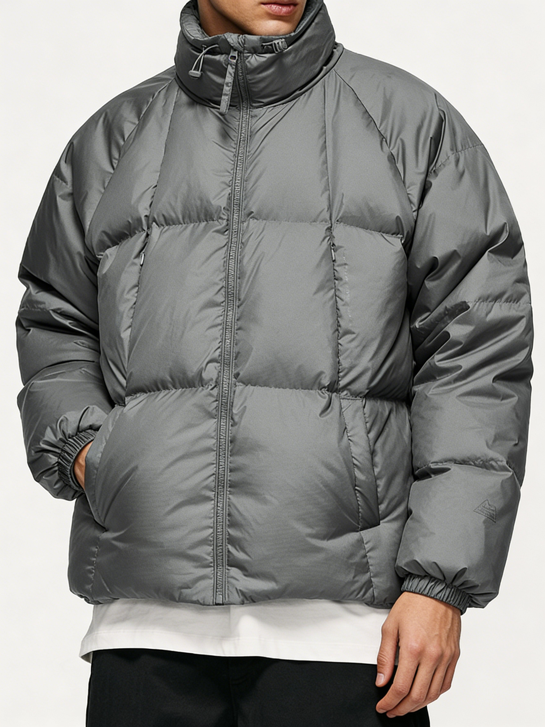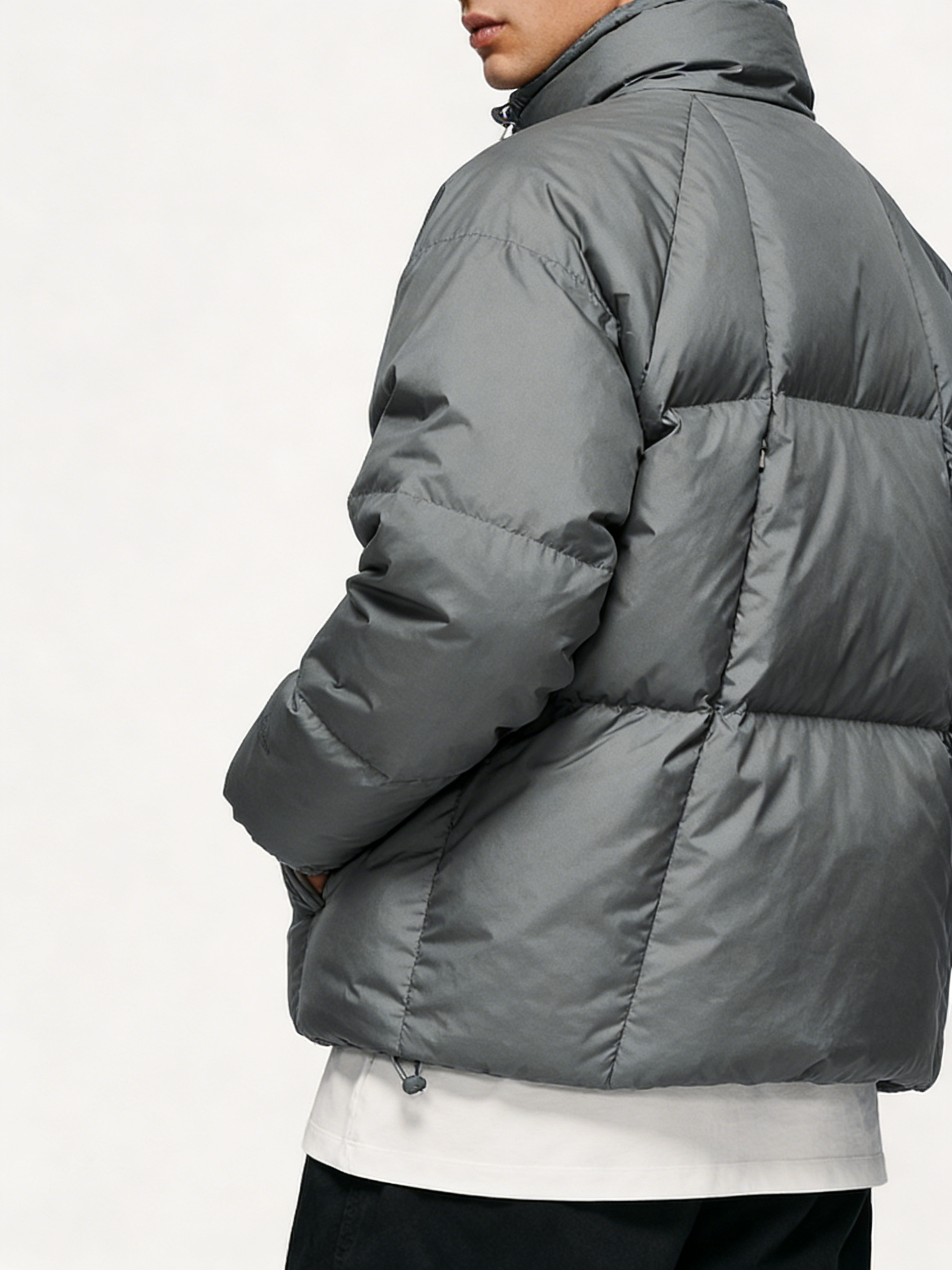 Technics: Quilted construction, stand collar with drawstrings, front zipper closure, side pockets, elasticated cuffs