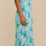 - Craftsmanship Technology: Strapless sweetheart neckline, twist front bust detail, vertical pleated texture, flowy maxi skirt, frayed raw hem, abstract floral print