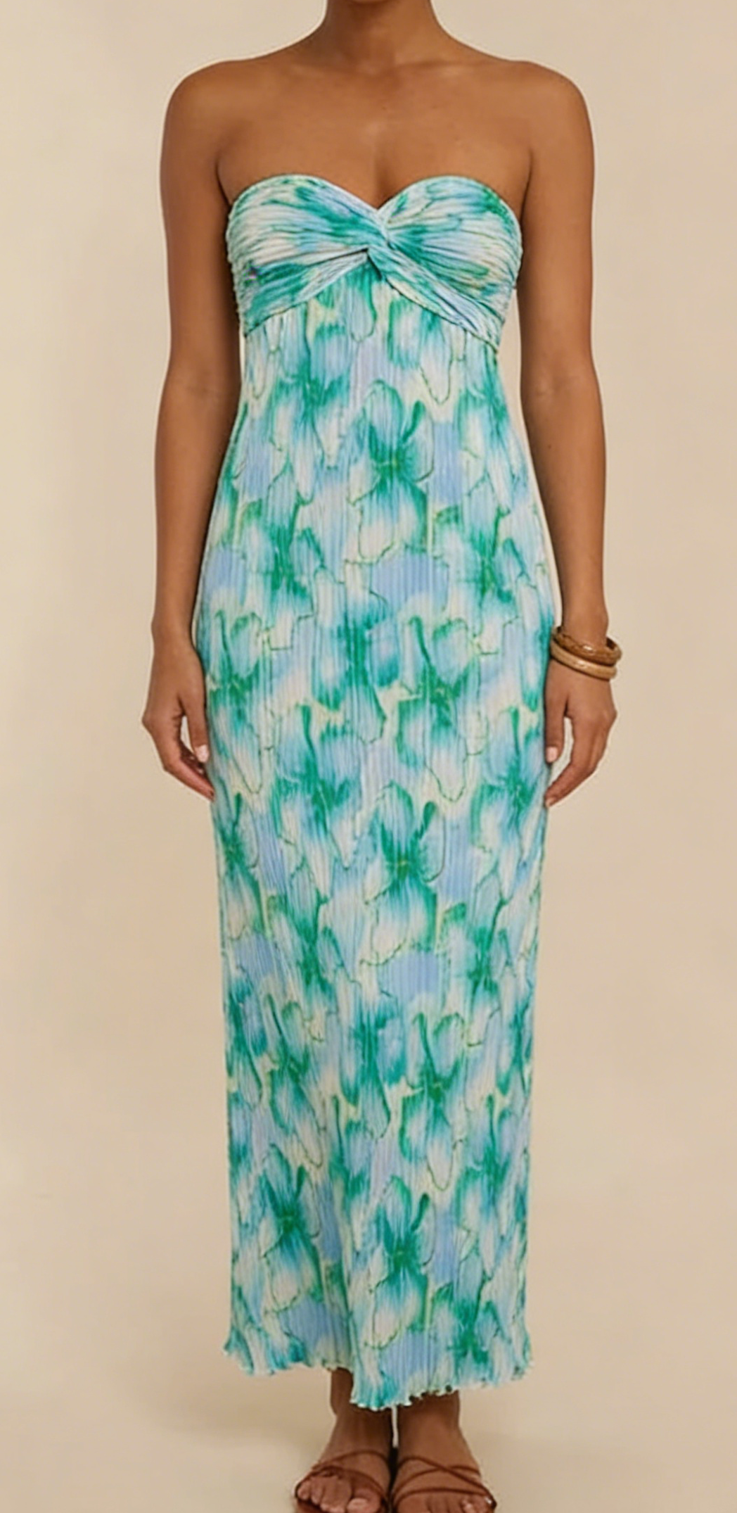 Embrace the tropical vacation vibe in this green & blue abstract floral strapless maxi dress. Crafted from lightweight pleated knit fabric, it features a romantic sweetheart neckline with a twist front bust detail for a flattering, supportive fit. The vertical pleated texture adds visual interest and stretch, while the watercolor abstract floral print brings a fresh, boho charm. The flowy maxi skirt with a frayed hem adds movement and grace, making it perfect for beach days, brunch, or garden parties. Wear it with strappy sandals and a woven tote for a beach-ready look, or dress it up with block heels and statement earrings for a special occasion. This dress is a timeless staple that combines comfort, boho elegance, and vacation-ready style.