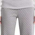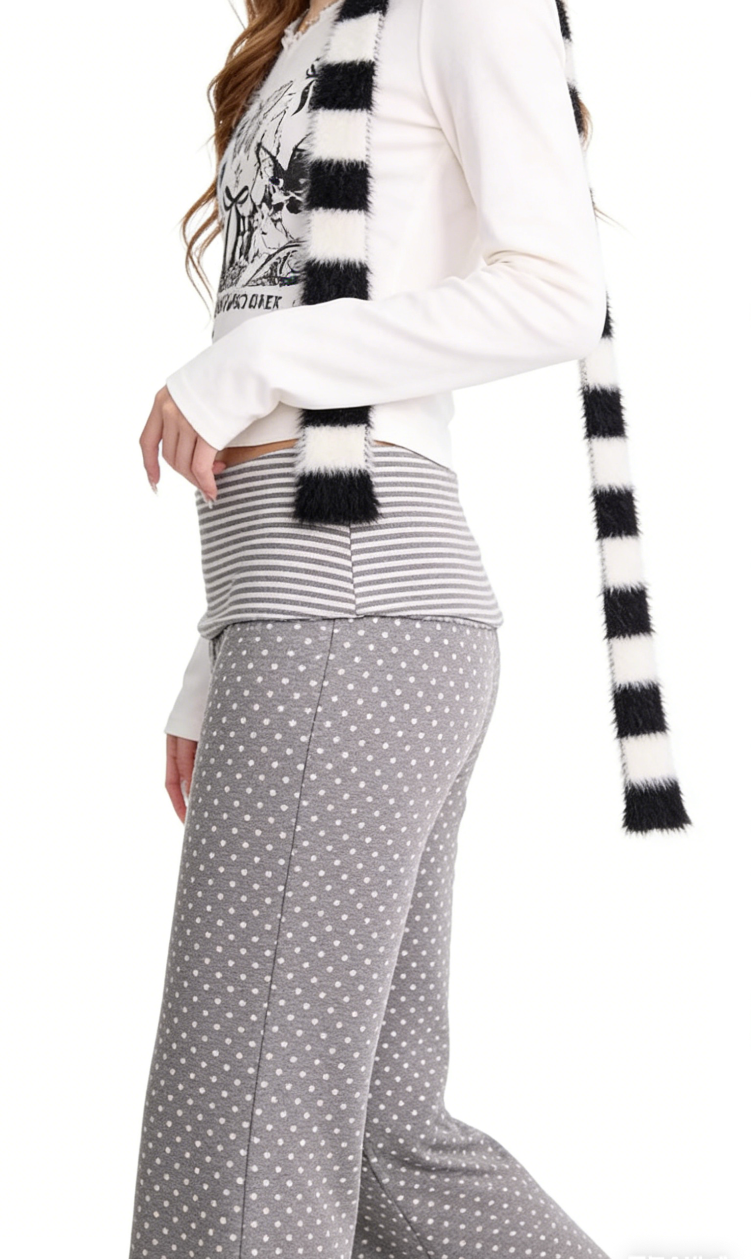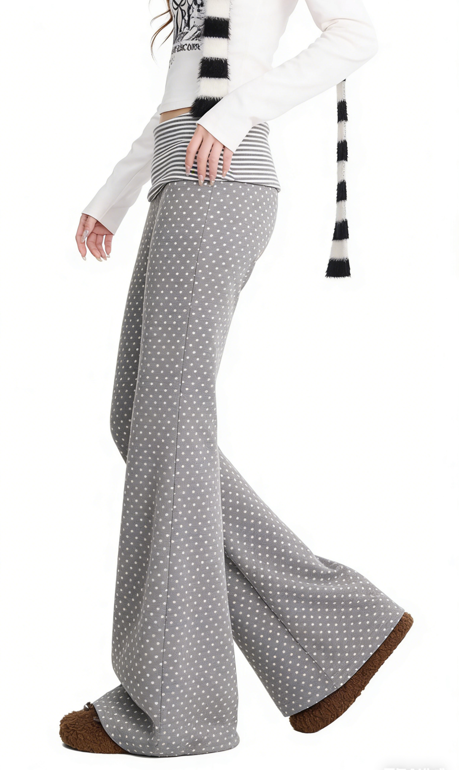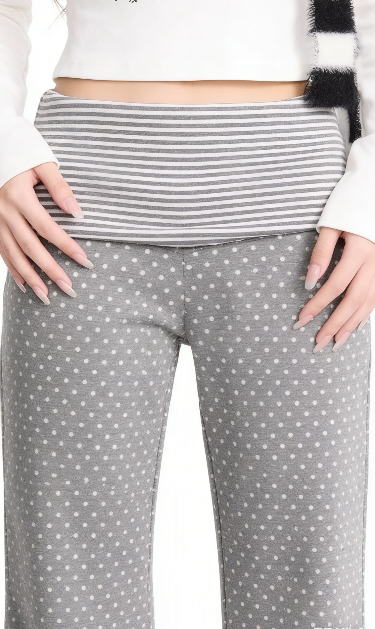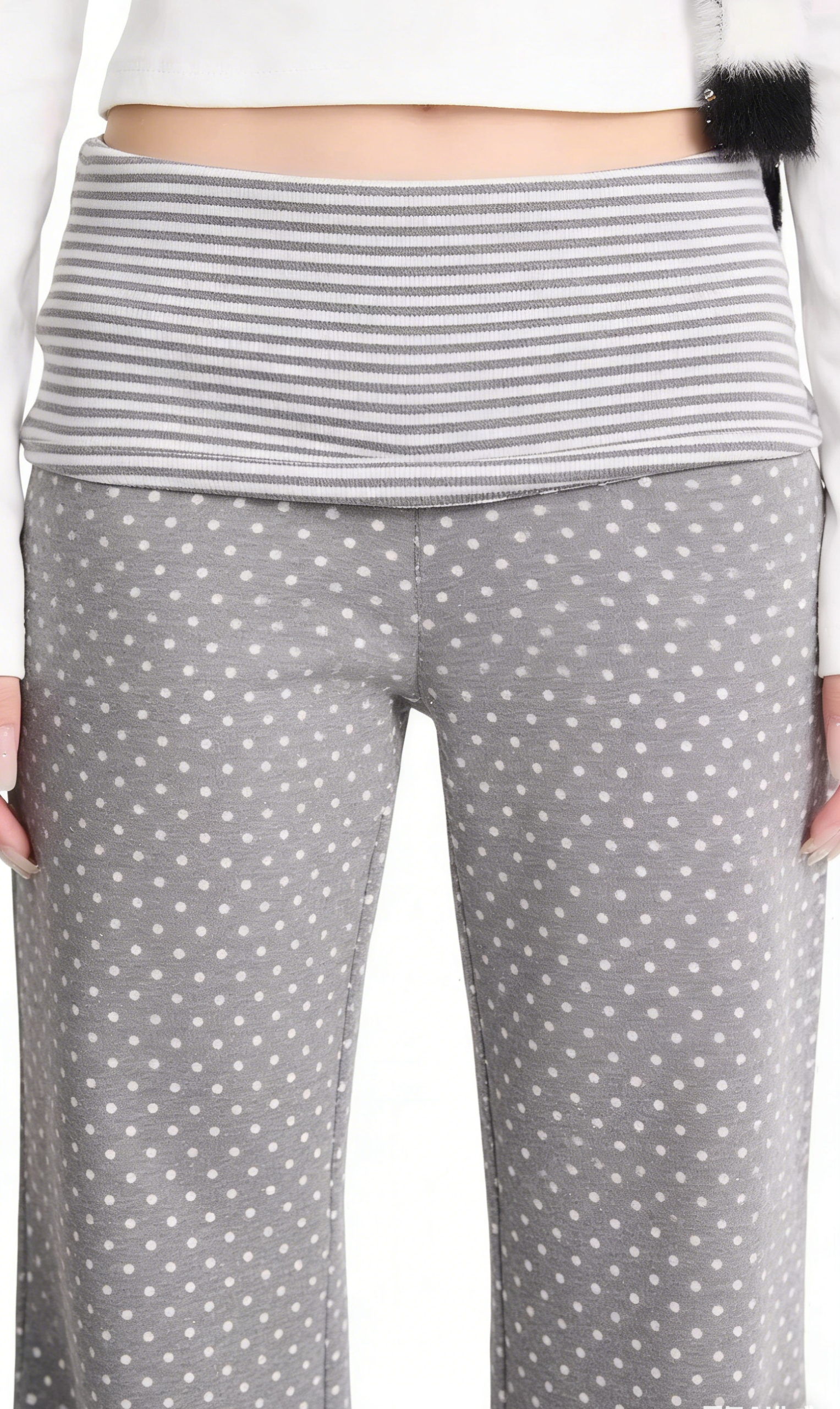 Add a cozy, playful touch to your wardrobe with these grey polka dot wide-leg pants. Craft from soft stretchy knit, they feature a striped foldover high waist and flared polka dot legs, with a subtle shimmer finish. Perfect for loungewear or casual outings, pair them with a cropped long sleeve top and slippers for a cozy at-home look, or with a lace-trimmed top and Mary Jane shoes for a sweet Coquette outfit. These pants are a versatile staple that combines comfort, charm, and nostalgic style.