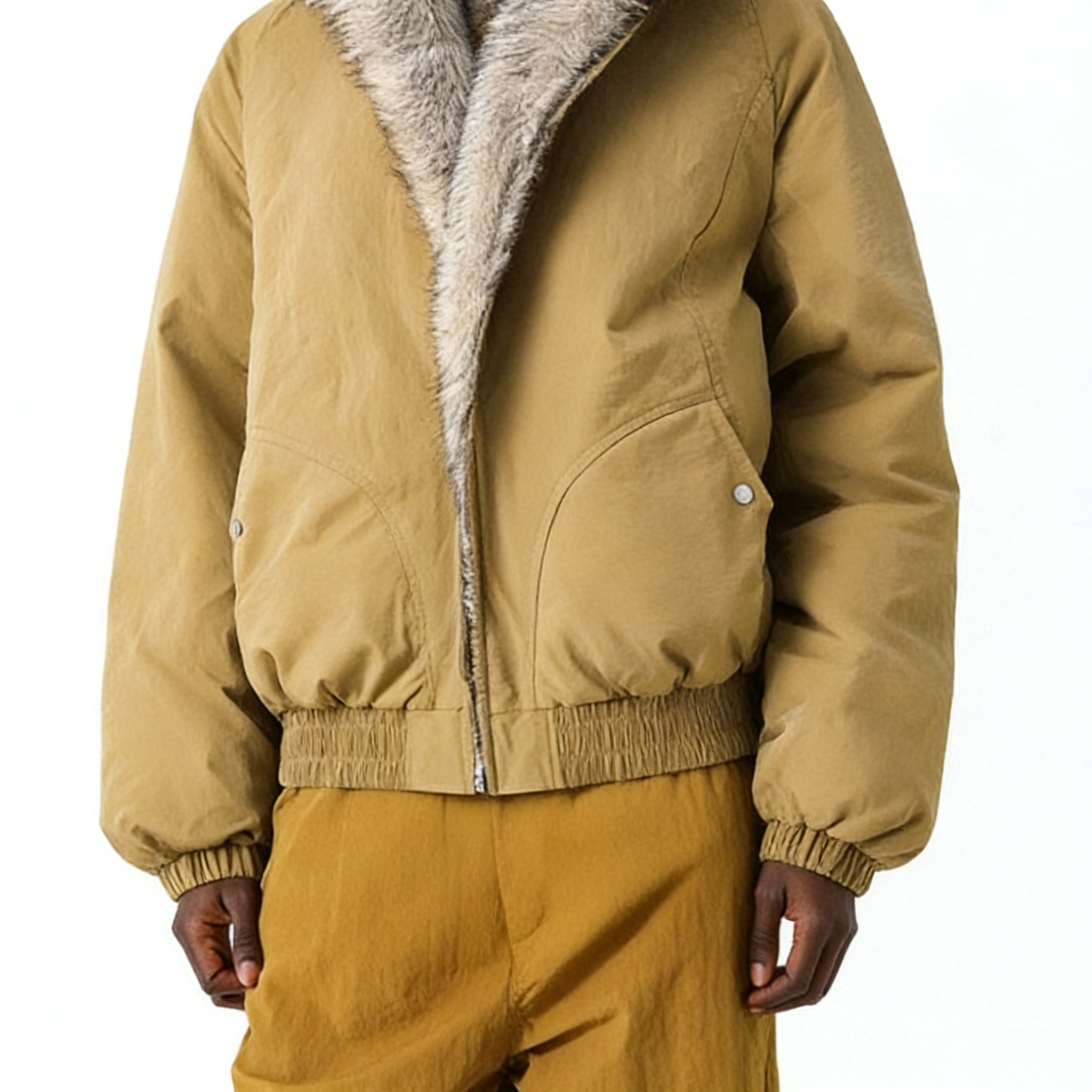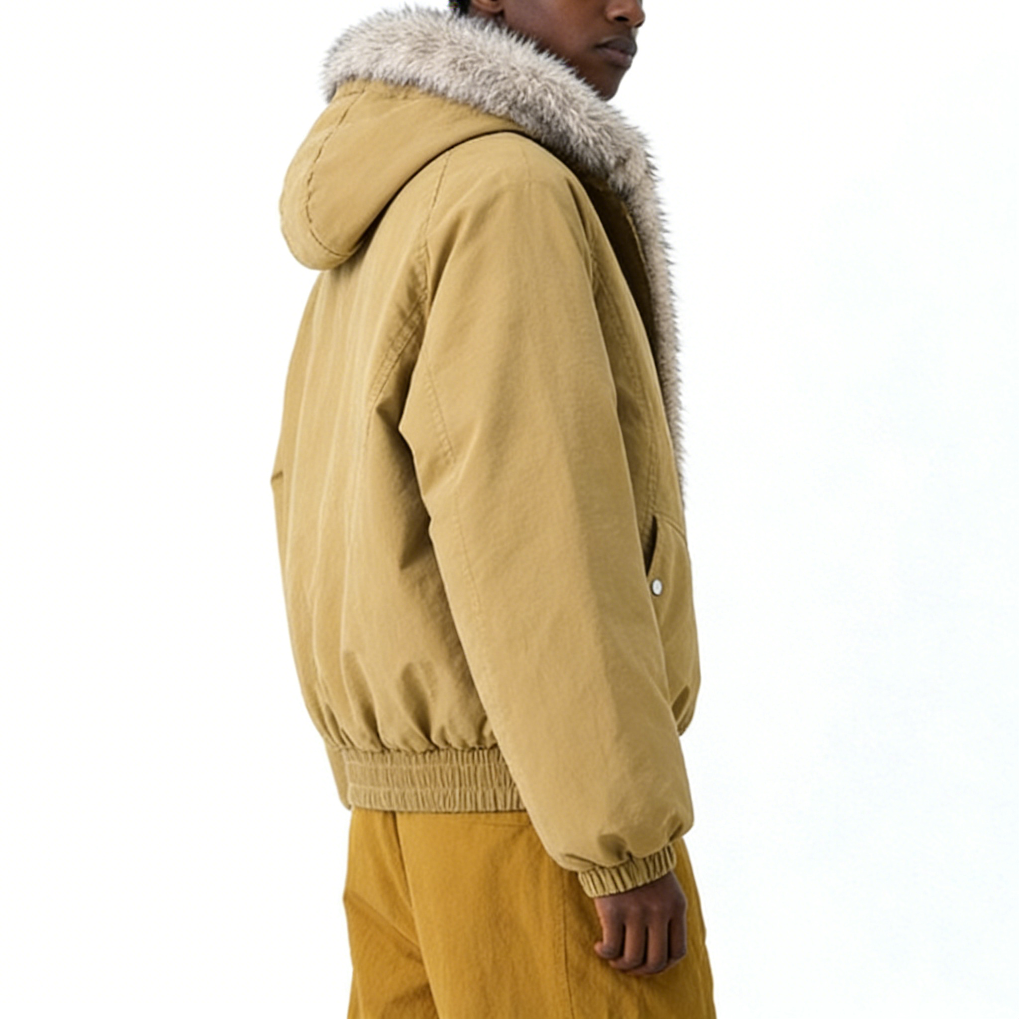 Technics: Hooded design with faux fur trim, front zipper closure, side pockets, elasticated hem and cuffs