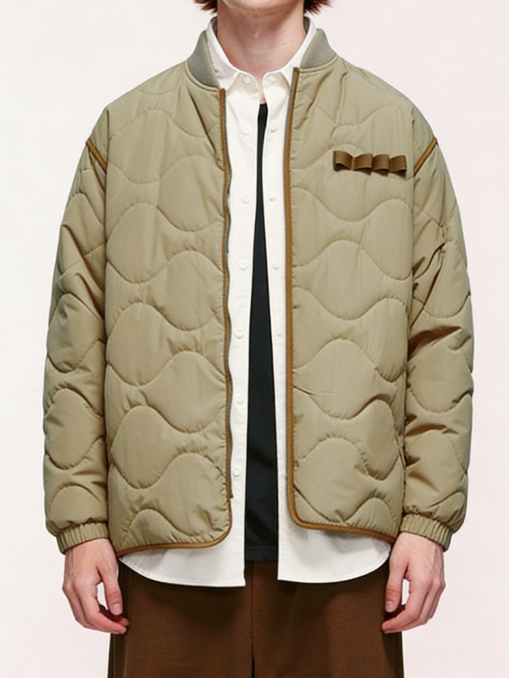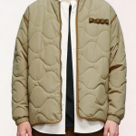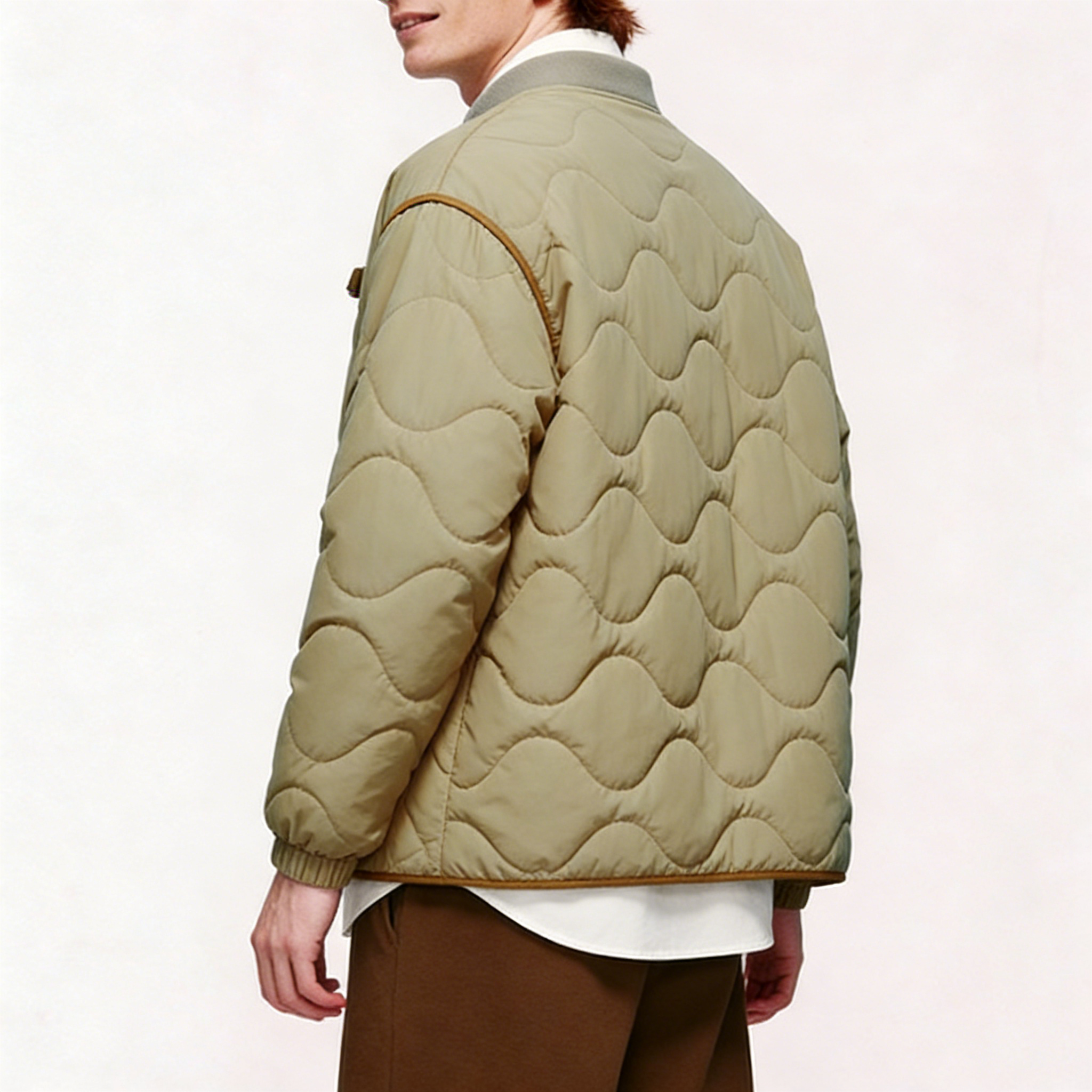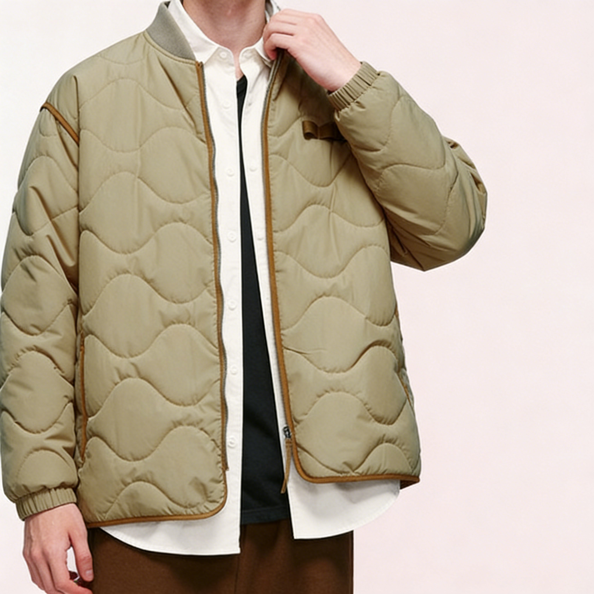 Technics: Wave-quilted construction, ribbed collar/cuffs/hem, front zipper closure, chest utility loops, contrast trim