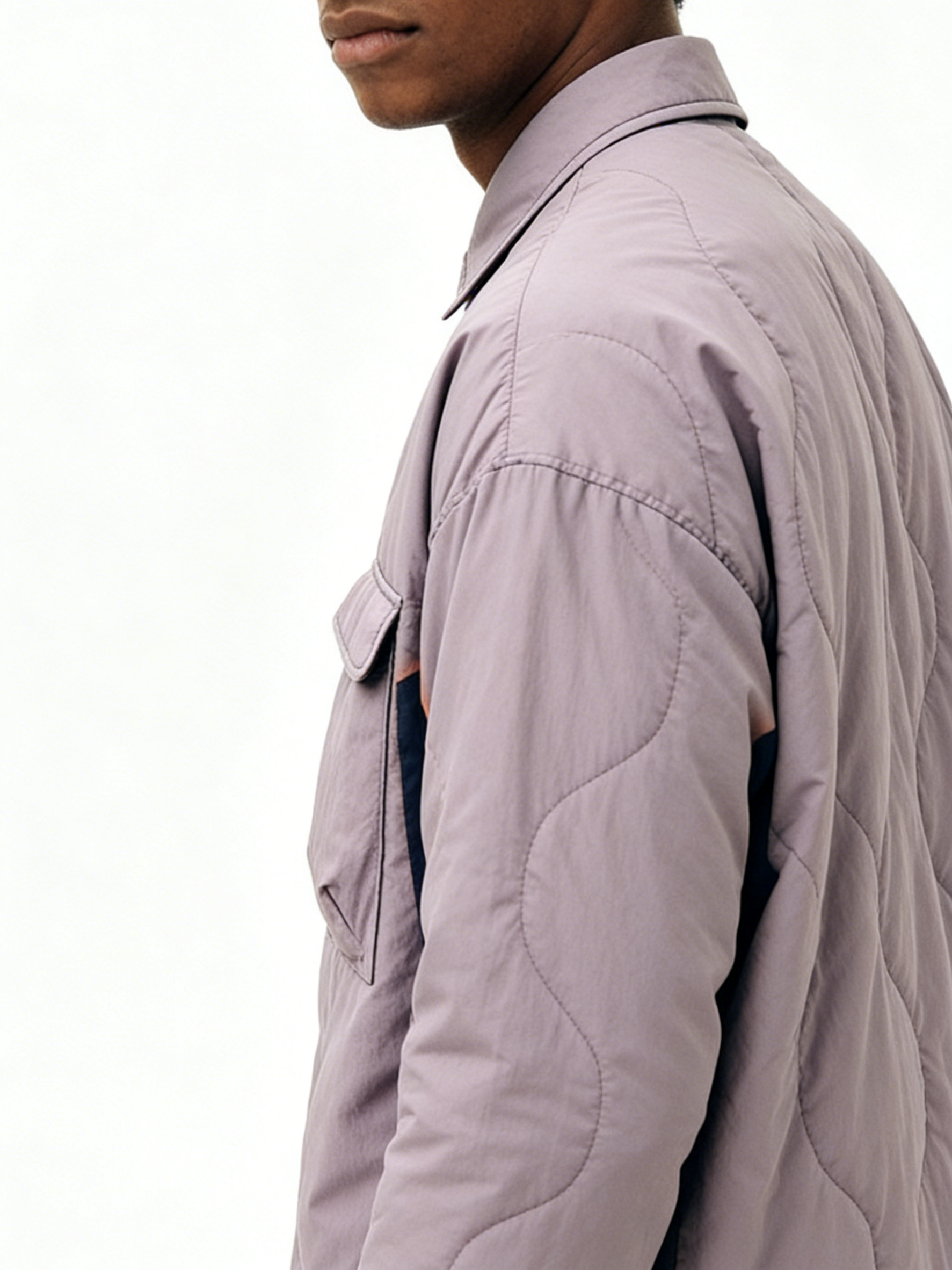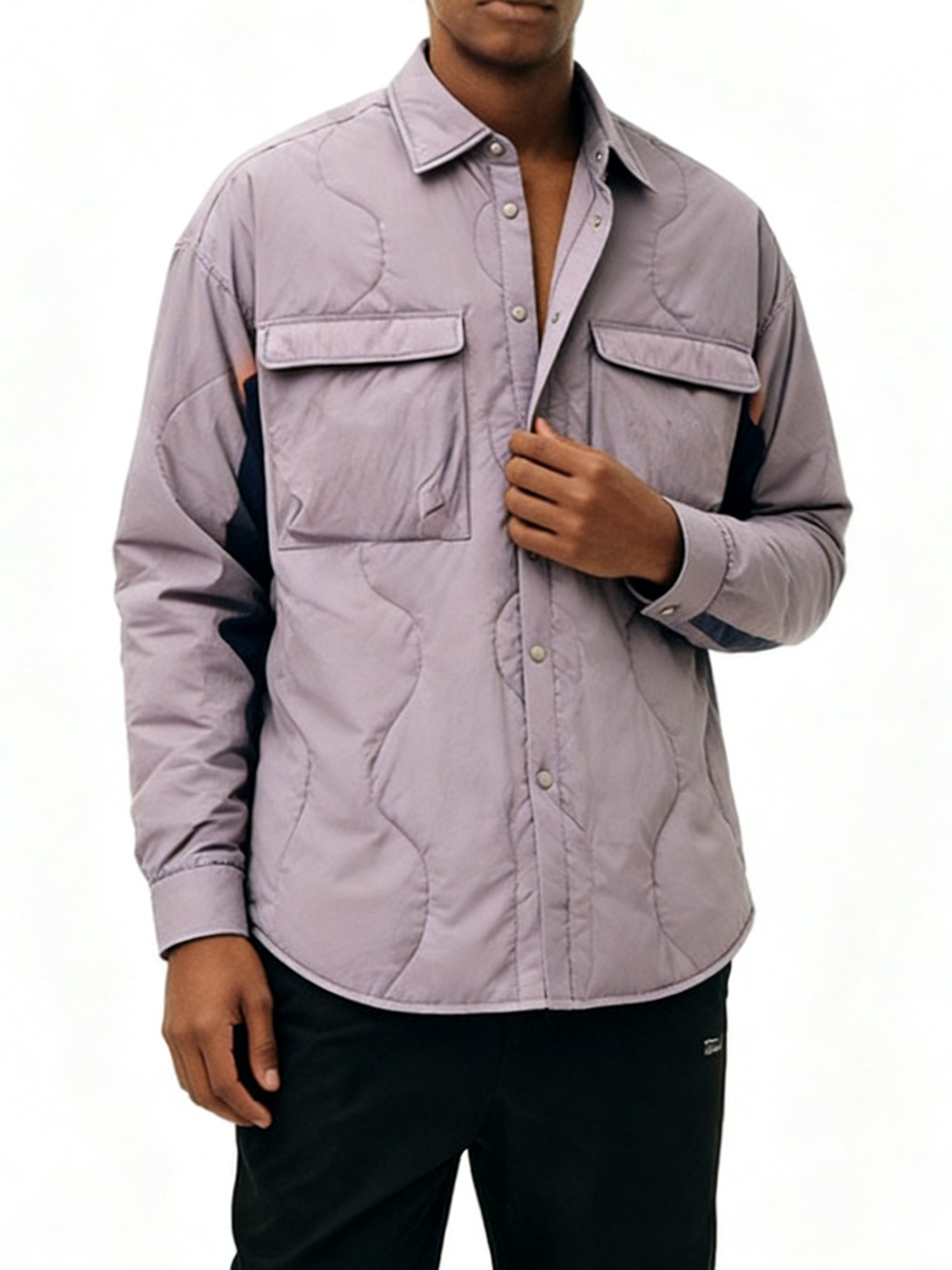 Technics: Wave-quilted construction, shirt collar, snap button closure, chest flap pockets, ribbed cuffs