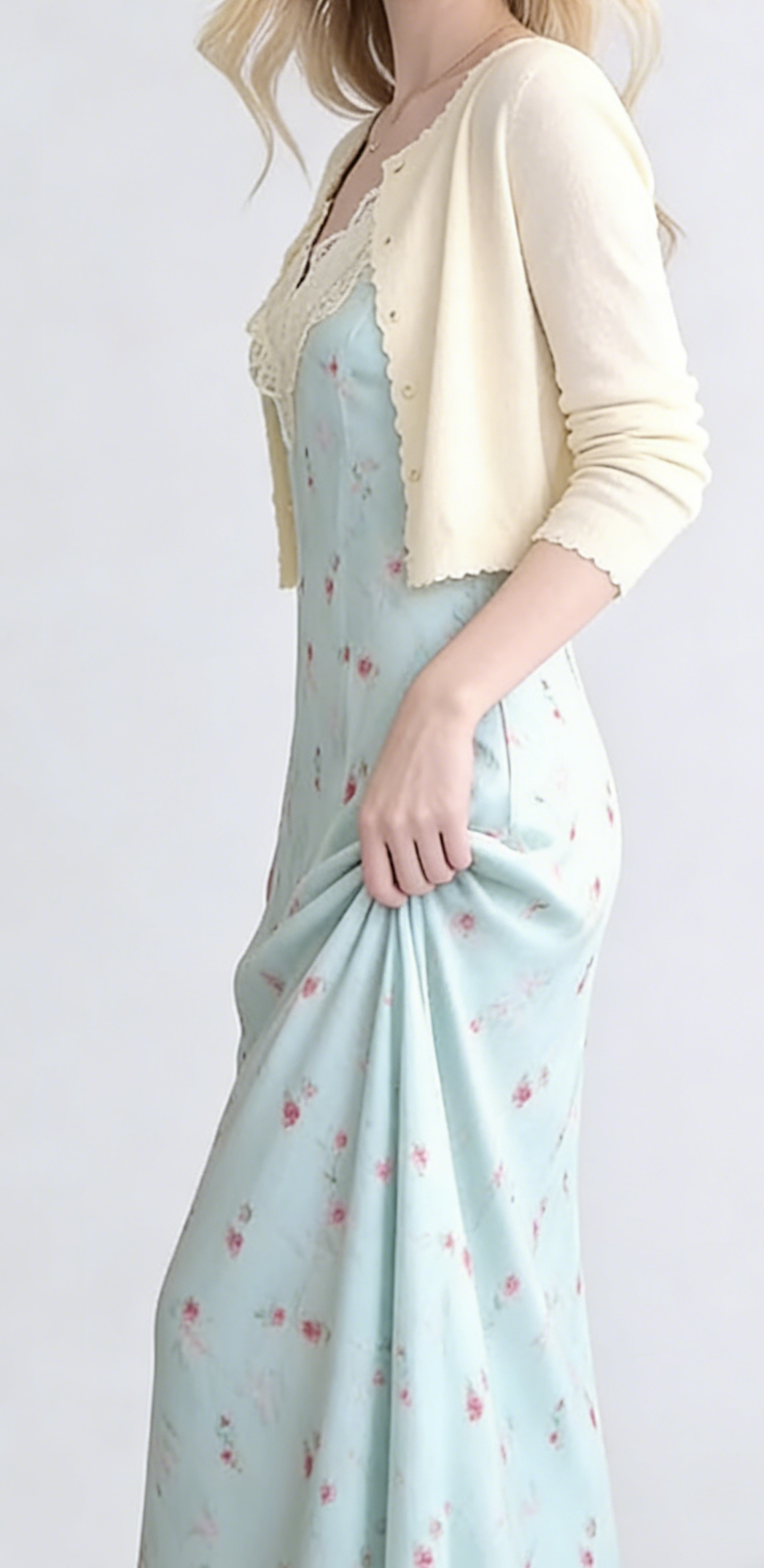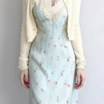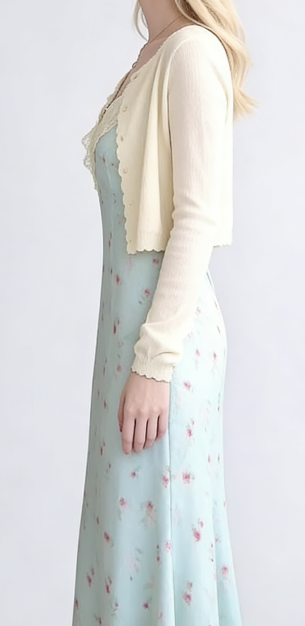 - Craftsmanship Technology: V-neckline with scalloped lace trim, fitted bodice with vertical seams, flowy maxi skirt, matching cropped cardigan with button closure and scalloped edges