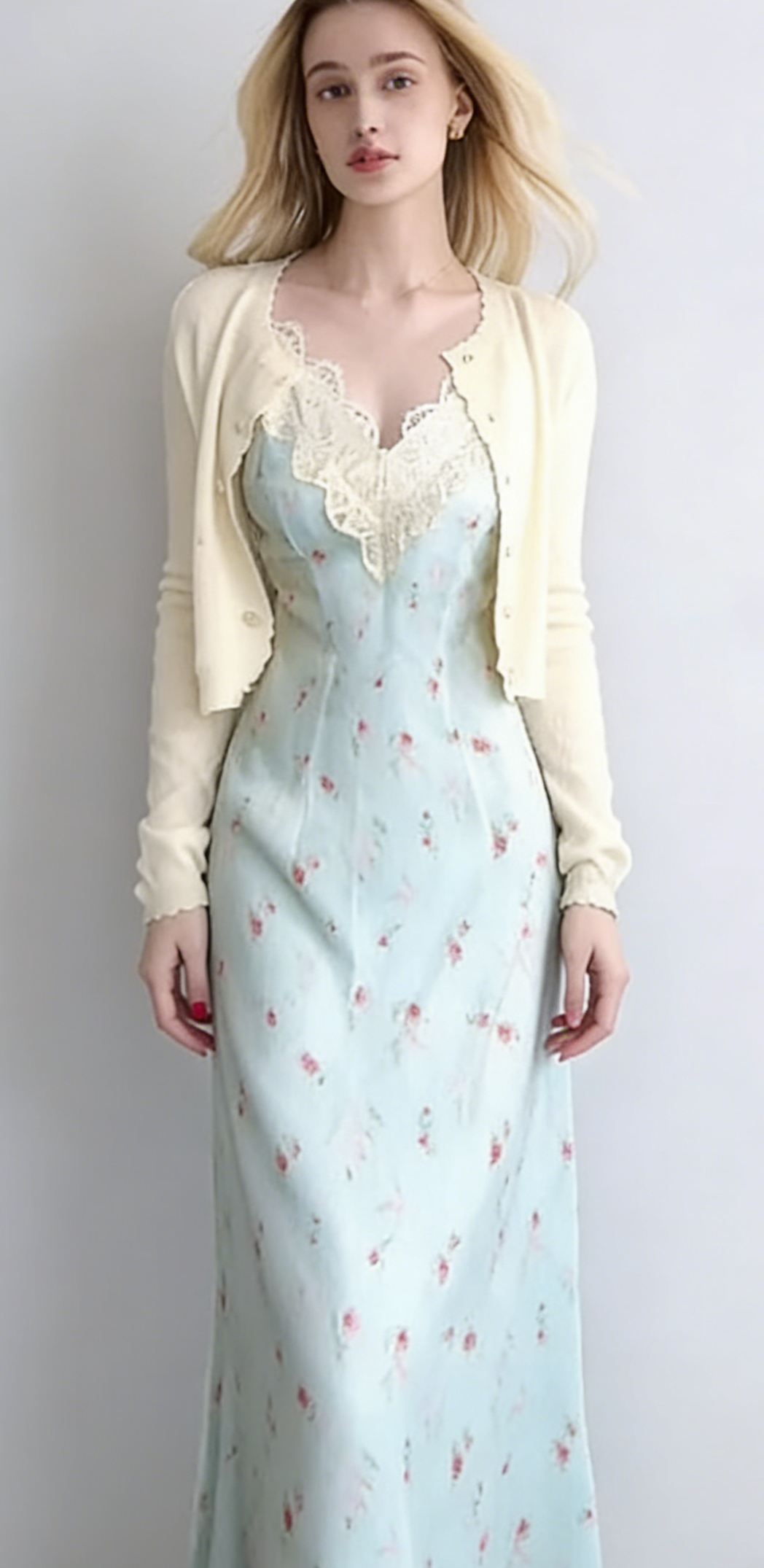 Embrace romantic spring vibes in this light blue floral lace trim maxi dress set. Crafted from silky satin blend fabric, the dress features a delicate pink rose print and scalloped lace trim along the V-neckline, creating a dreamy, vintage-inspired look. The fitted bodice transitions into a flowy maxi skirt, while the matching cropped knit cardigan adds softness and coverage. Wear the set together for a polished, feminine outfit, or style the dress alone with strappy sandals for a beach-ready look. This set is a timeless staple that combines comfort, romance, and effortless elegance.