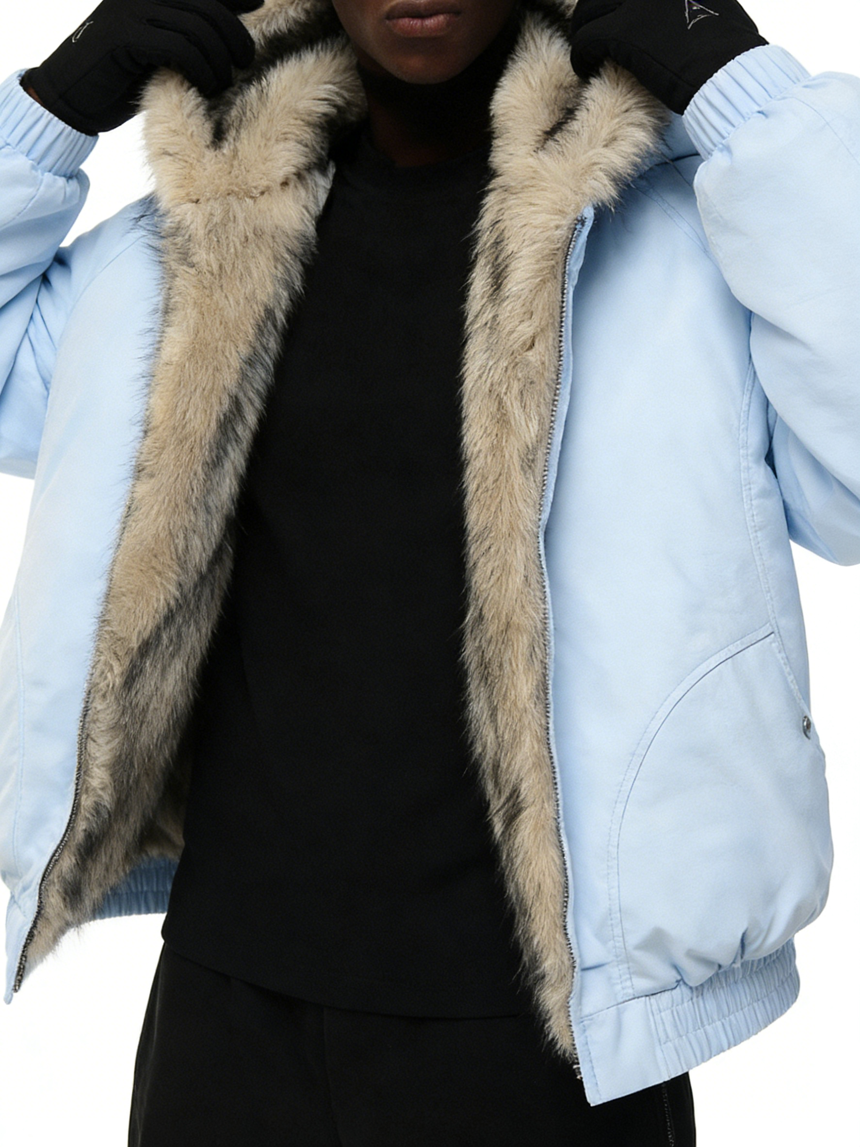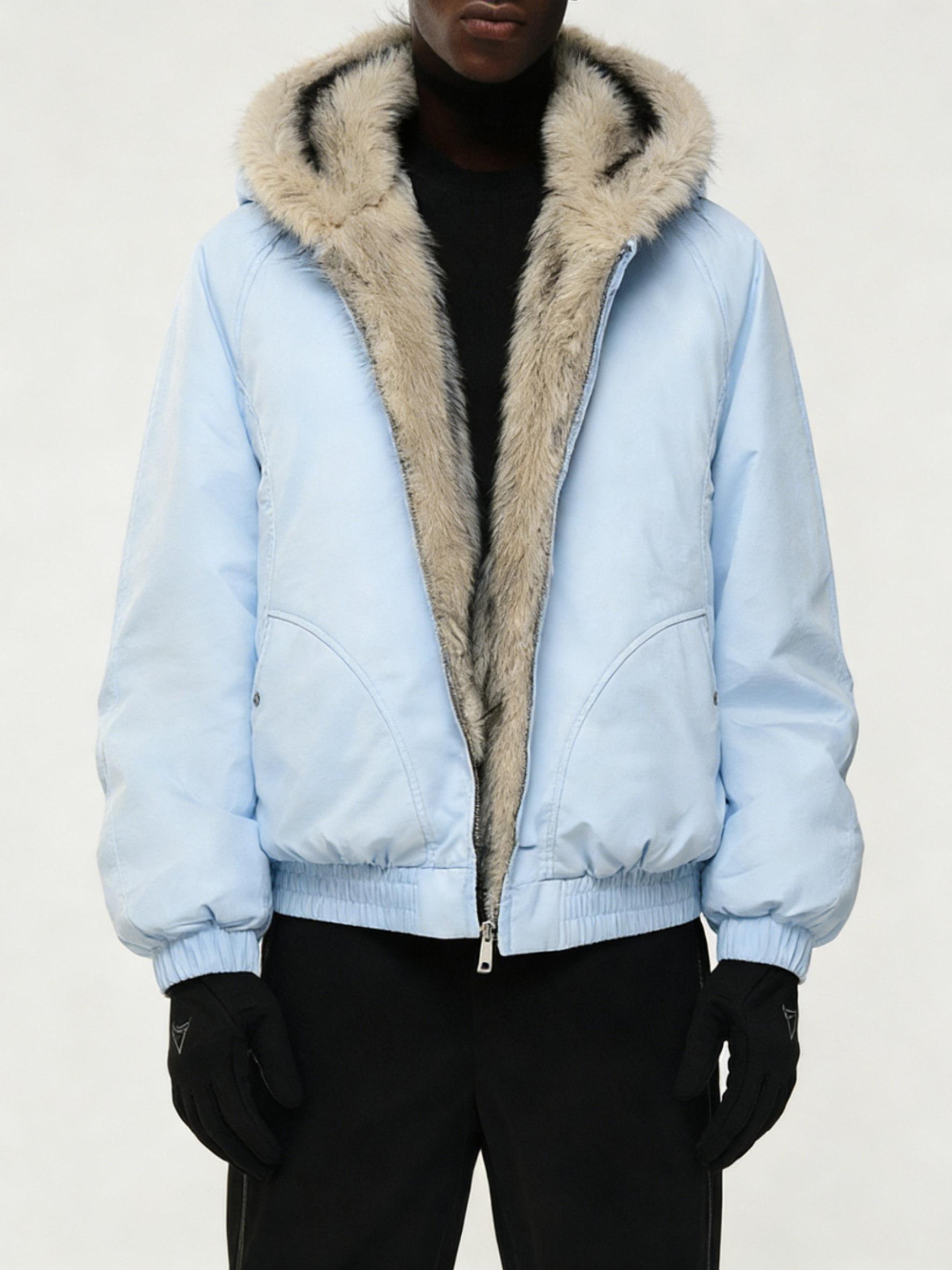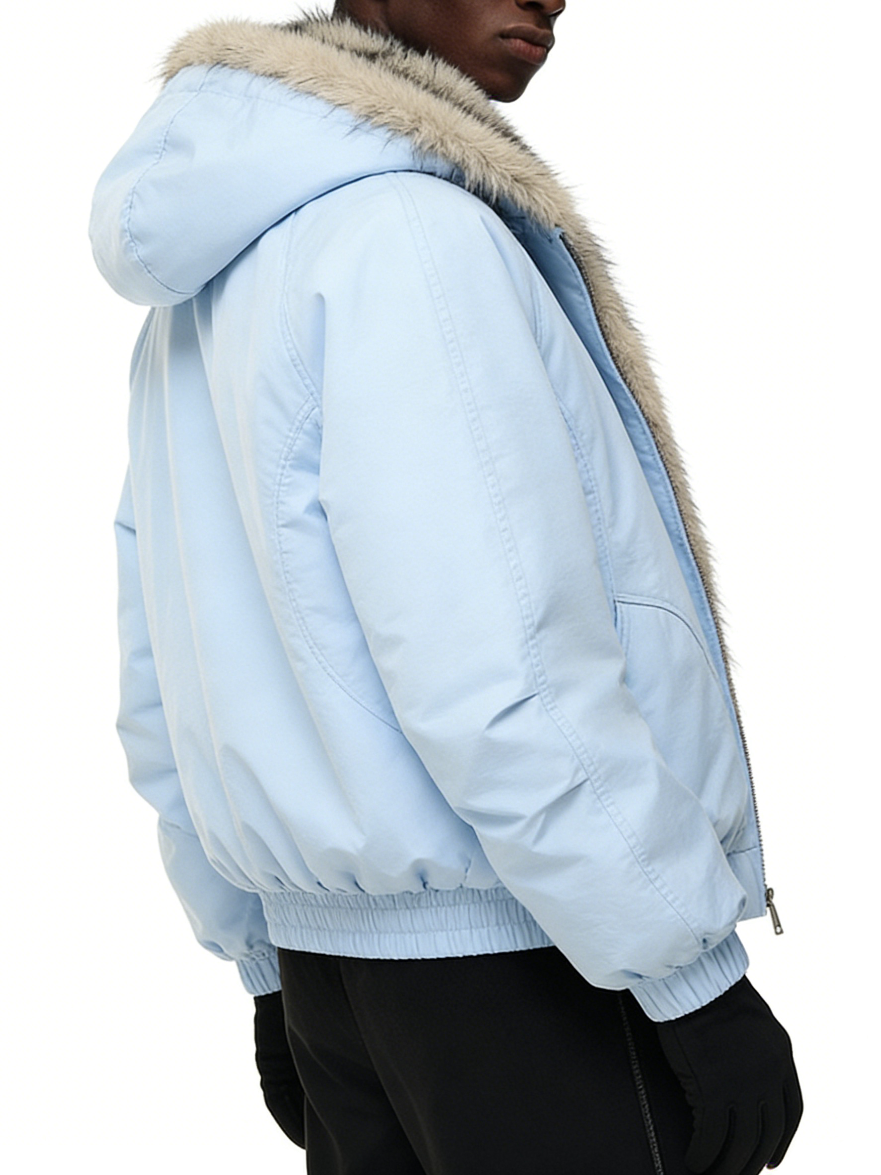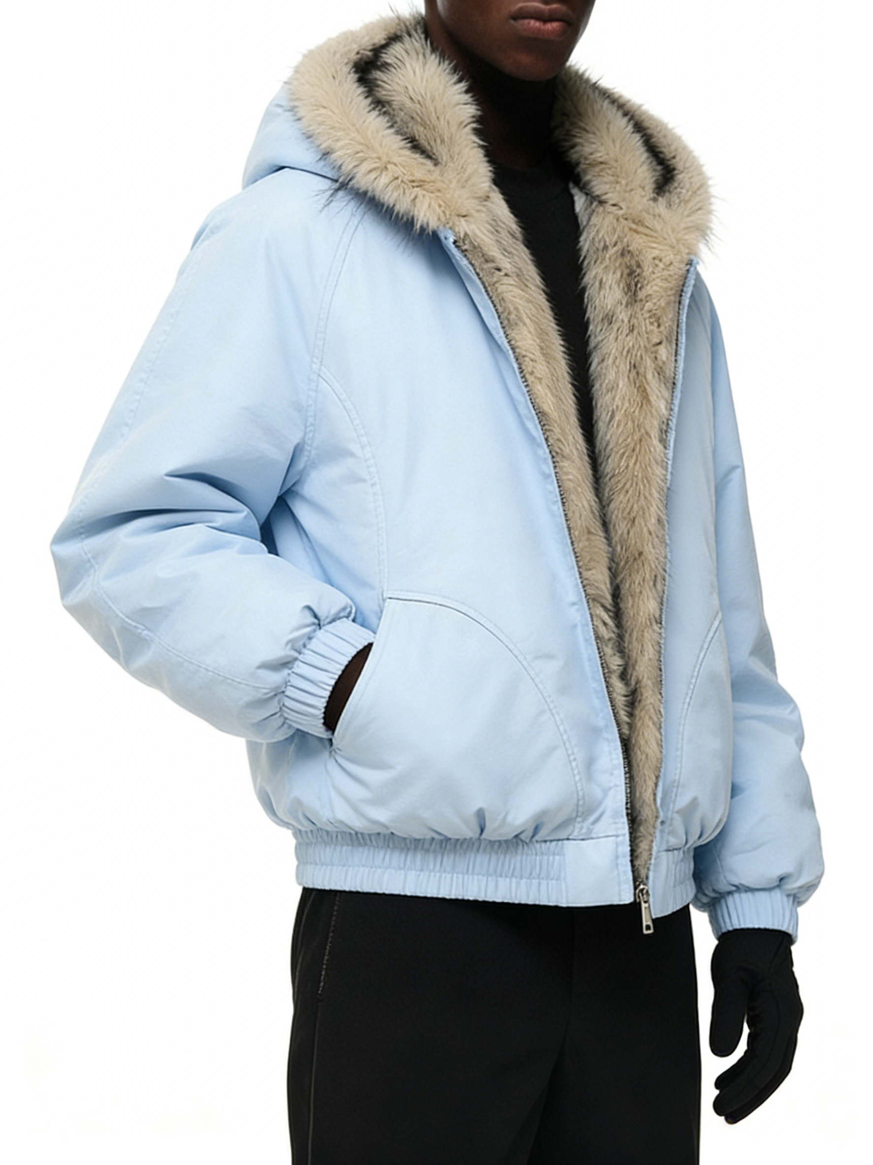 Technics: Hooded design with faux fur trim, front zipper closure, side pockets, elasticated hem and cuffs