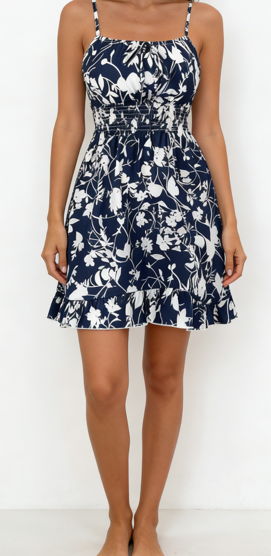 Embrace the romantic charm of summer in this navy blue floral spaghetti strap mini dress. Crafted from lightweight poly-cotton blend, it features a crisp white floral print and a tie-front ruched bust for a flattering, feminine look. The smocked elastic waist accentuates your curves, while the flared ruffle hem and side slit add movement and playfulness. Wear it with strappy sandals and a woven tote for a beach-ready look, or dress it up with block heels and pearl earrings for a brunch outfit. This dress is a timeless staple that combines comfort, romance, and effortless style.