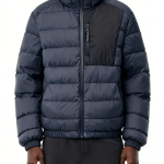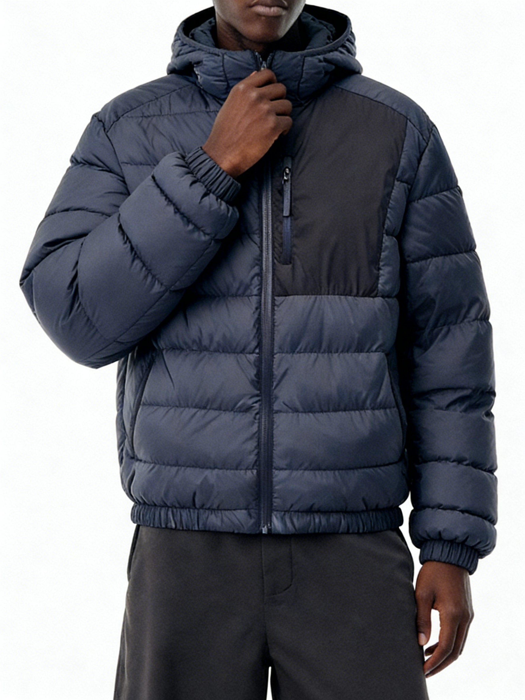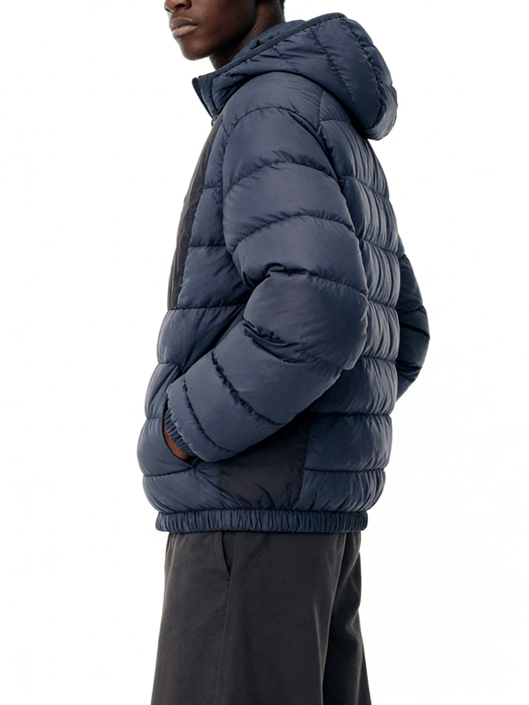Technics: Quilted construction, hooded design, front zipper closure, chest zipper pocket, side pockets, elasticated cuffs
