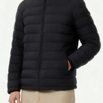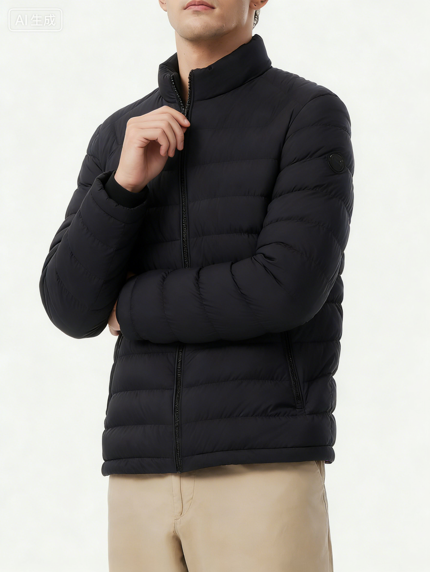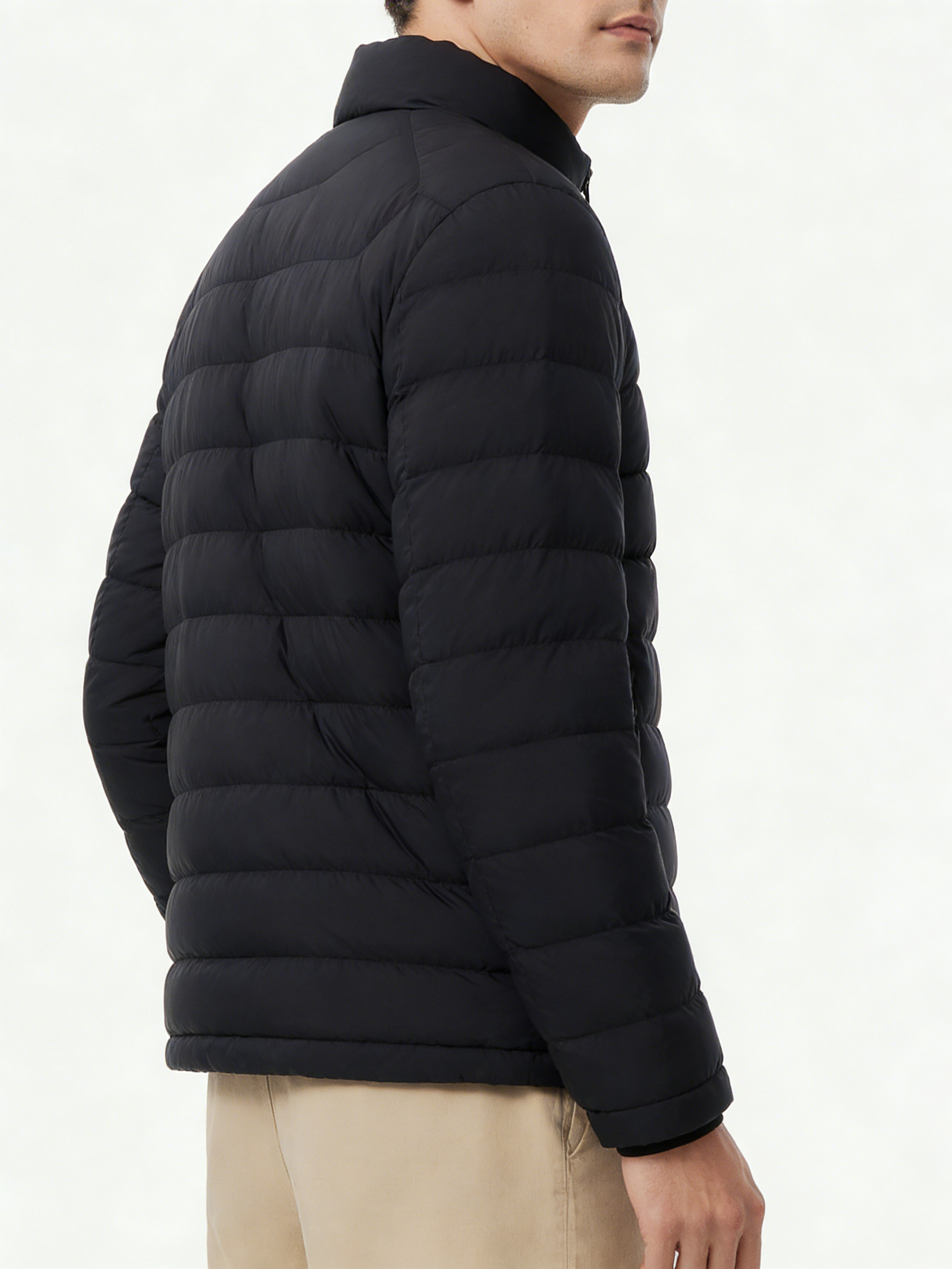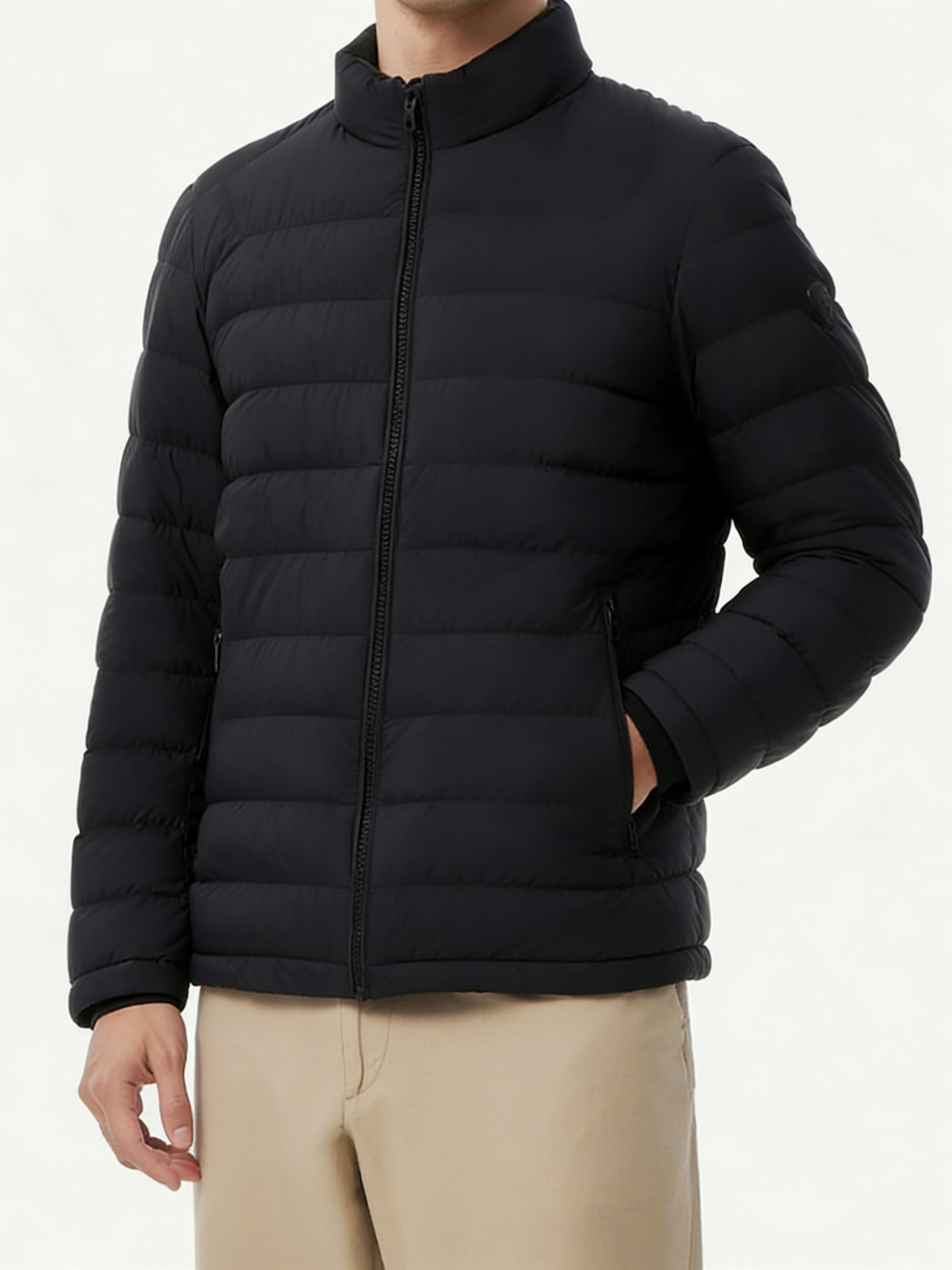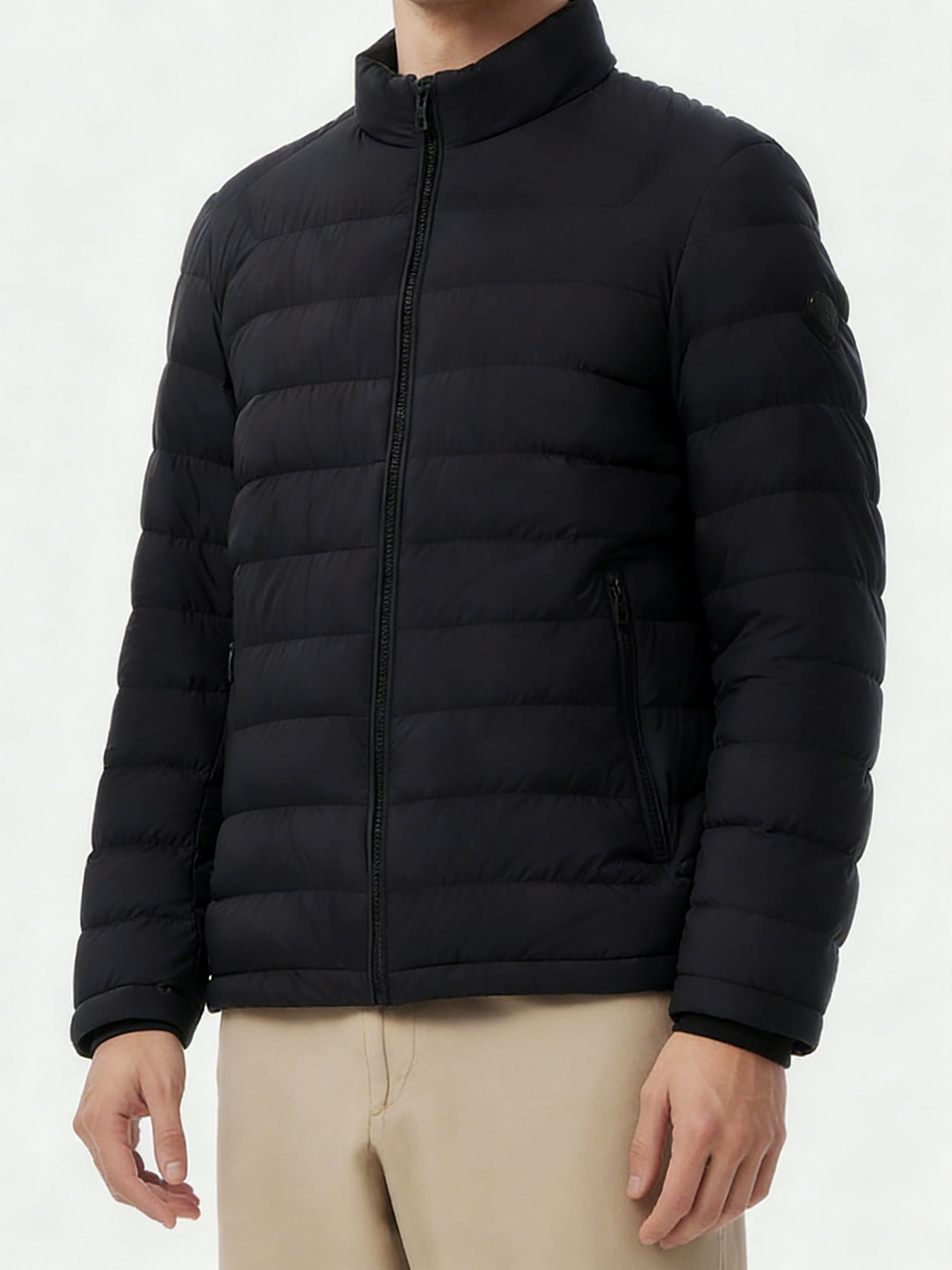 Technics: Horizontal-quilted construction, stand collar, front zipper closure, side zipper pockets, elasticated cuffs