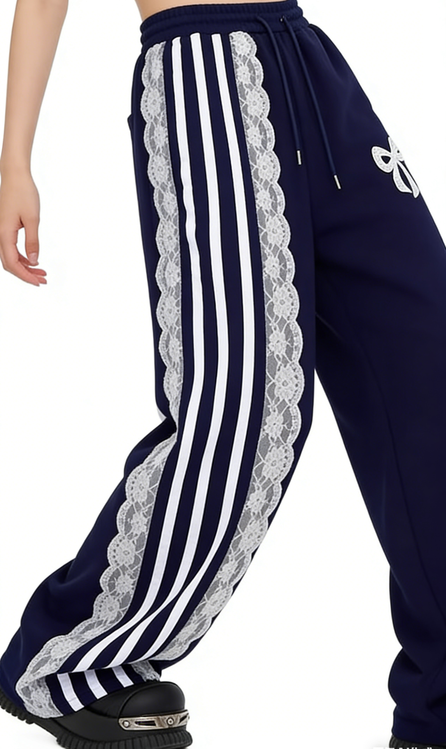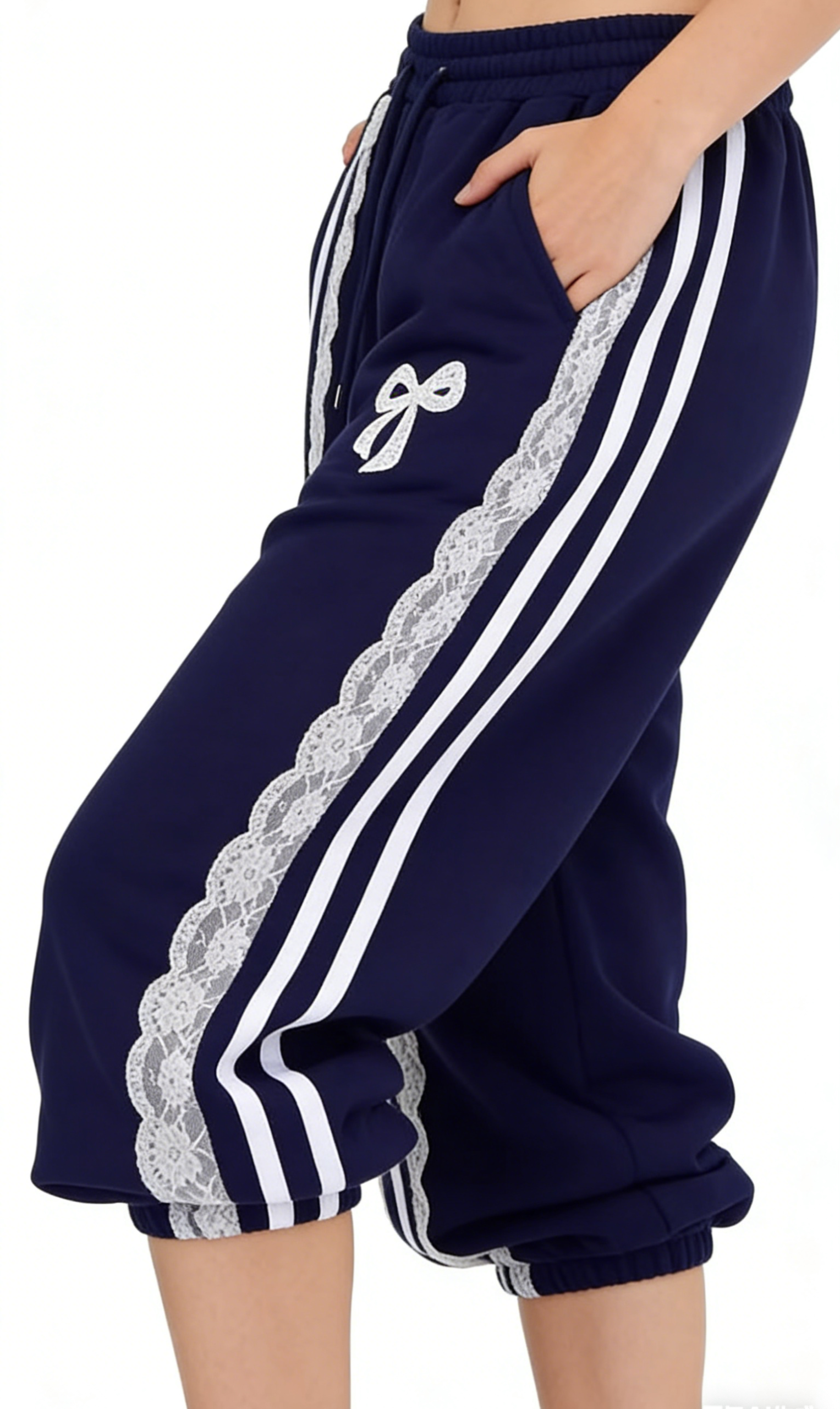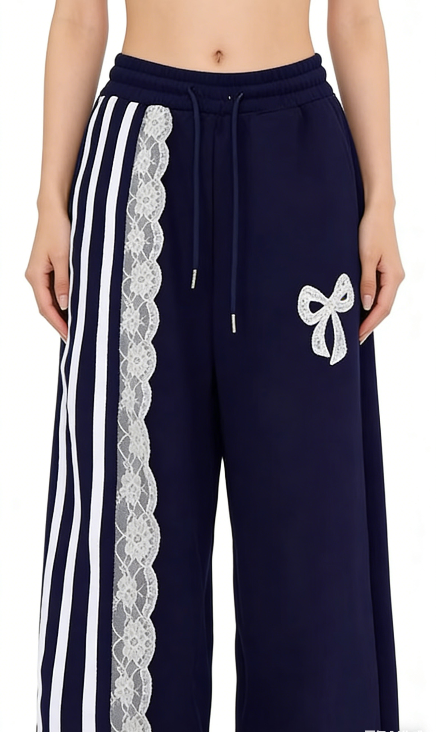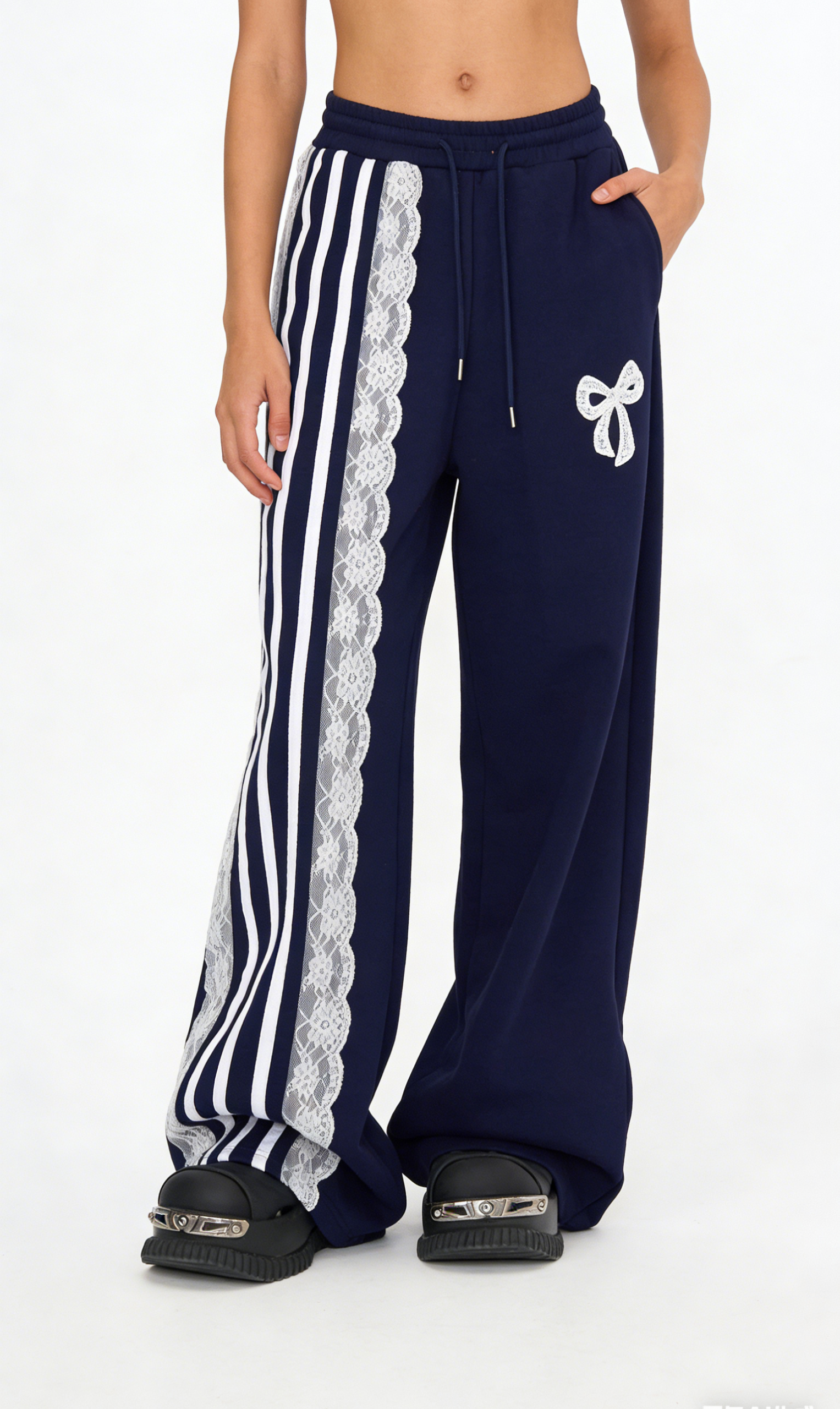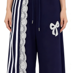 Add a cozy, coquette touch to your casual wardrobe with these navy blue lace bow wide-leg sweatpants. Crafted from soft fleece-lined fabric, they feature an oversized wide-leg silhouette, sporty white stripes, delicate lace trim, and a large bow embroidery. Perfect for loungewear or streetwear looks, pair them with a cropped hoodie and platform sneakers for a complete Y2K outfit, or with an oversized sweater and slippers for a cozy at-home vibe. These pants are a versatile staple that combines comfort, charm, and nostalgic style.