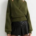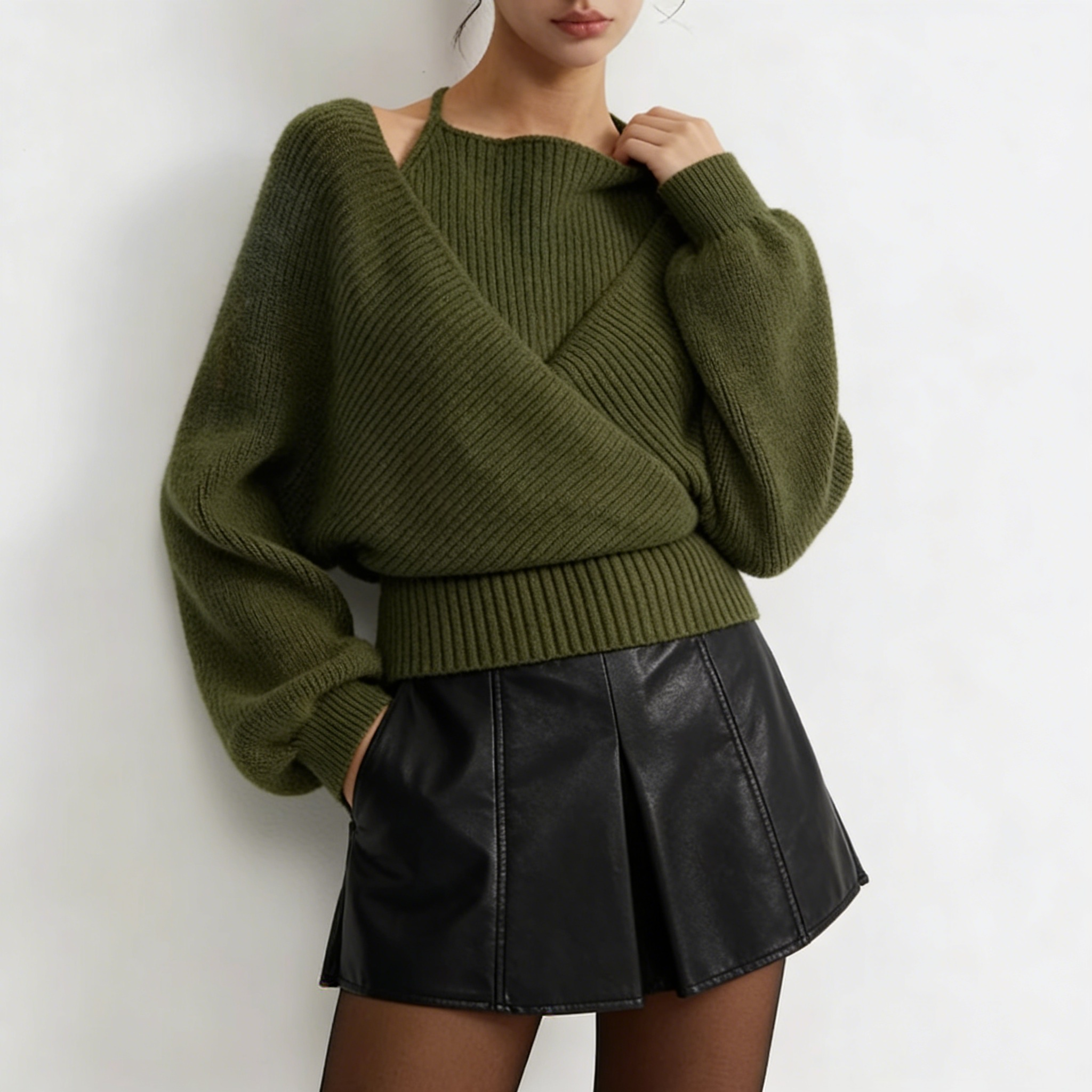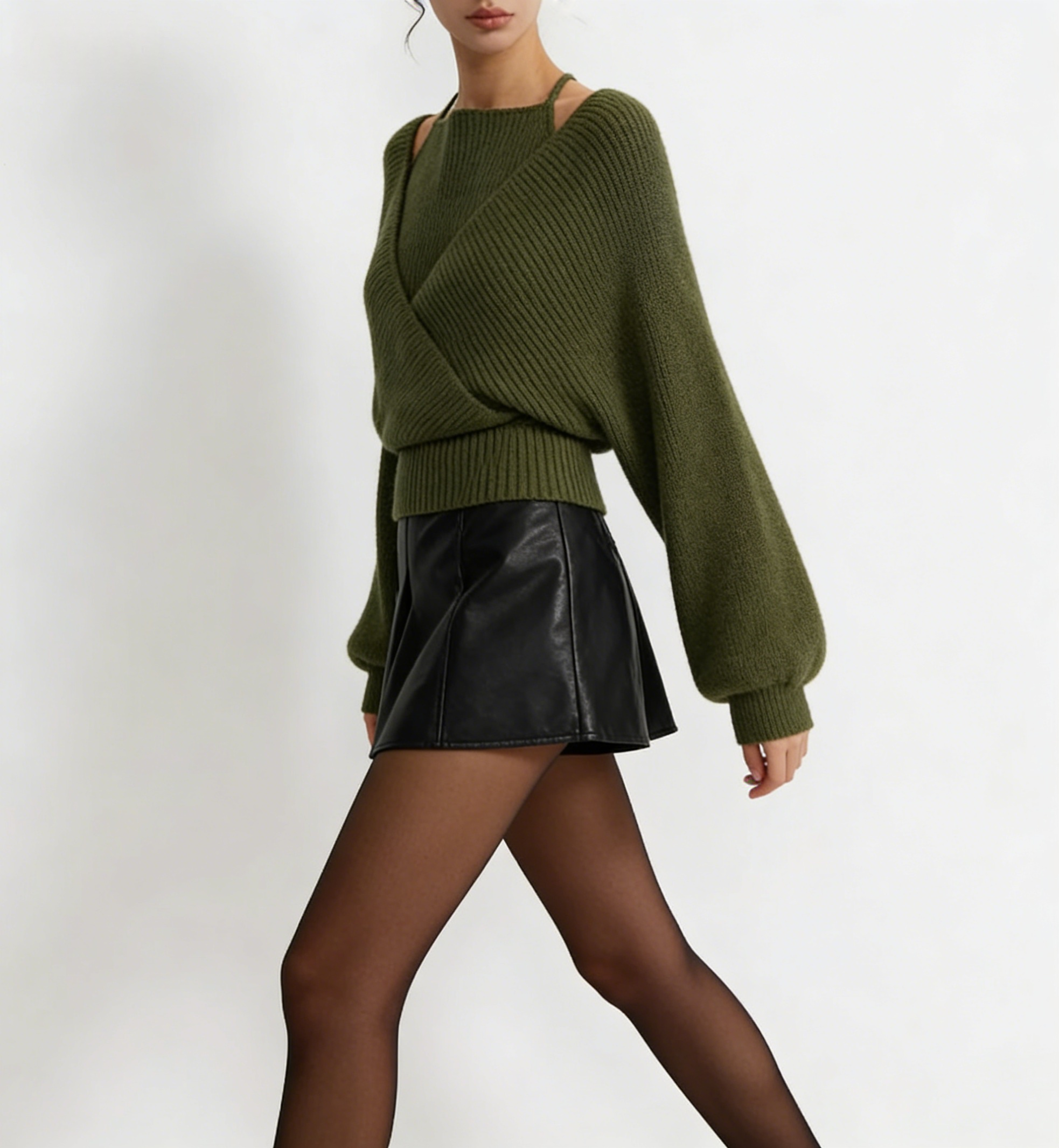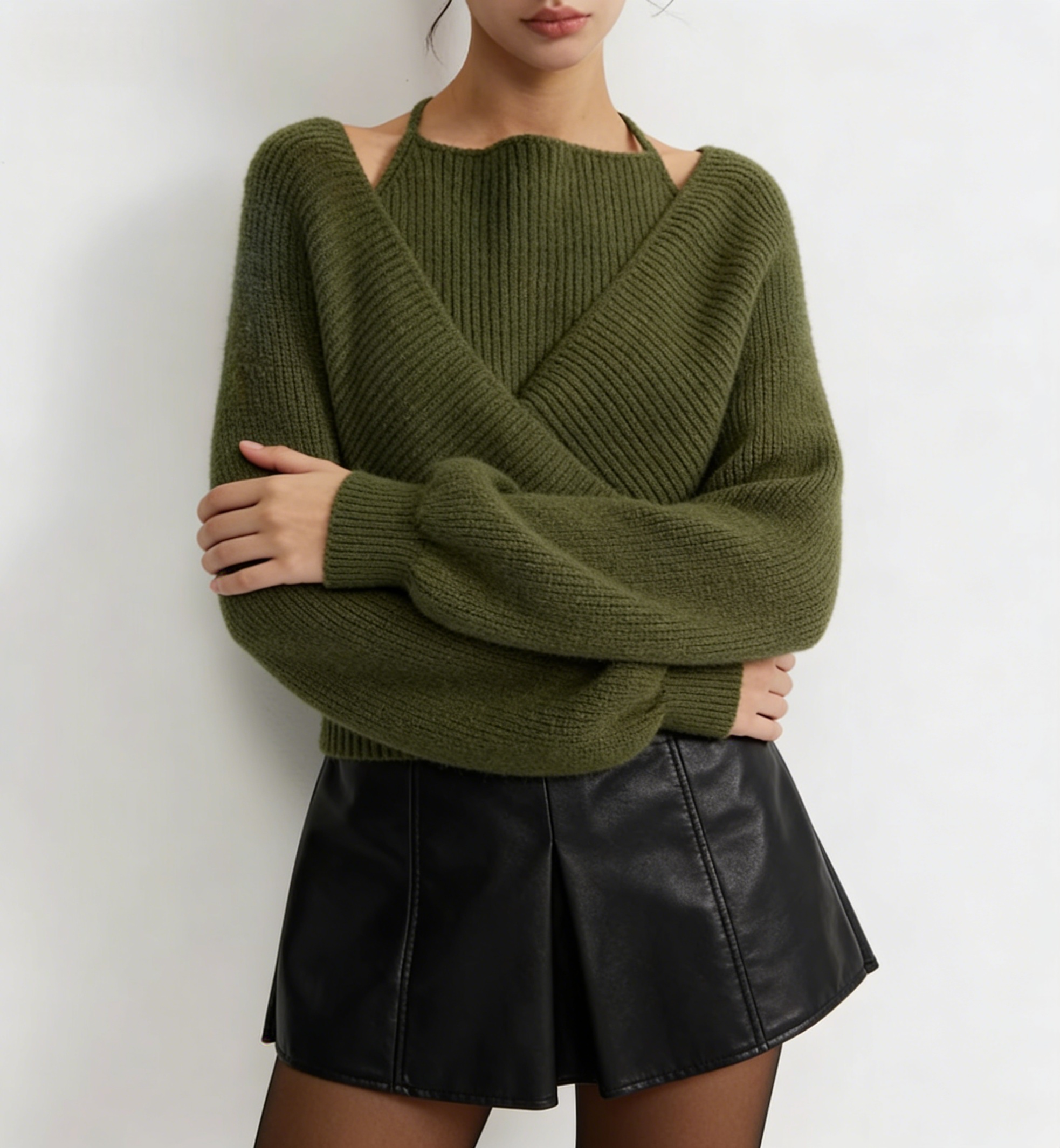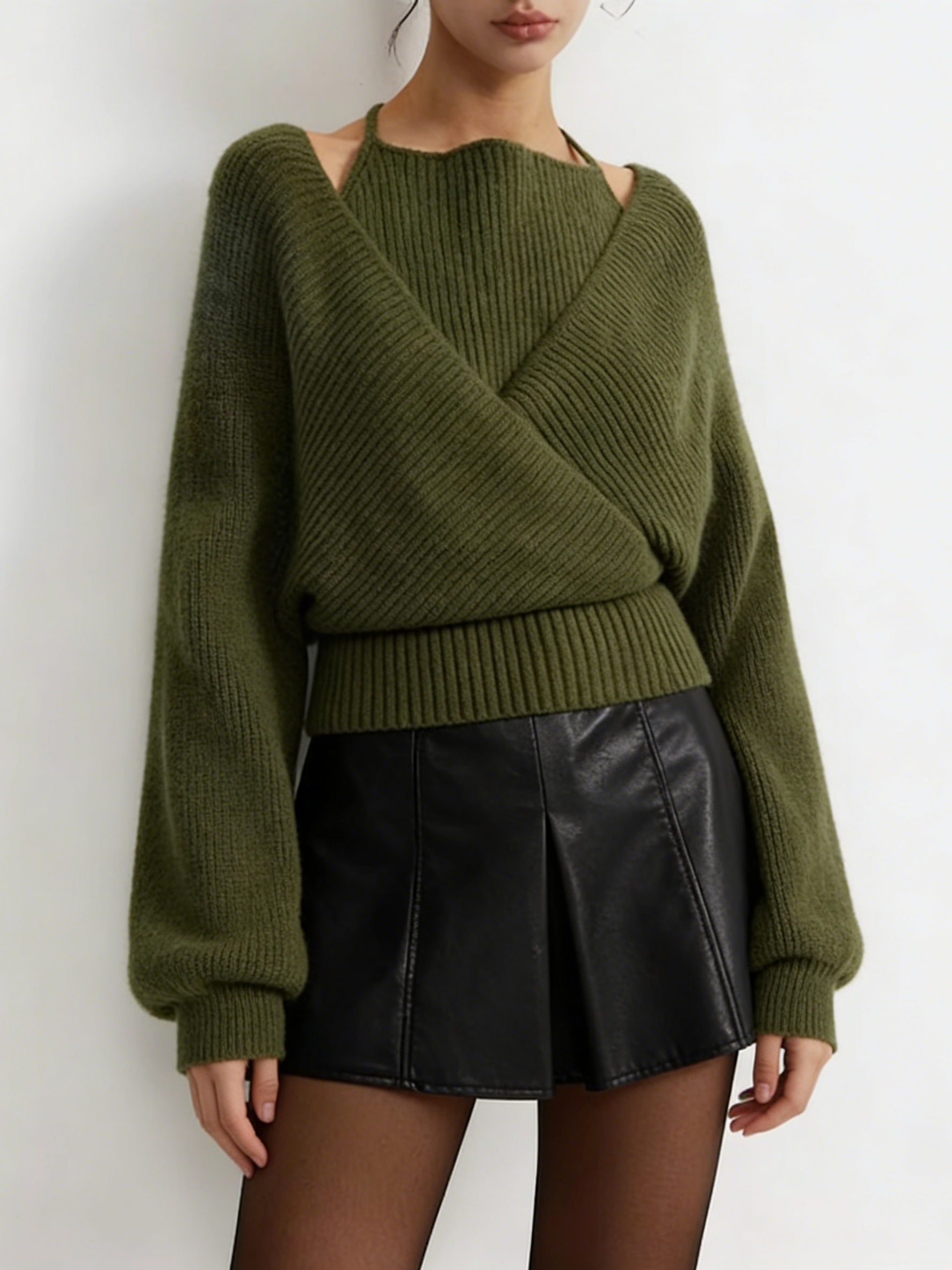 Olive Green Cutout Shoulder Wrap Front Rib-Knit Cropped Sweater