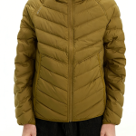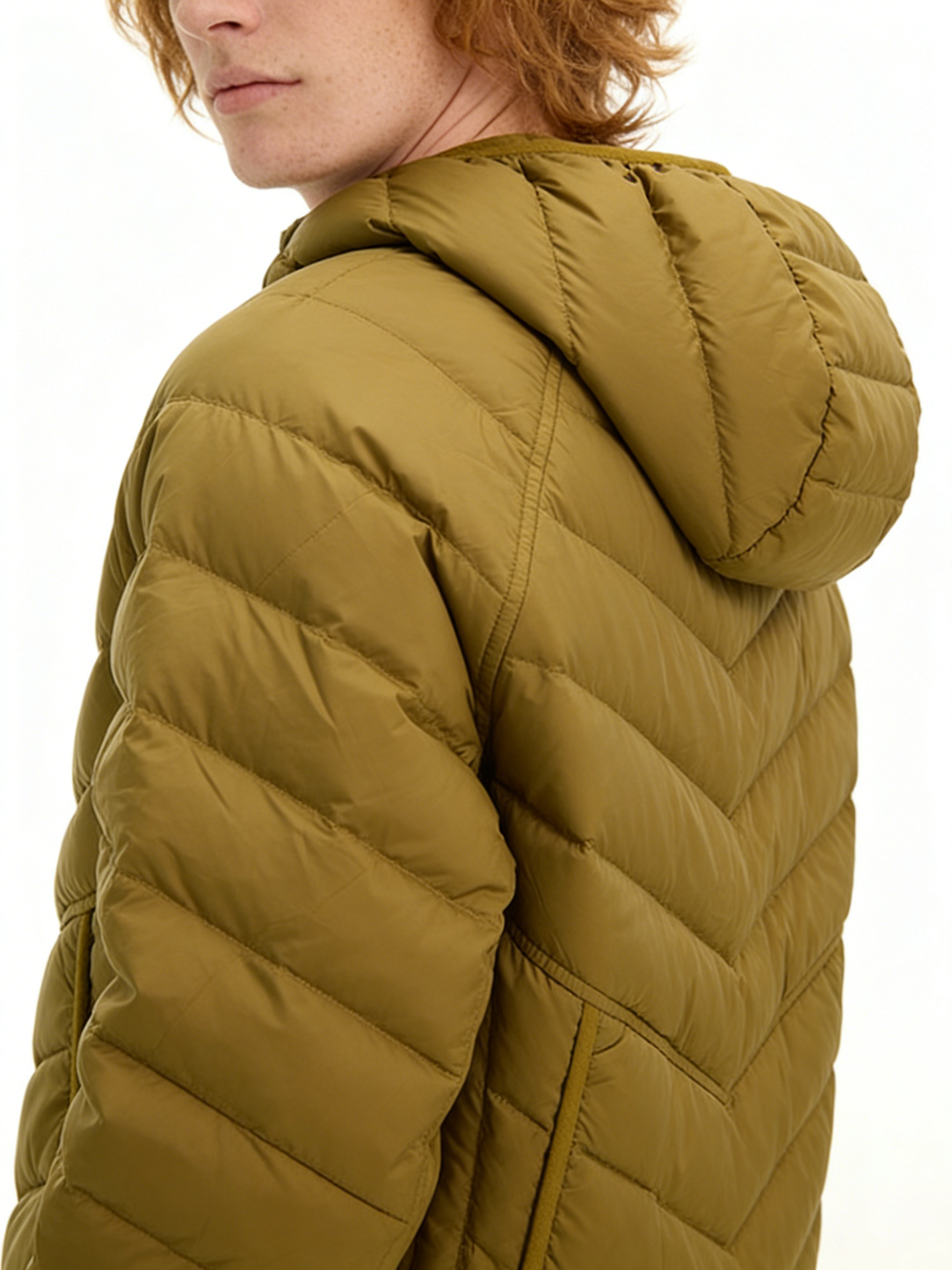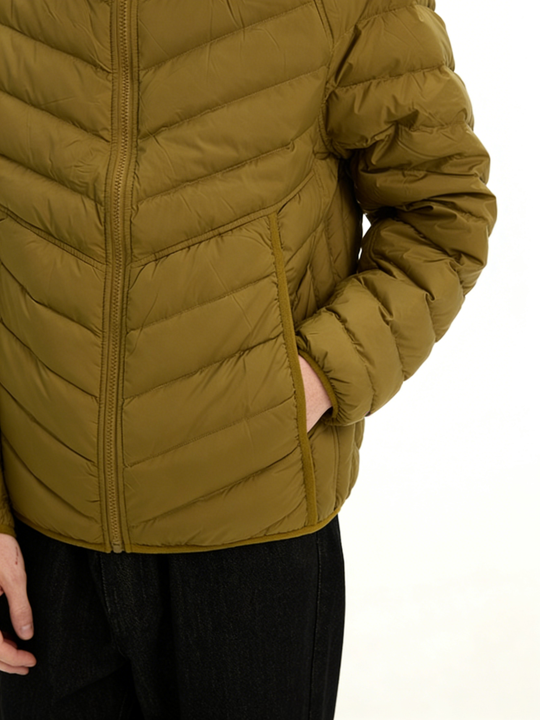 Technics: Chevron-quilted construction, hooded design, front zipper closure, side pockets, elasticated cuffs