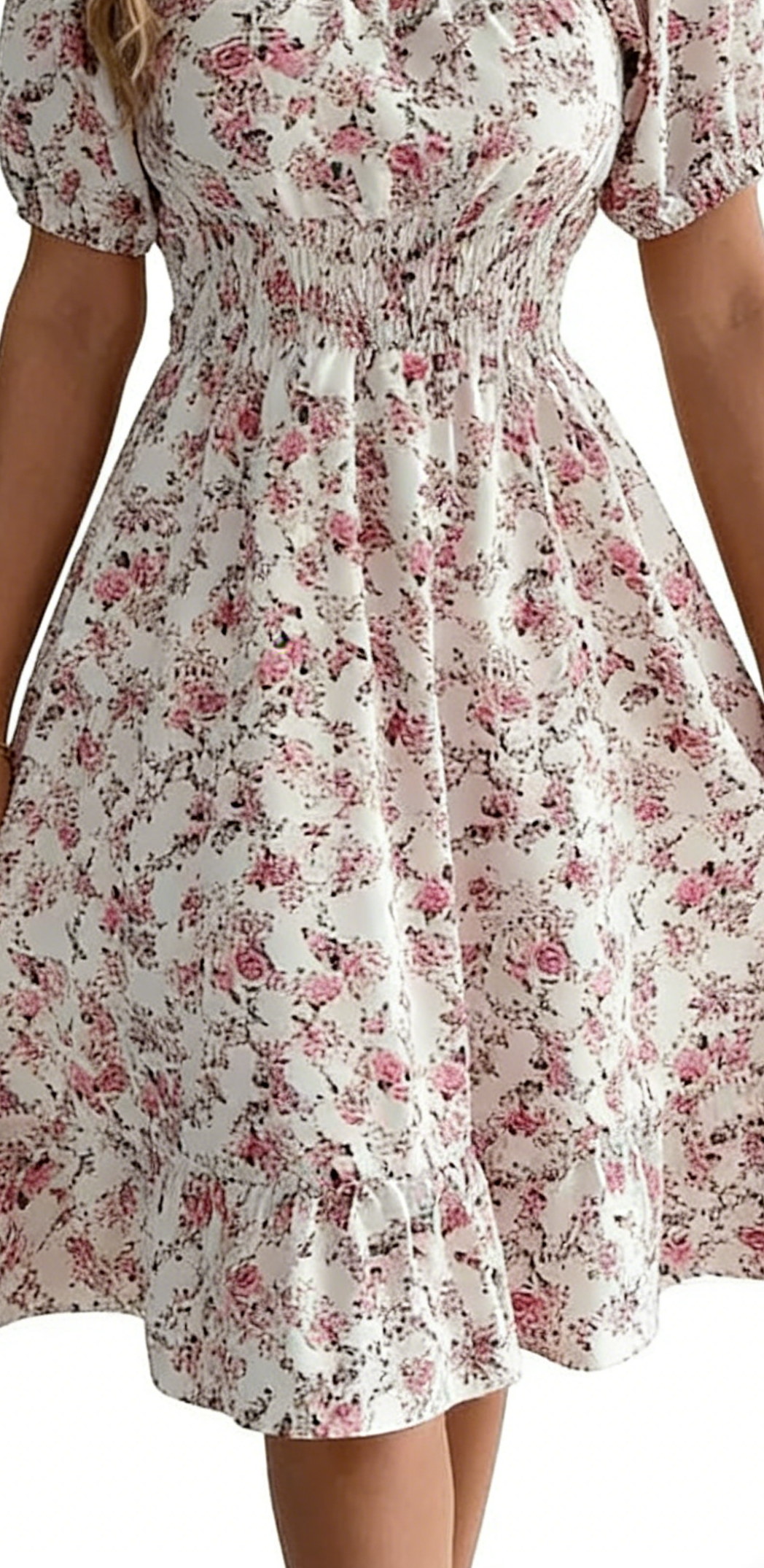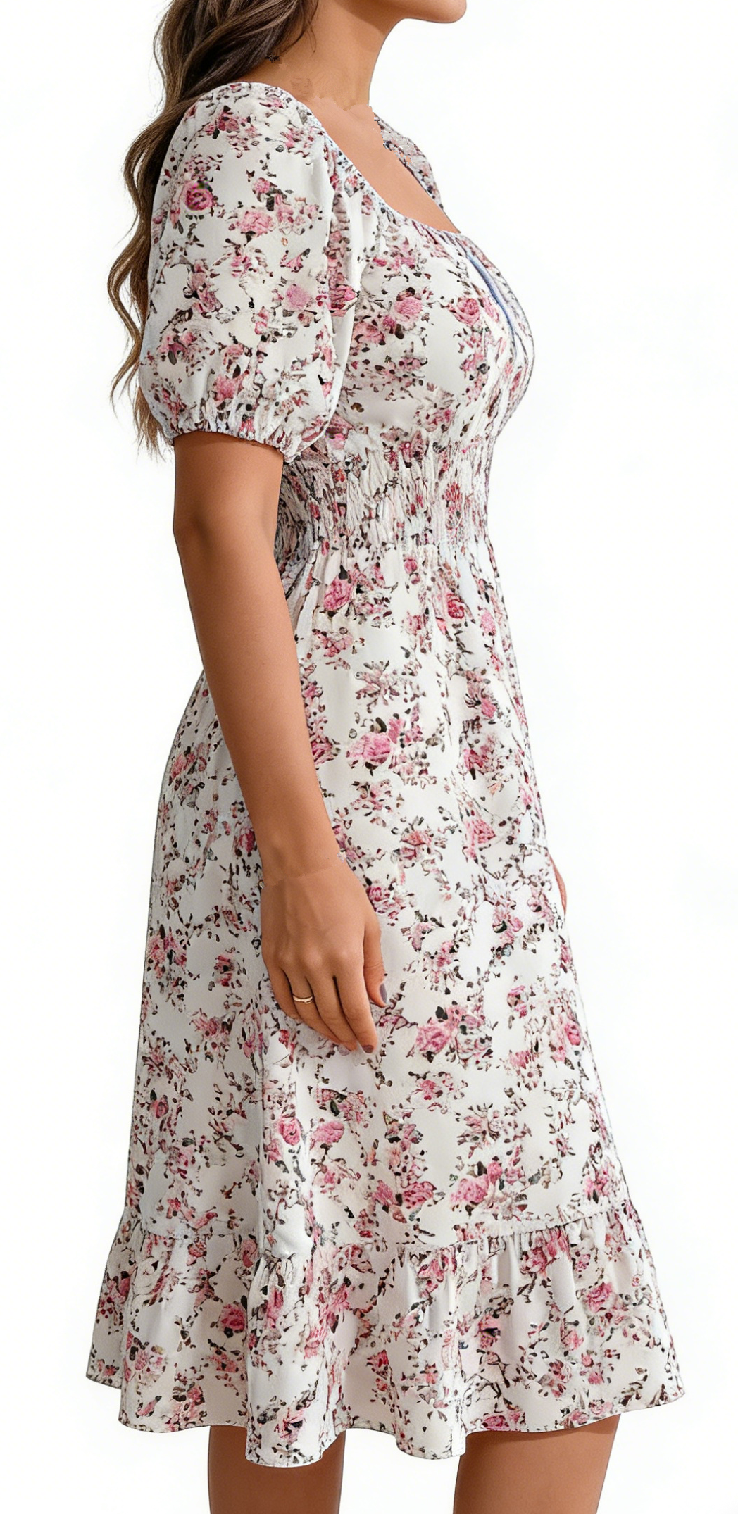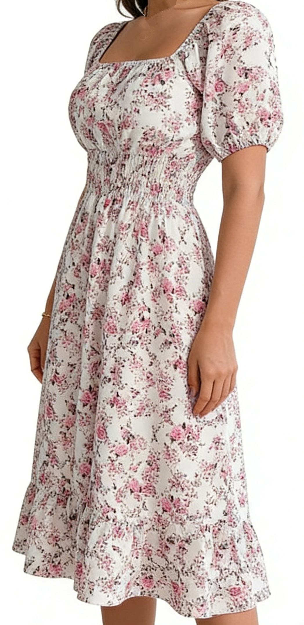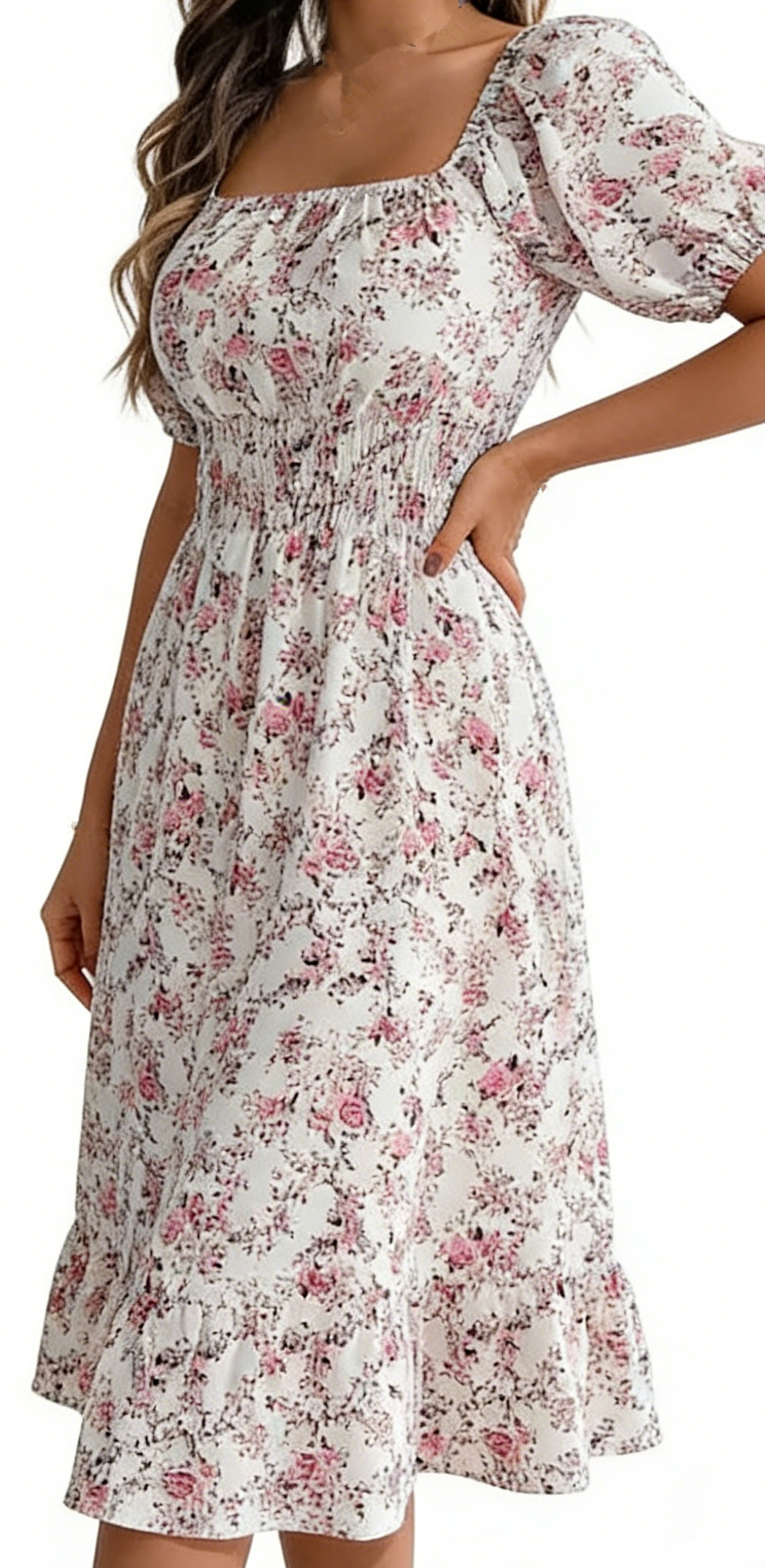 • Craftsmanship Technology: Square neckline, puff short sleeves, smocked elastic waist, flared A-line skirt, ruffle hem, delicate floral print