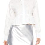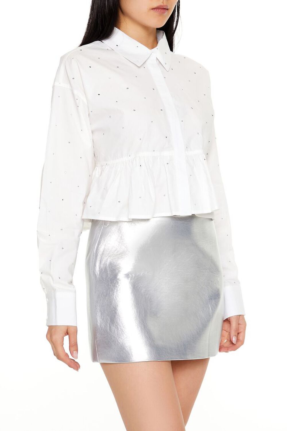 A poplin shirt featuring allover rhinestone embellishments, a basic collar, button-front closures, dropped long sleeves with buttoned cuffs, and cropped peplum hem.
