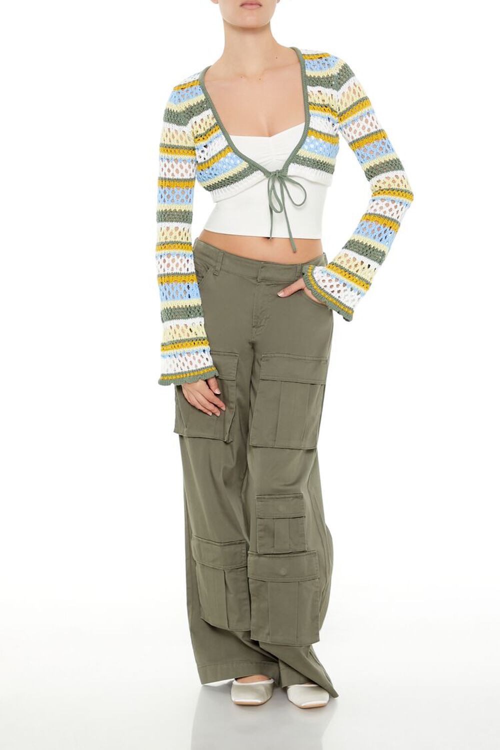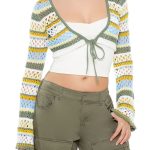 Details A marled knit cardigan sweater featuring ruffle and ribbed trim, long sleeves, self-tie closure, and a cropped hem. Content + Care – 80% polyester, 18% acrylic, 2% spandex – Hand wash cold Size + Fit – Model is 5’6″ and wearing a Small