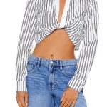 Details A knit top featuring an allover pinstriped pattern, basic collar, wrapped button-front closures, long sleeves, and cropped hem. Content + Care – 72% rayon, 21% nylon, 4% other fibers, 3% spandex – Hand wash cold Size + Fit – Model is 5’9″ and wearing a Small