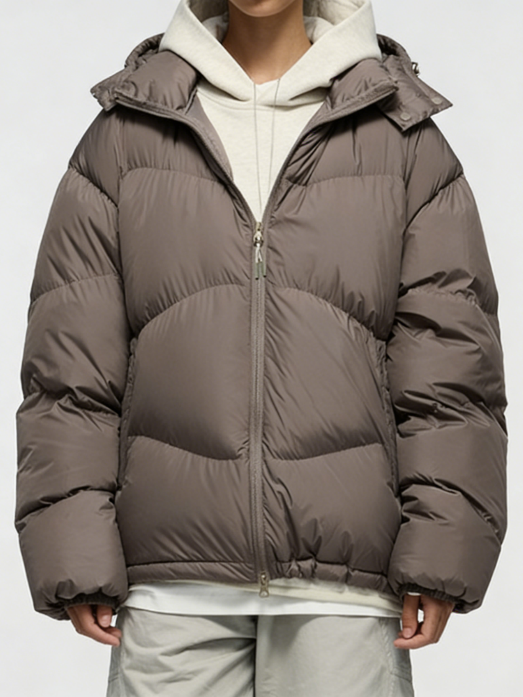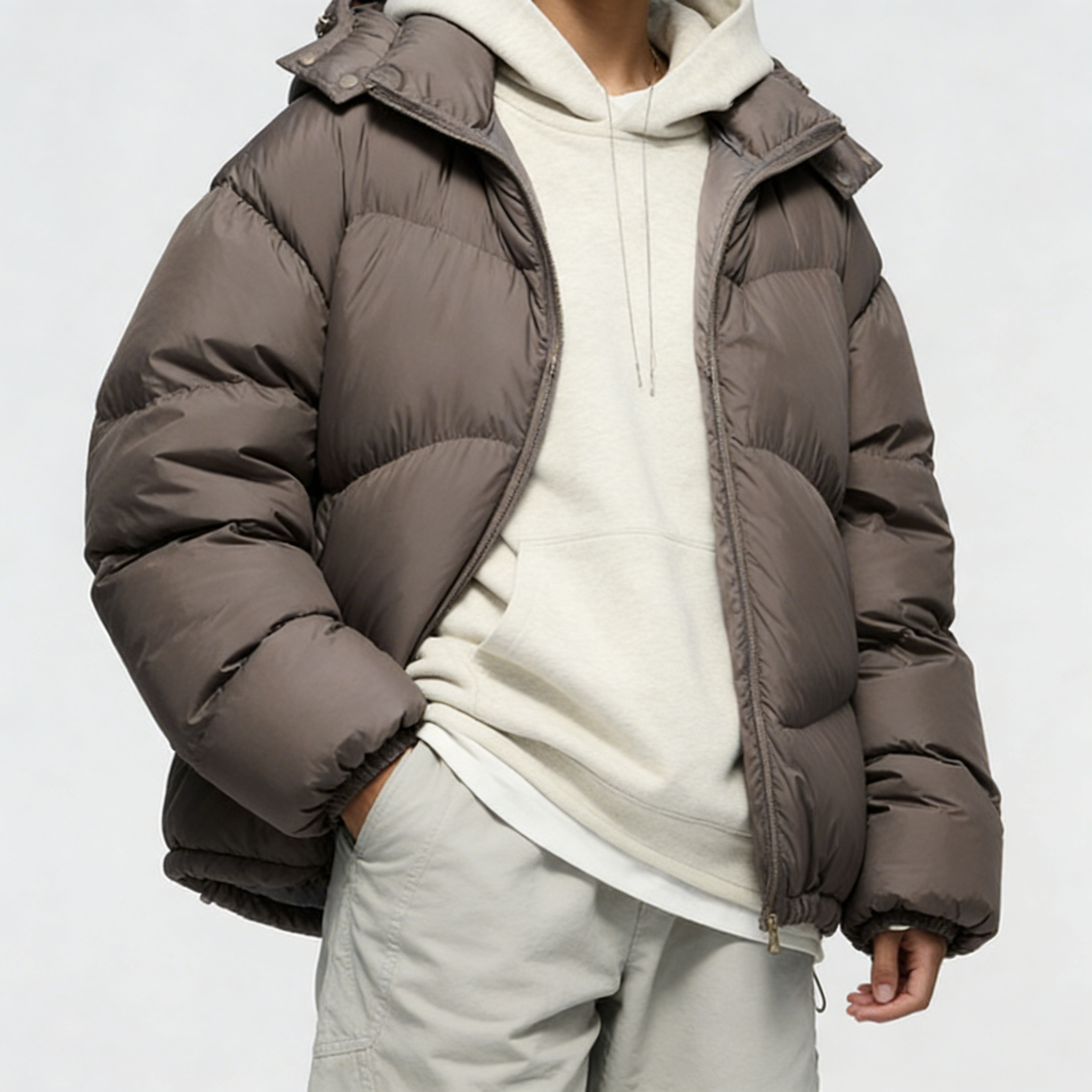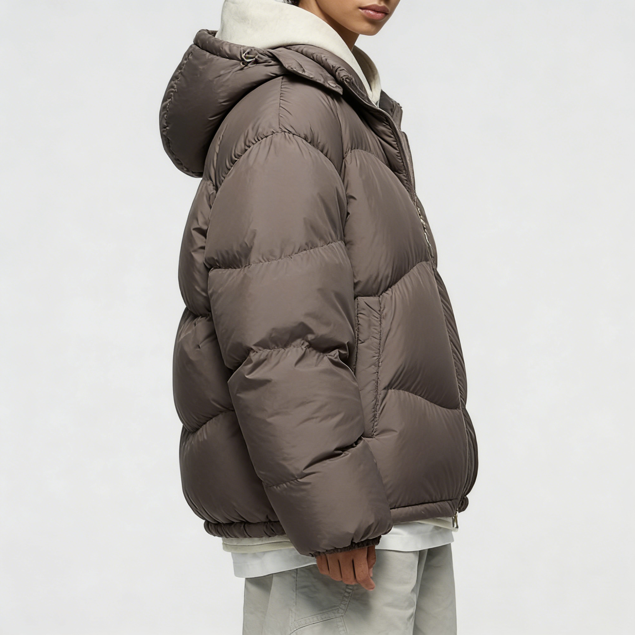 Technics: Oversized quilted construction, hooded design, front zipper closure, side pockets, elasticated cuffs