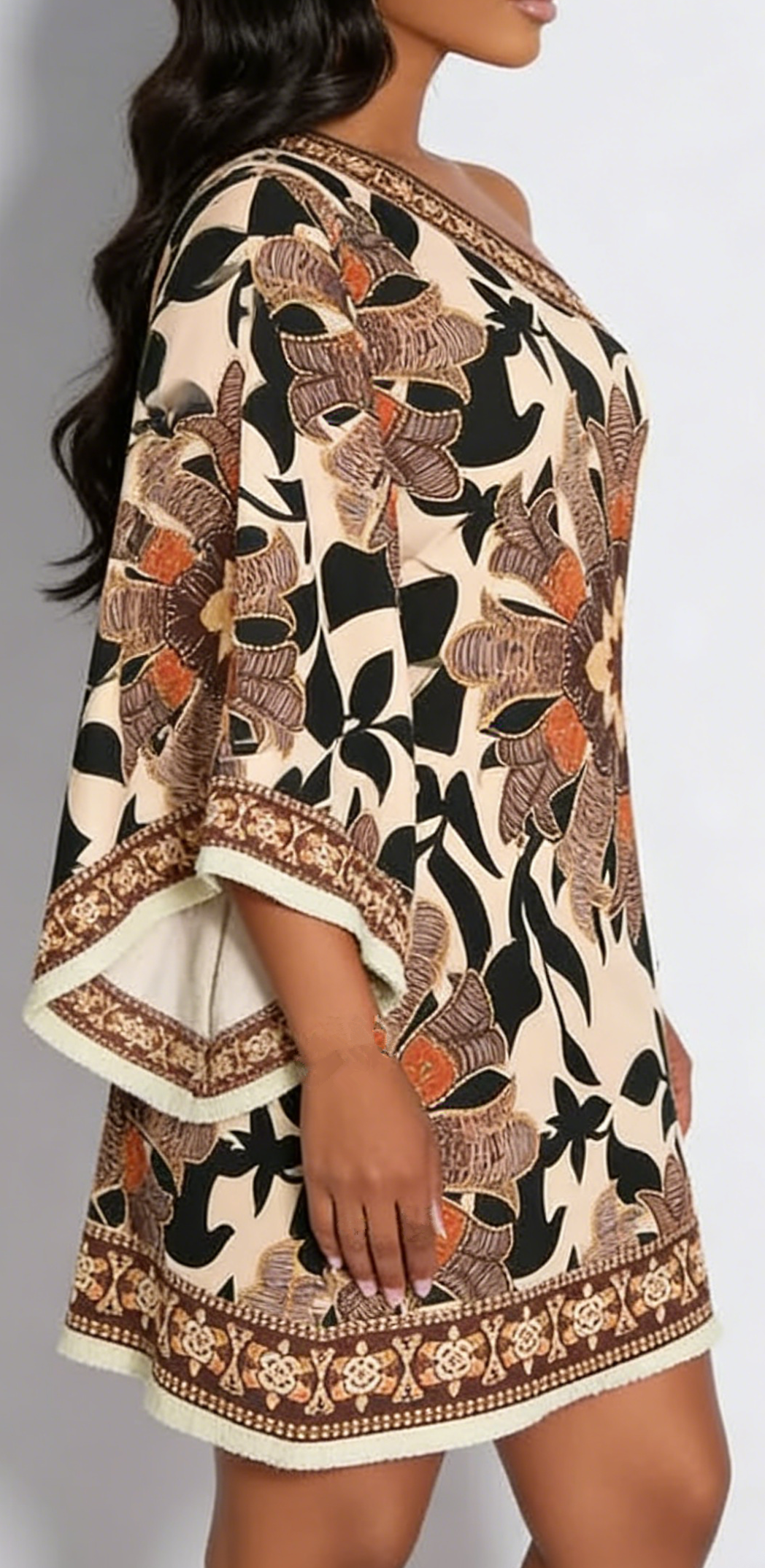 - Craftsmanship Technology: One-shoulder neckline with decorative tribal border, flowy bell sleeve, A-line mini skirt, raw frayed hem, bold tribal floral print