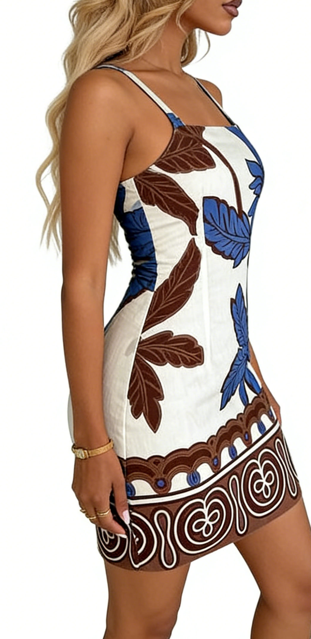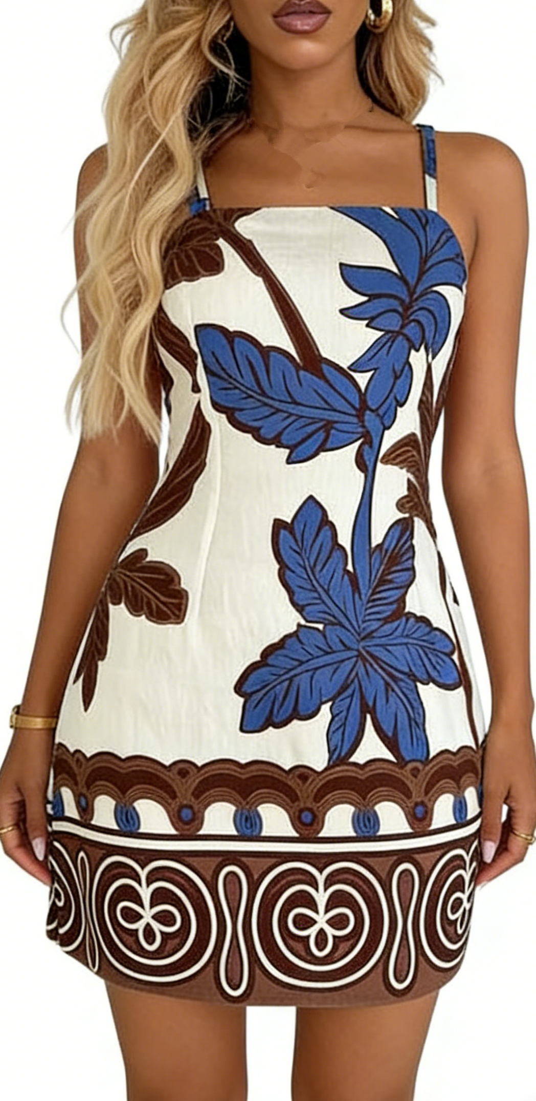 Embrace the carefree spirit of summer in this tropical leaf print spaghetti strap mini dress. Crafted from lightweight cotton blend, it features a bold blue palm leaf print and a retro geometric border at the hem, evoking a boho vacation aesthetic. The square neckline and adjustable spaghetti straps create a modern, flattering fit, while the bodycon silhouette accentuates your curves. Wear it with strappy sandals and a straw tote for a beach-ready look, or layer it under a denim jacket for a casual weekend outfit. This dress is a must-have staple that combines comfort, style, and tropical charm.