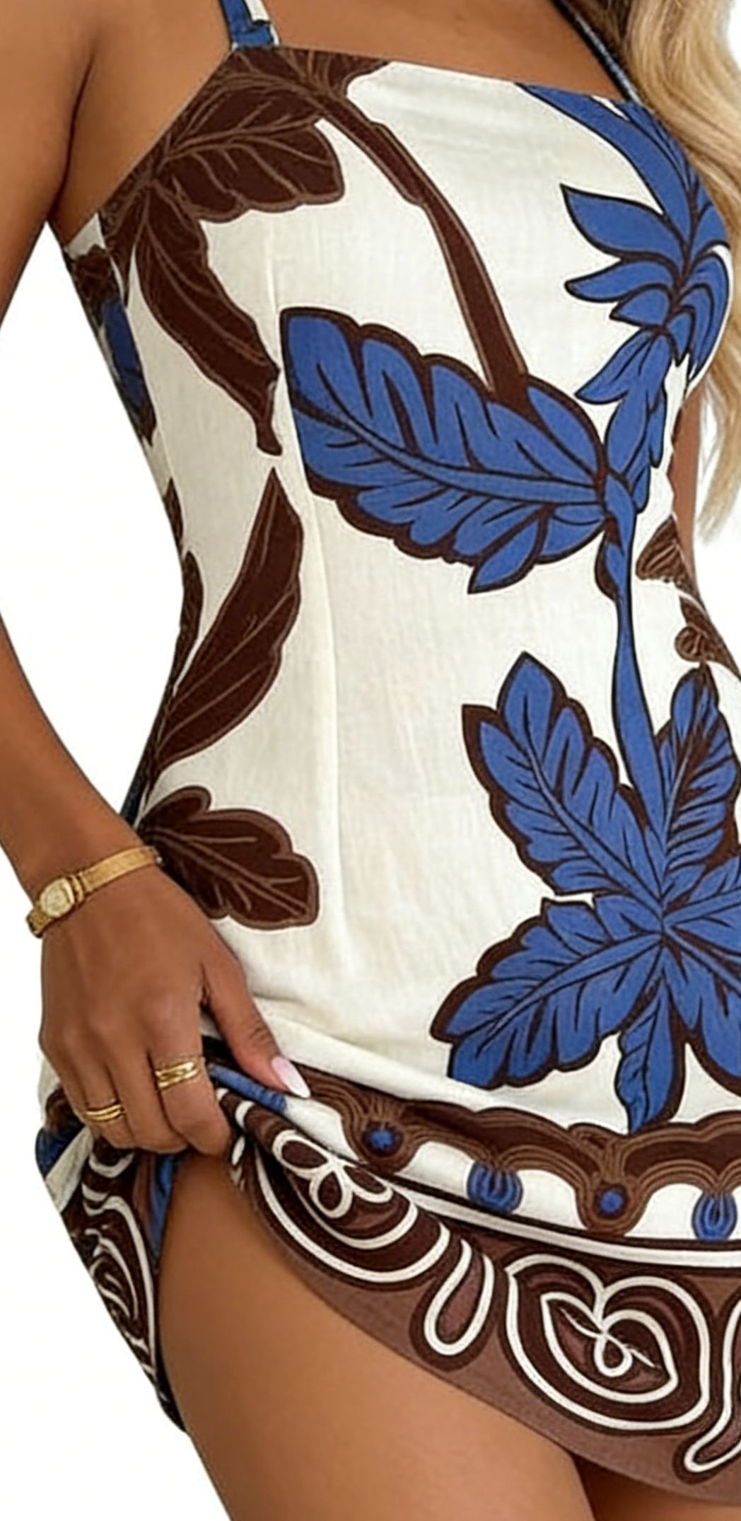 • Printing Method: Vibrant tropical leaf print (blue palm leaves + brown botanical motifs) with geometric border at hem