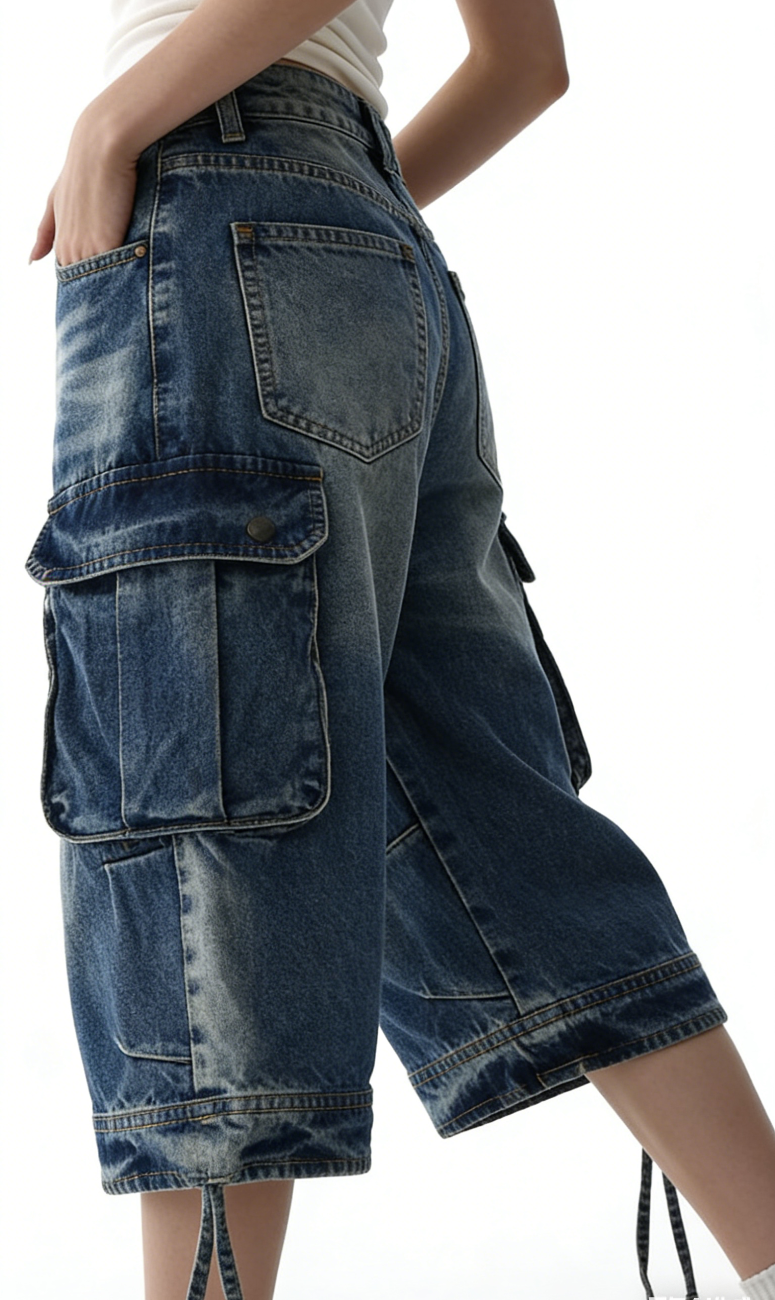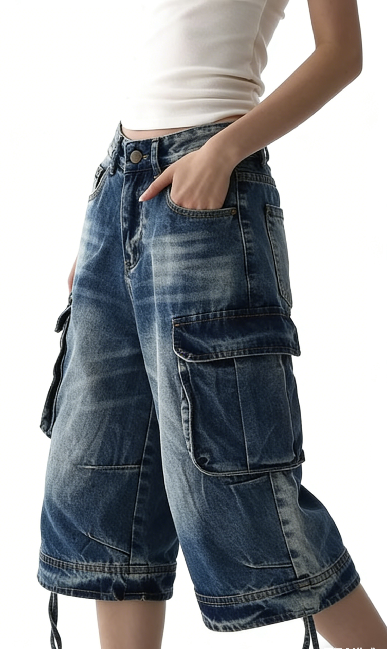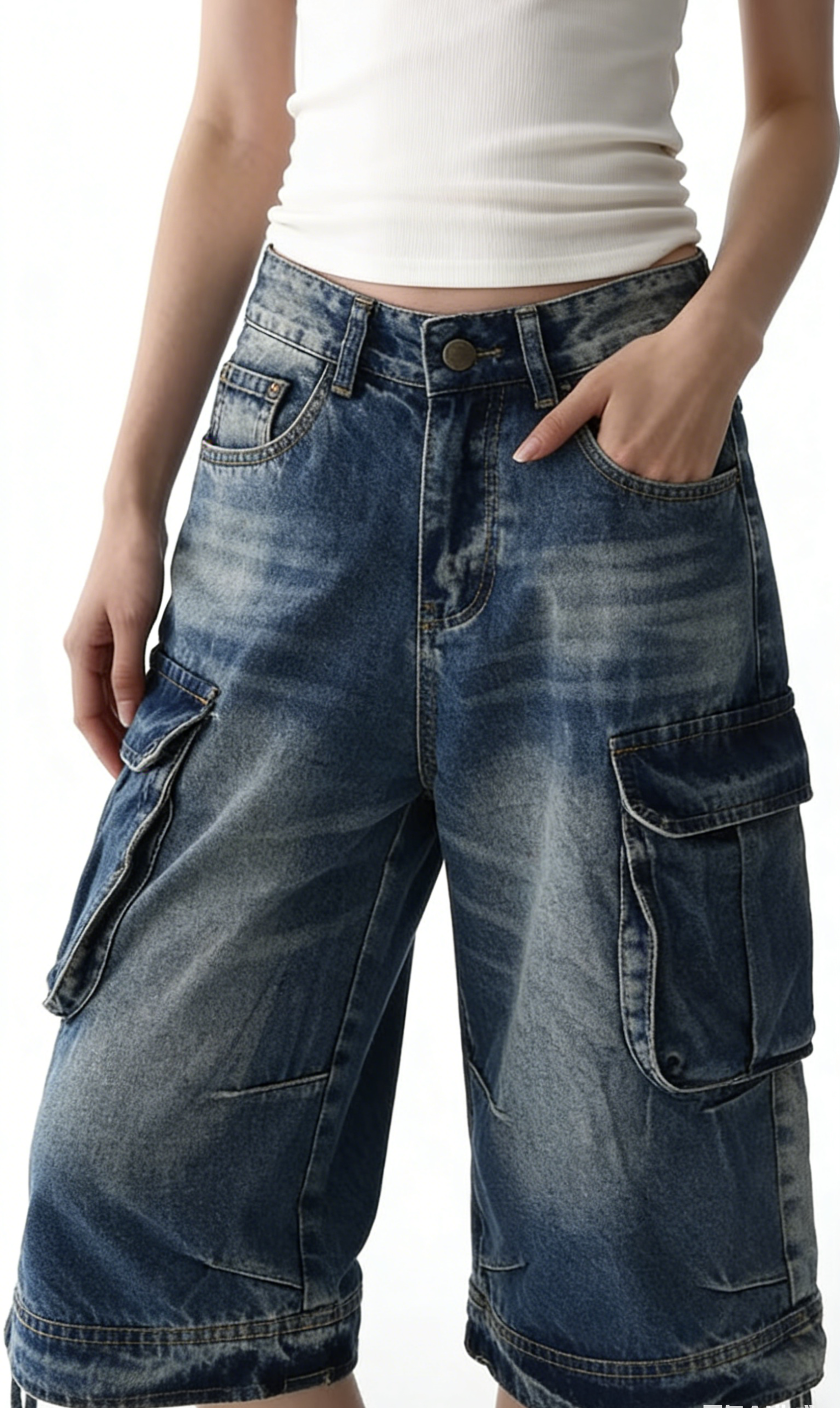 Elevate your casual wardrobe with these vintage wash high-waisted cargo denim shorts. Crafted from heavyweight denim with a classic vintage wash, they feature an oversized wide-leg silhouette, utility cargo pockets, and a knee-length cut. Perfect for streetwear or Y2K-inspired looks, pair them with a cropped baby tee and platform sneakers for a complete retro outfit, or with an oversized hoodie and chunky sneakers for a cozy fall vibe. These shorts are a versatile staple that combines comfort, utility, and nostalgic style.